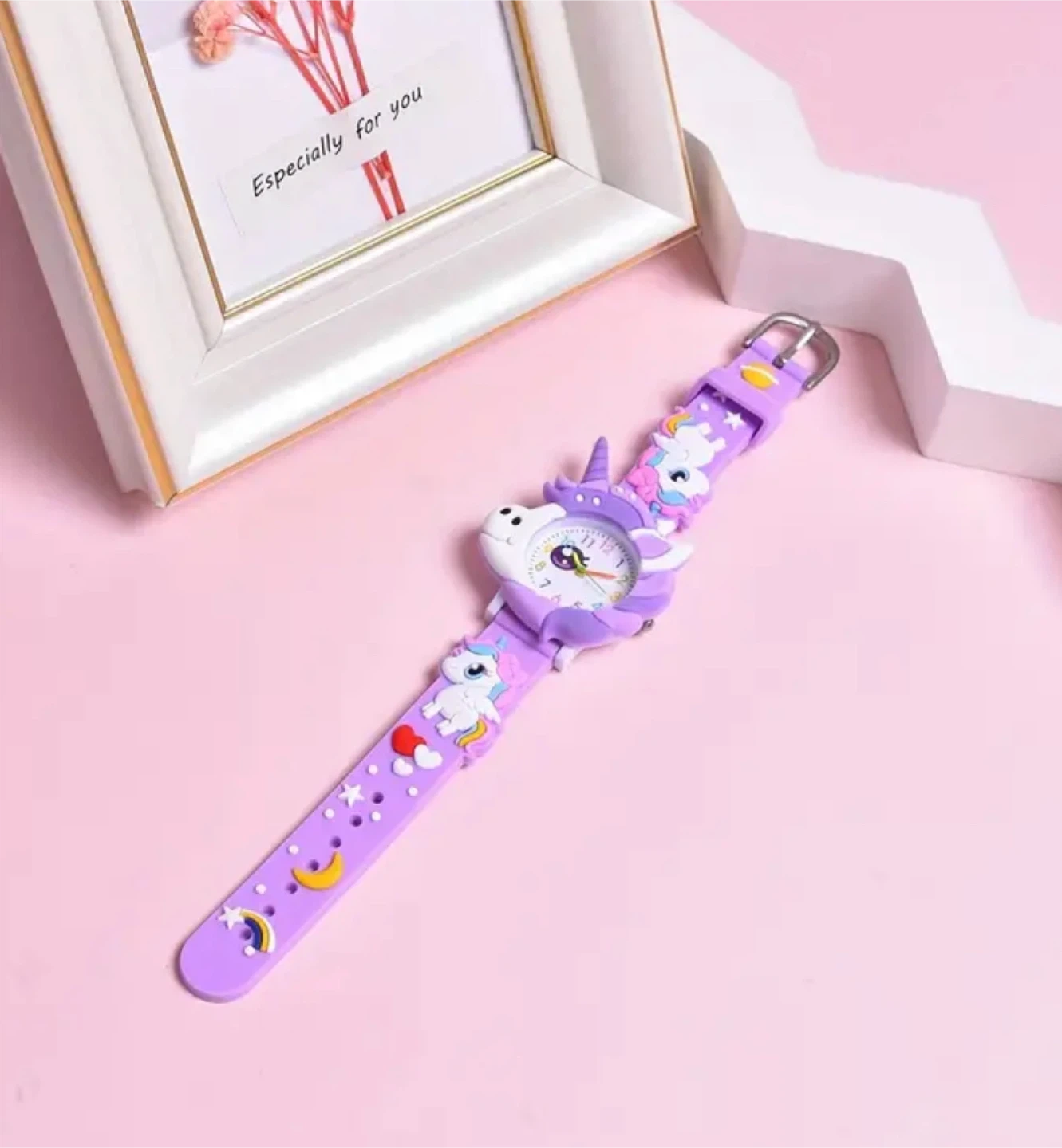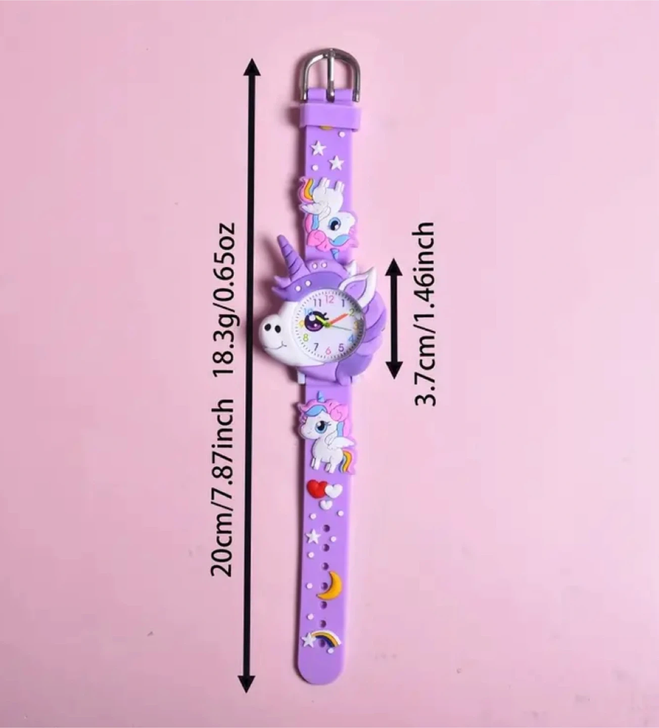 Super cute purple unicorn watch for kids! The band is decorated with unicorn and star designs. It's brand new and ready for a new wrist! Dimensions are approximately 20cm/7.87inch in length and 3.7cm/1.46inch in diameter.