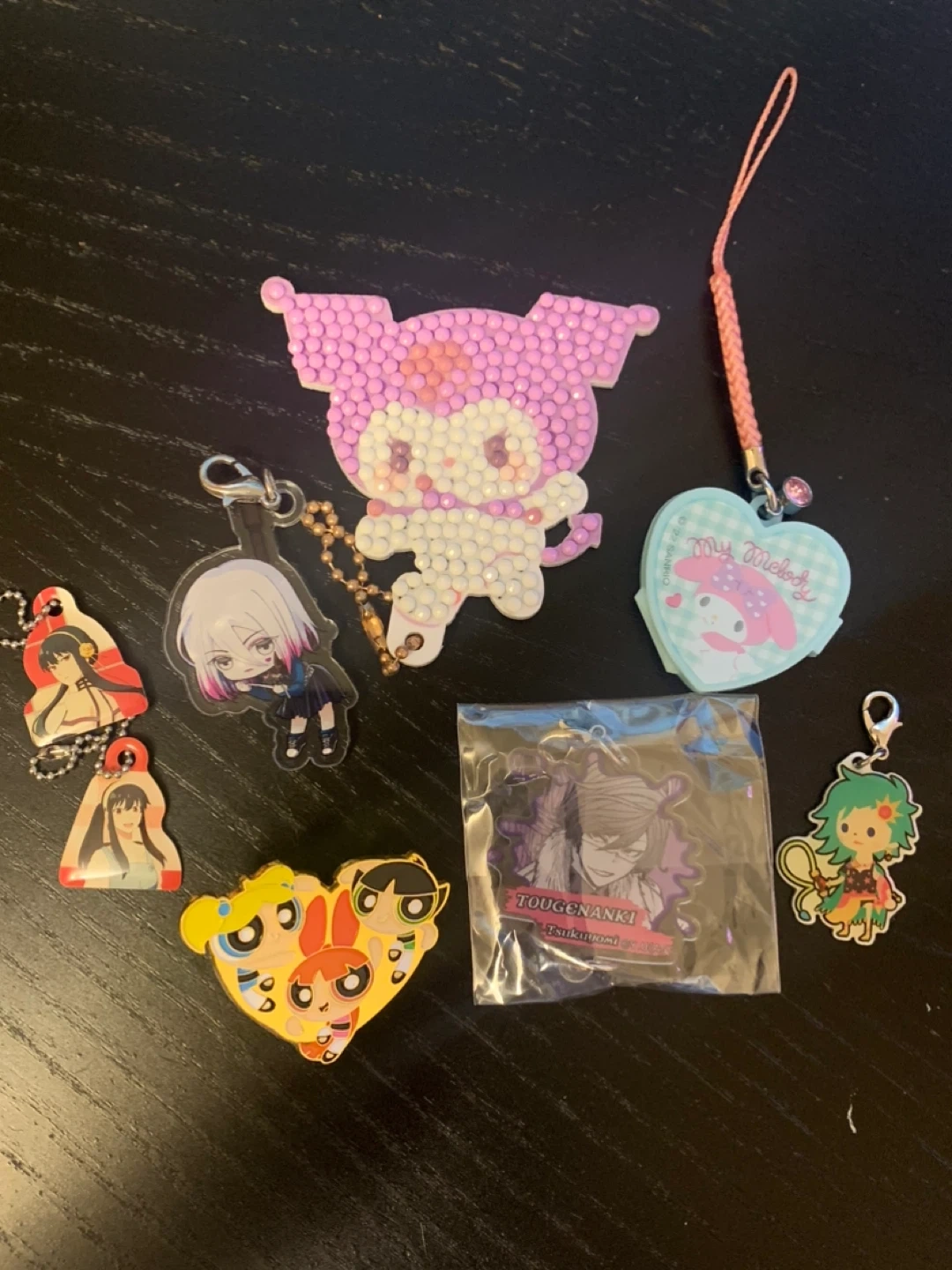 Selling a bunch of cute anime keychains! There's a bedazzled Kuromi, a My Melody heart, Powerpuff Girls, and others from different anime series. Perfect for adding some flair to your bag or keys!