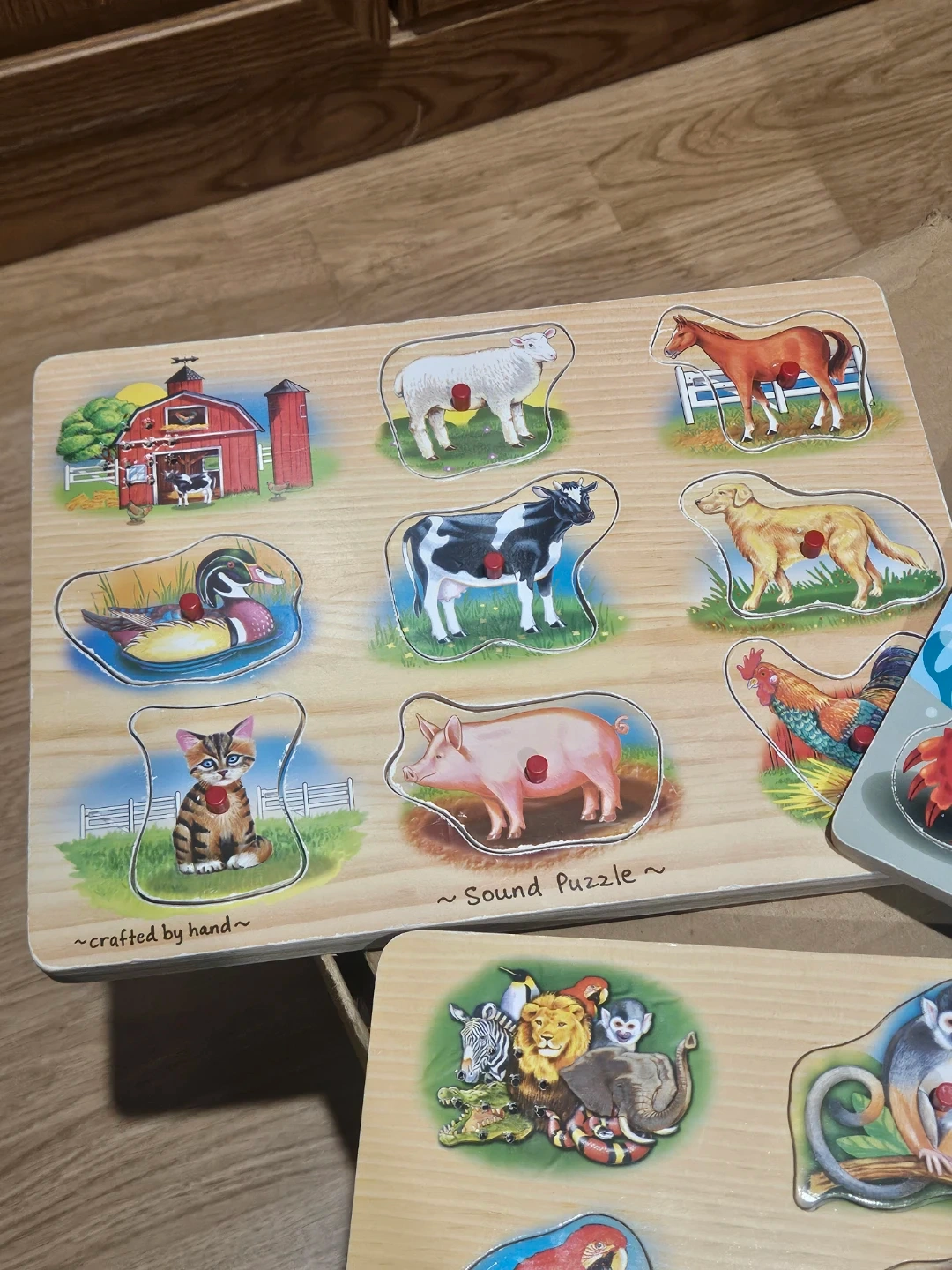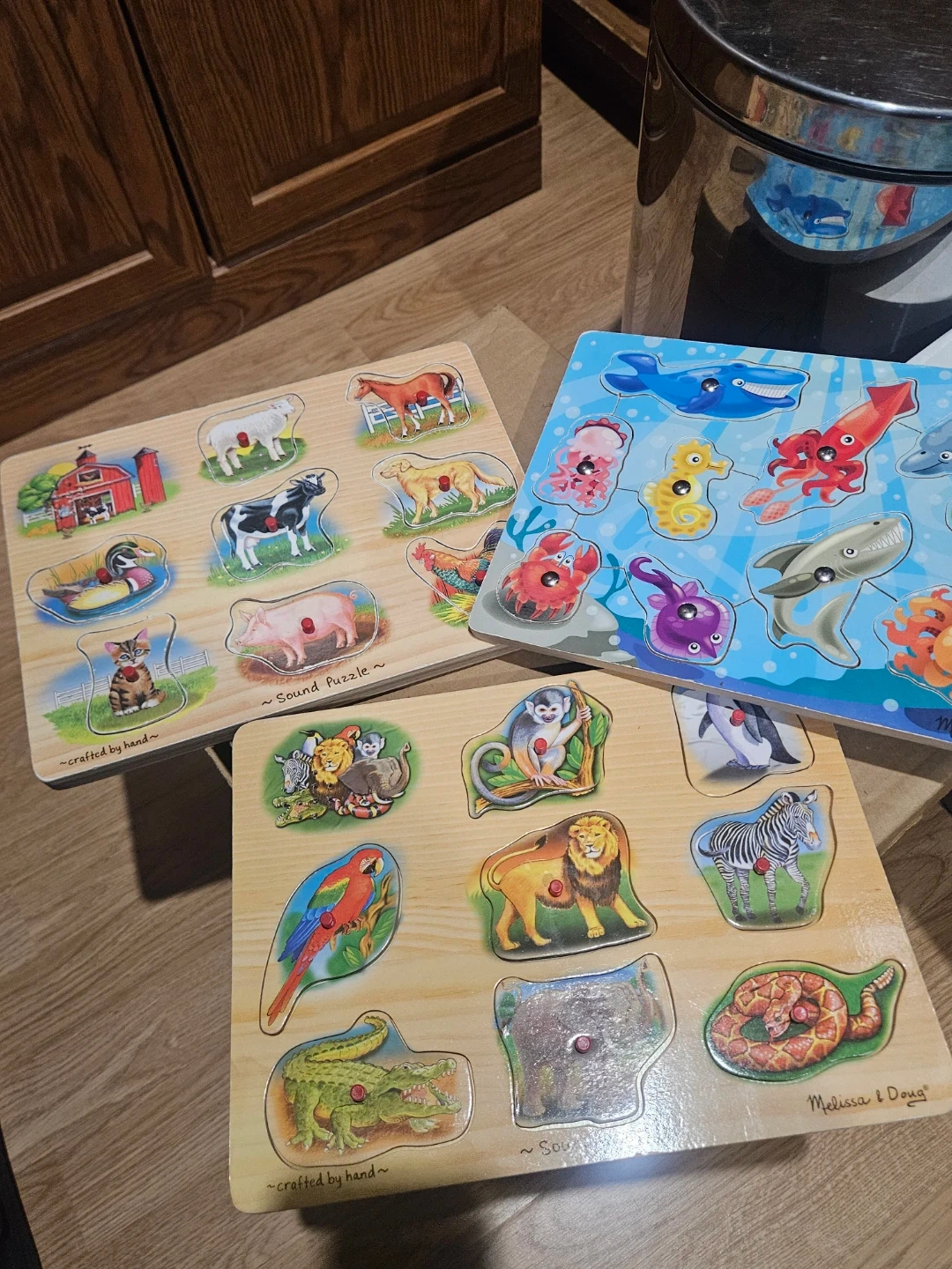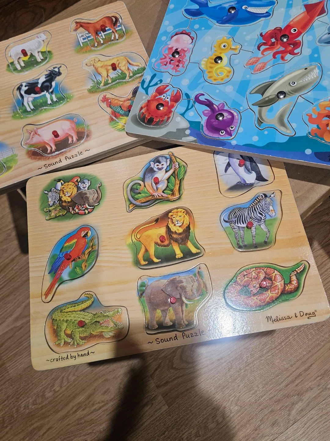 Selling a set of three Melissa & Doug sound puzzles! Each puzzle features different themes and sounds when the pieces are placed correctly. Great for toddlers and early learning!