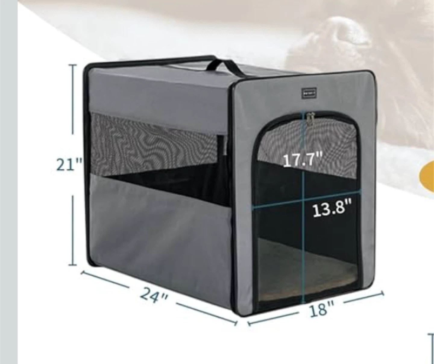 This is a PETSFIT portable pet carrier crate, perfect for traveling with your furry friend! It's gray and measures approximately 21" x 24" x 18". The crate is designed for easy folding and storage, making it ideal for car rides and trips. It features mesh windows for ventilation and visibility, ensuring your pet stays comfortable and secure.