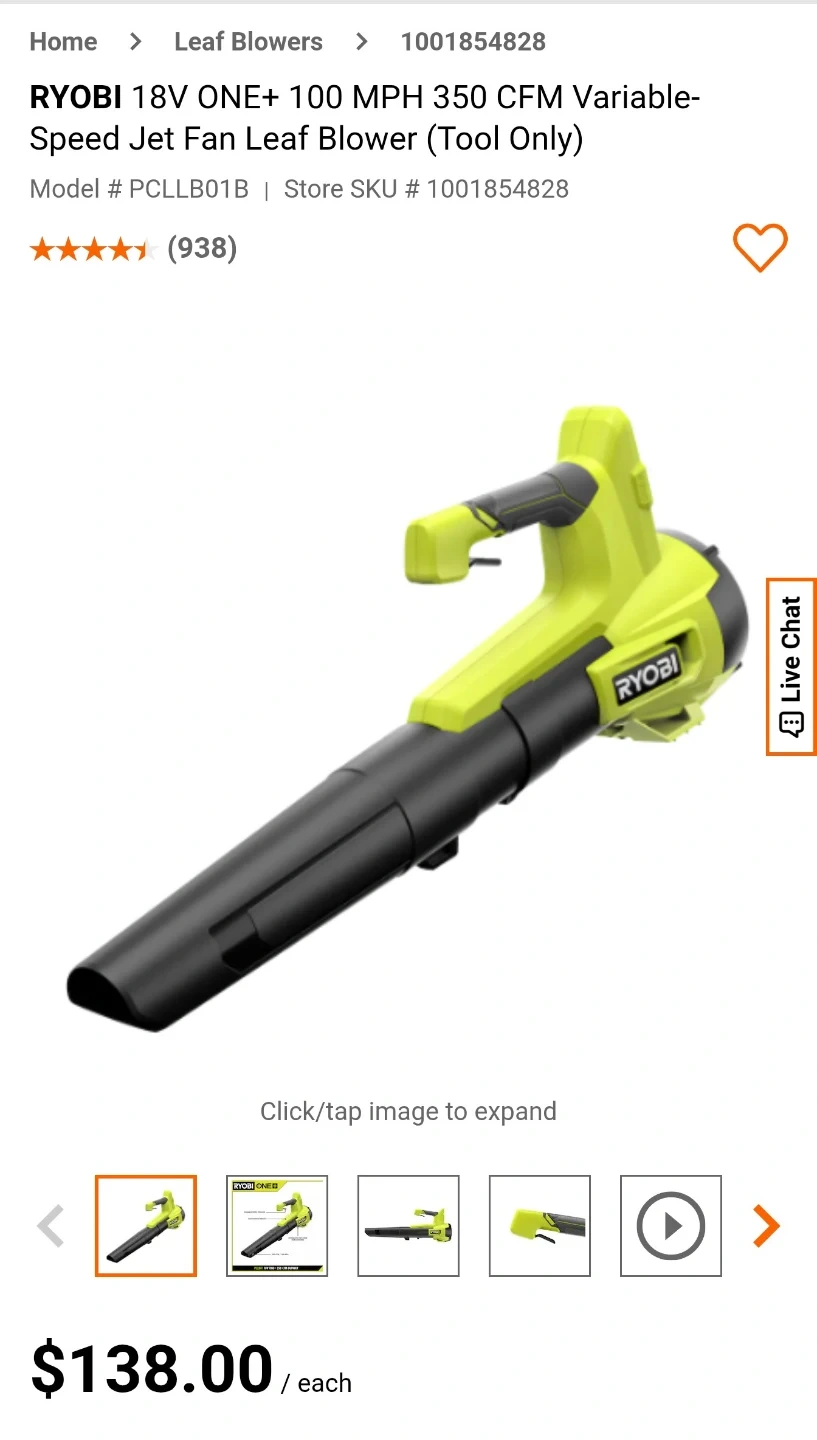 Selling a Ryobi 18V ONE+ 100 MPH 350 CFM Variable-Speed Jet Fan Leaf Blower (Tool Only). Model number PCLLB01B. Originally priced at $138.00