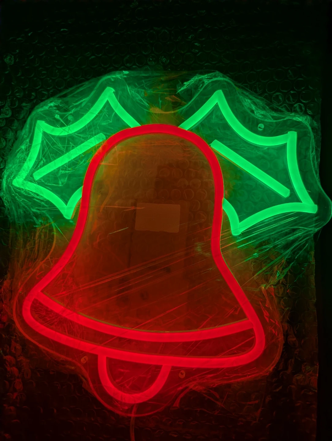 Selling a festive Christmas bell neon sign! It features a red bell and green holly leaves. It's still in its original packaging.
