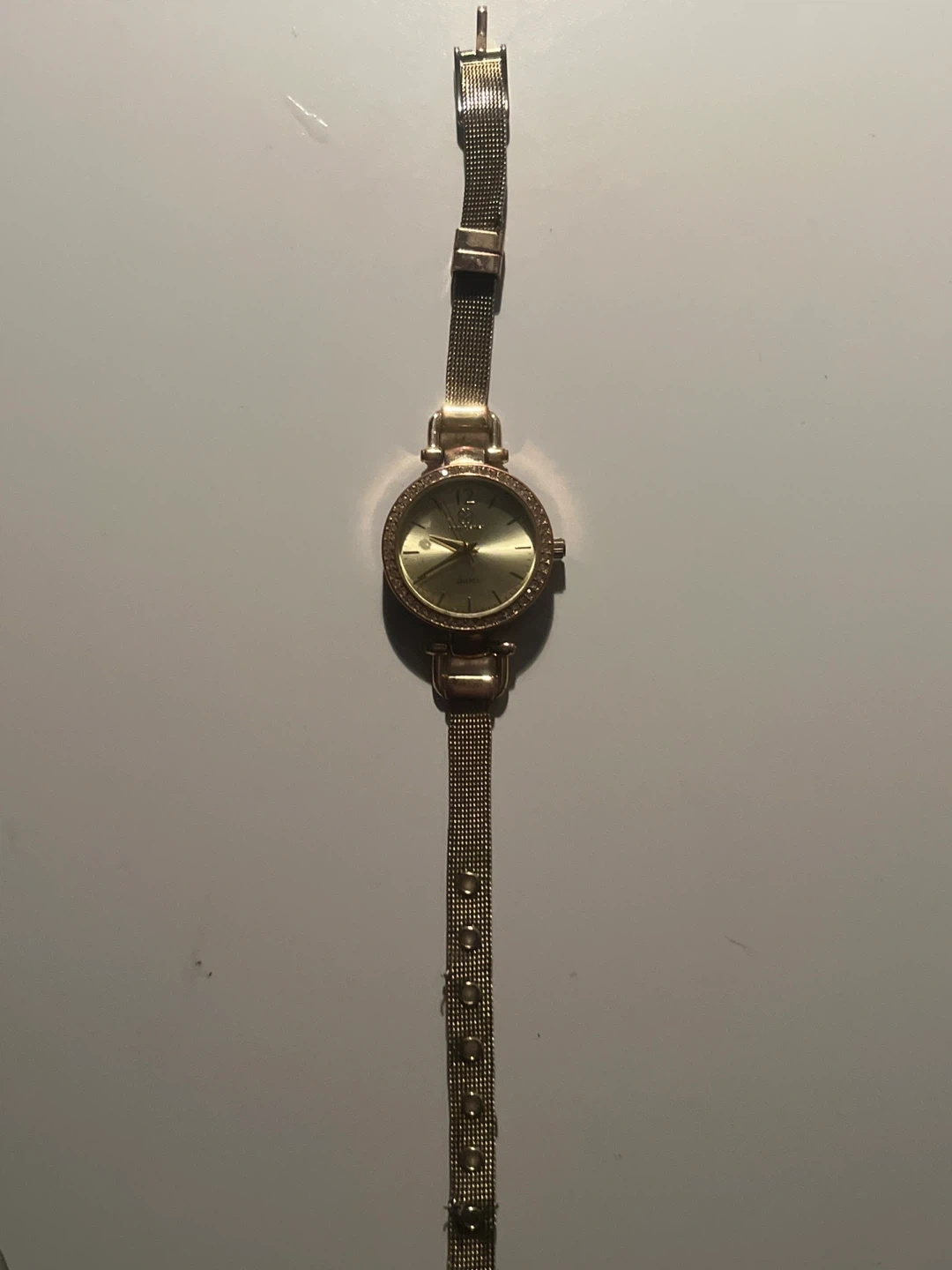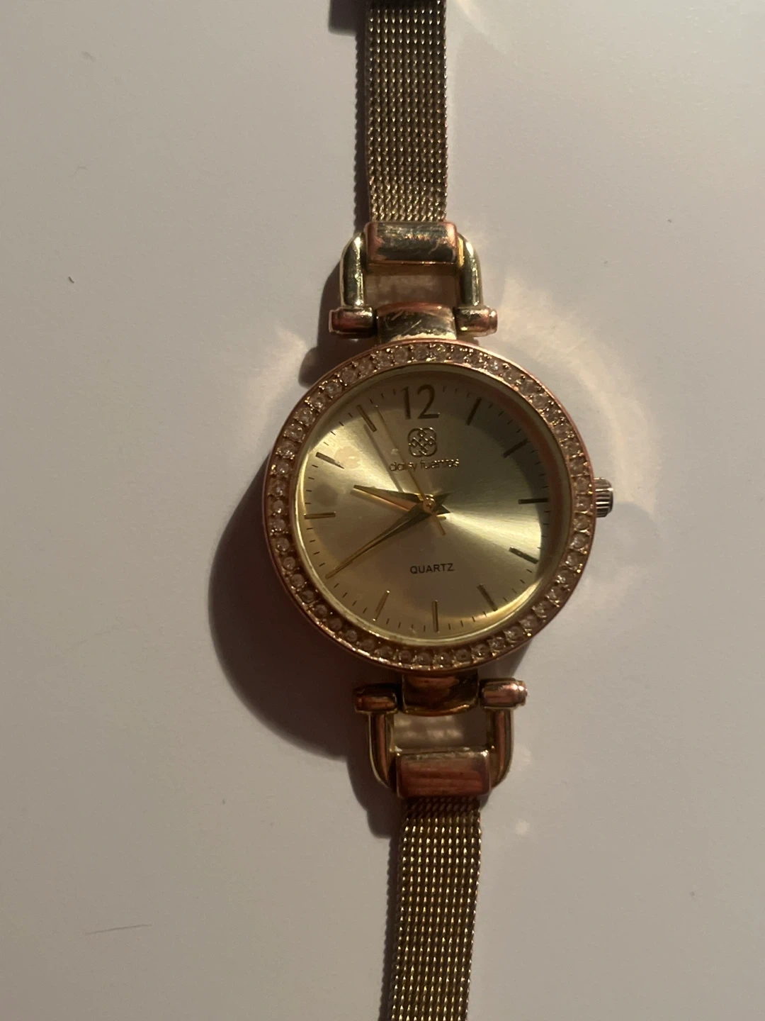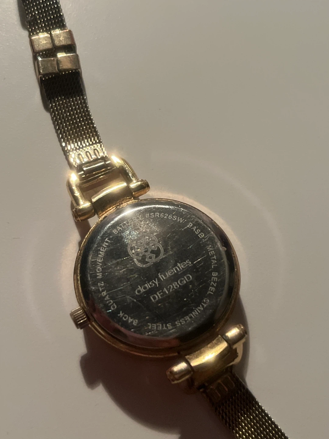 Selling a Daisy Fuentes gold watch, model DE128GD. It's a quartz watch with a stainless steel back and a metal bezel. The watch has a gold-tone mesh band and a round face with crystal accents.