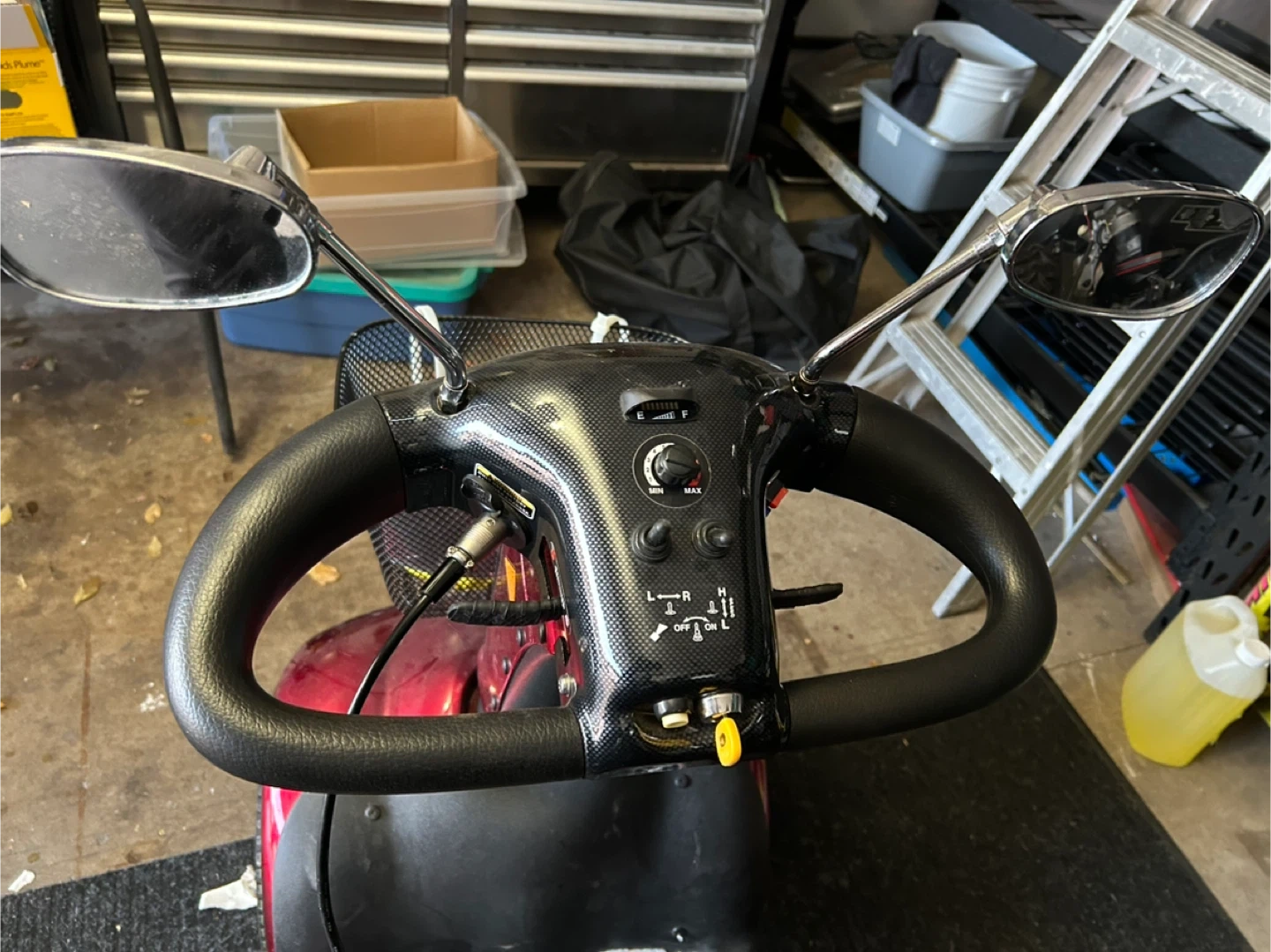 Selling a red Trailblazer mobility scooter. It is in good condition and ready to go! It has a comfortable seat, mirrors, and a front basket for storage