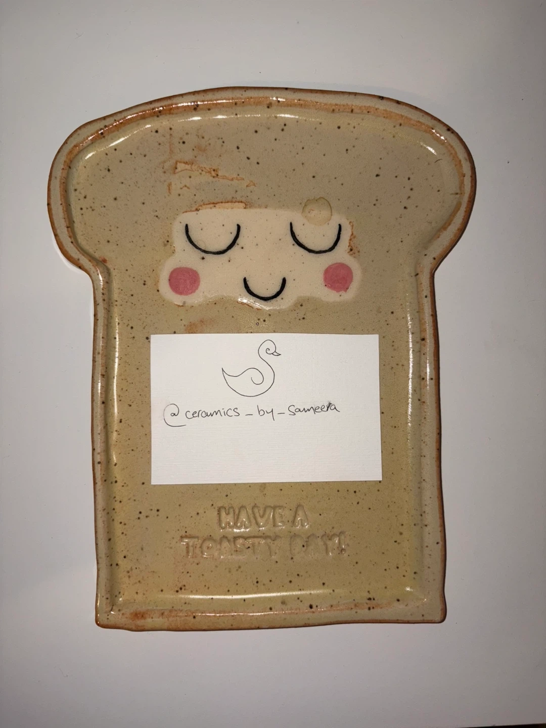 This is a handmade ceramic toast plate with a cute, sleepy toast face design. It's perfect for adding a touch of whimsy to your breakfast table! The plate has a speckled, neutral glaze and says "Have a Toasty Day" at the bottom. It's in great condition and ready to brighten up your mornings.