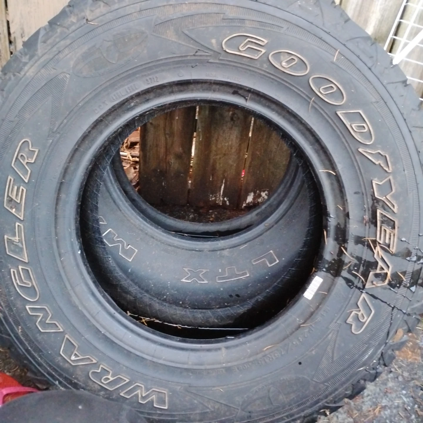 Selling a Goodyear Wrangler MT/R tire, size LT235/75R15. They look like they have seen some use, but still have some life left in them. Perfect for off-roading adventures!