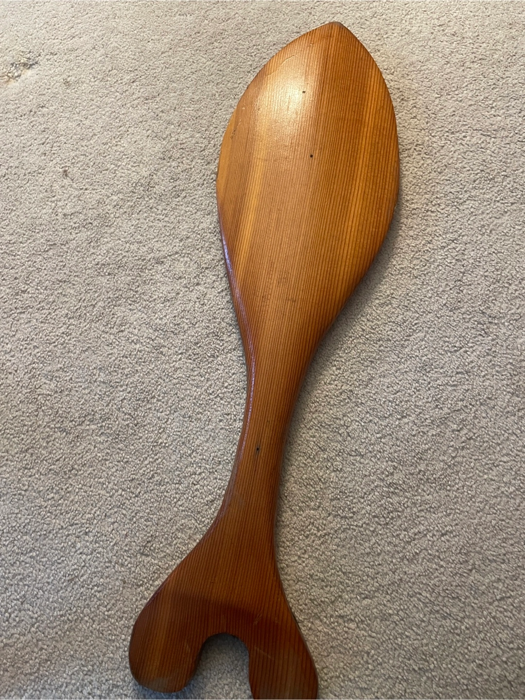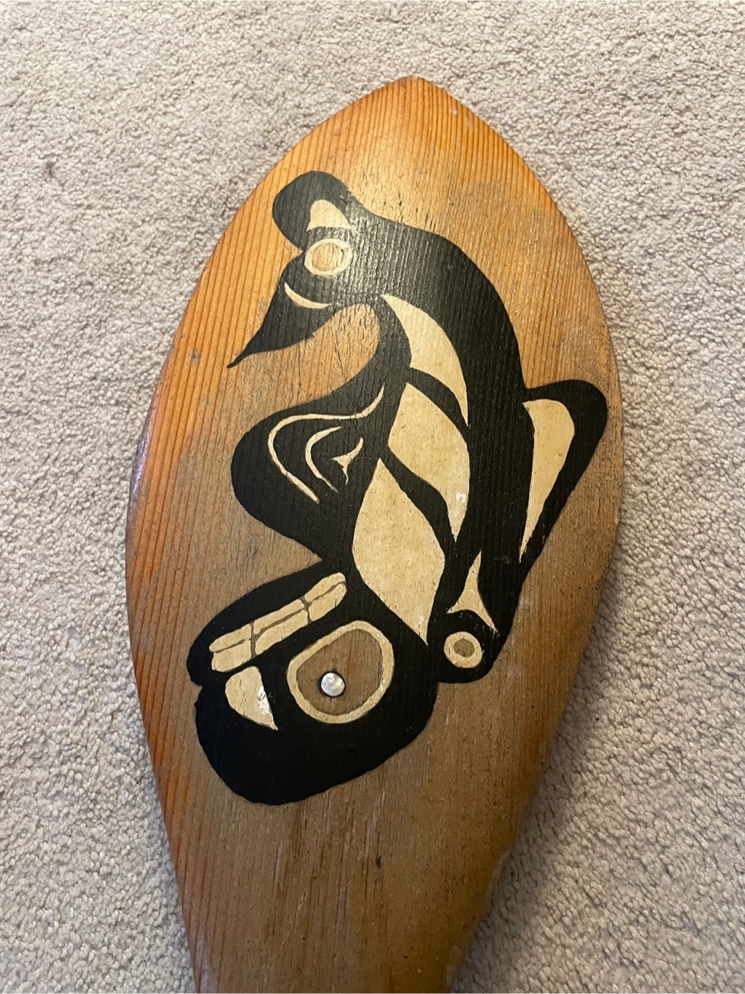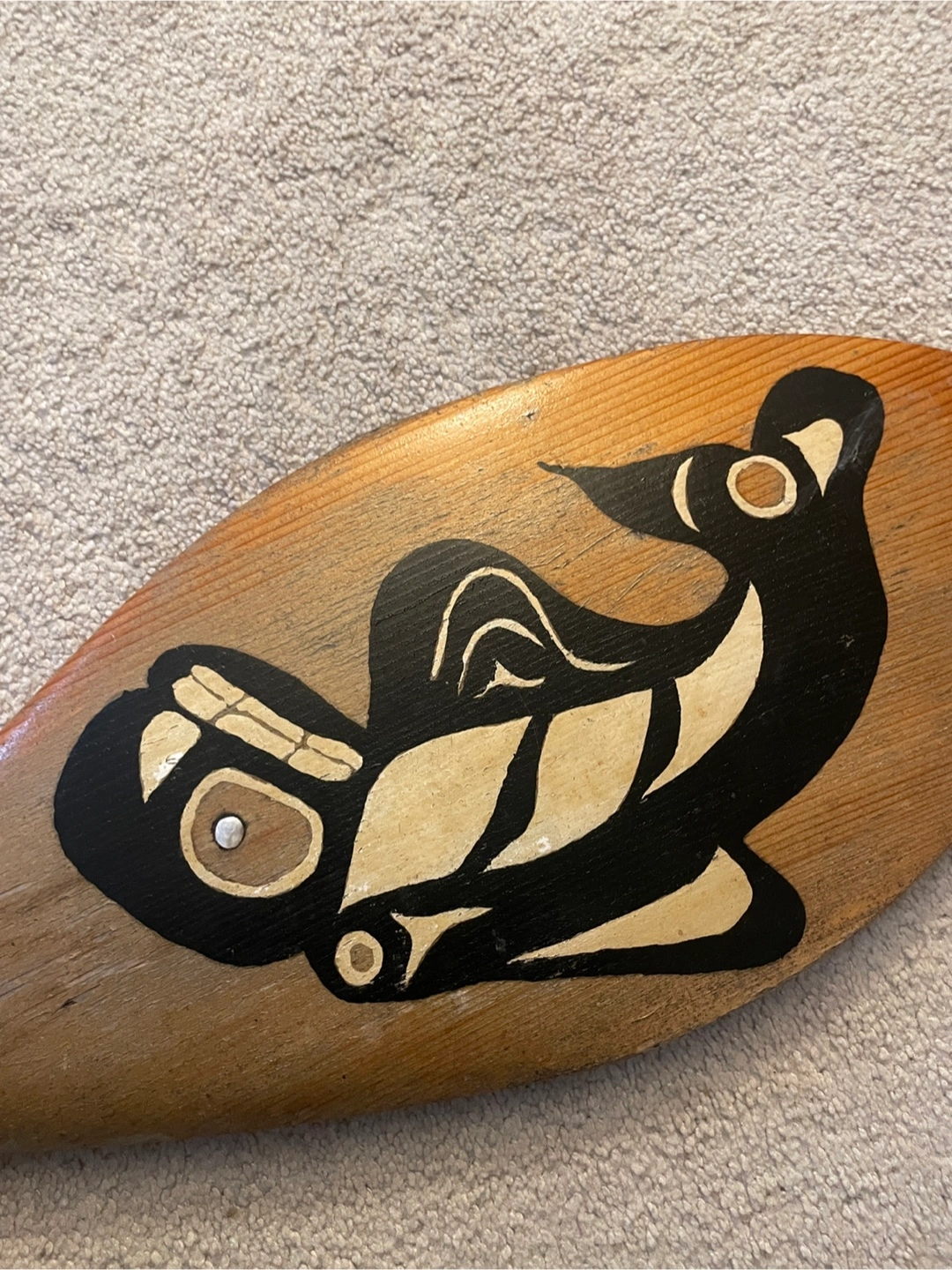 Here's a beautiful hand-carved wooden paddle featuring a unique bird design. It's a lovely piece of art and would look great as a decorative item in your home or cottage!