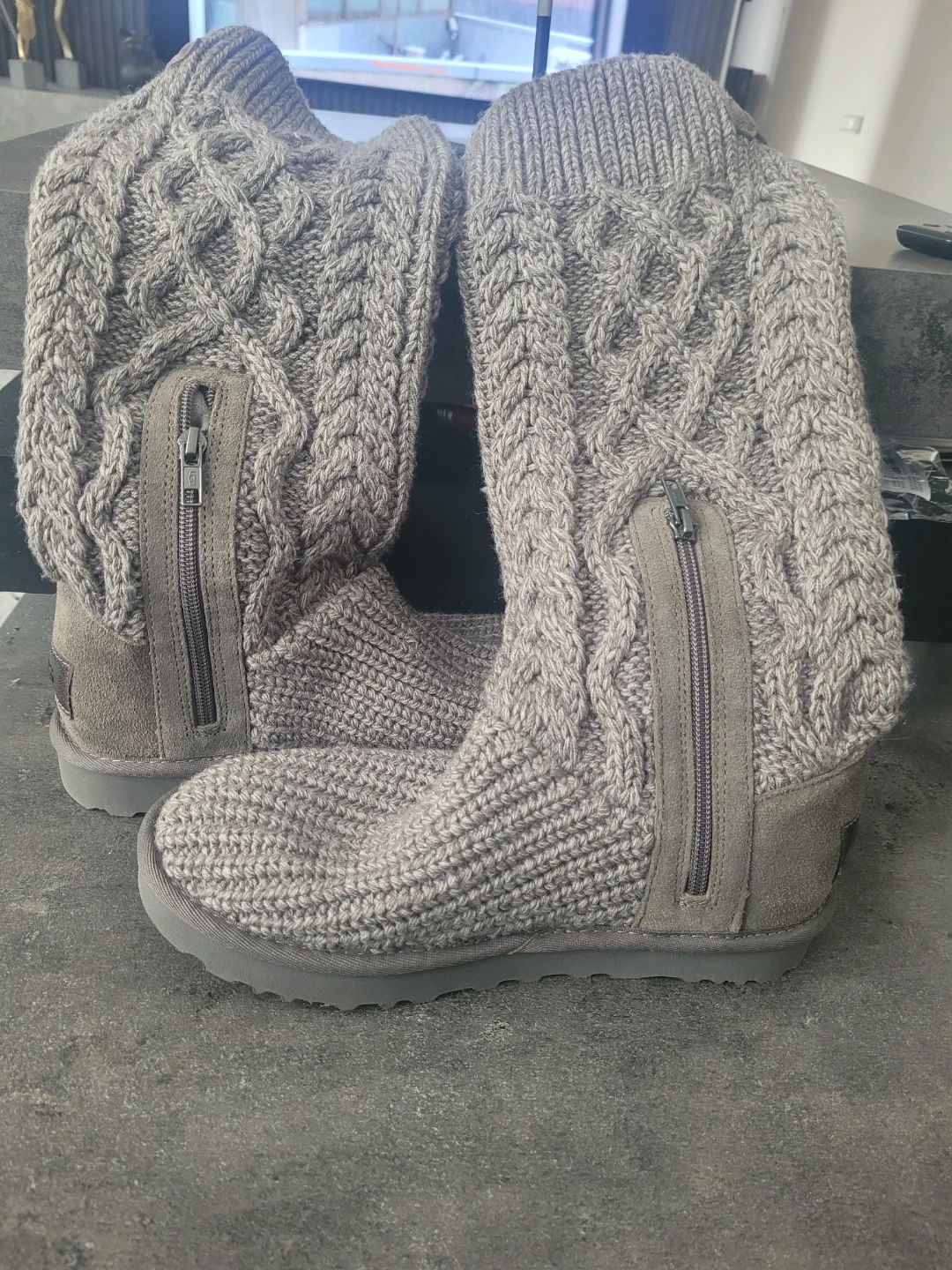 Cozy UGG boots with a stylish cable knit design! These are in great condition and perfect for keeping your feet warm during the colder months. They feature a zipper for easy wear and the classic UGG comfort you know and love