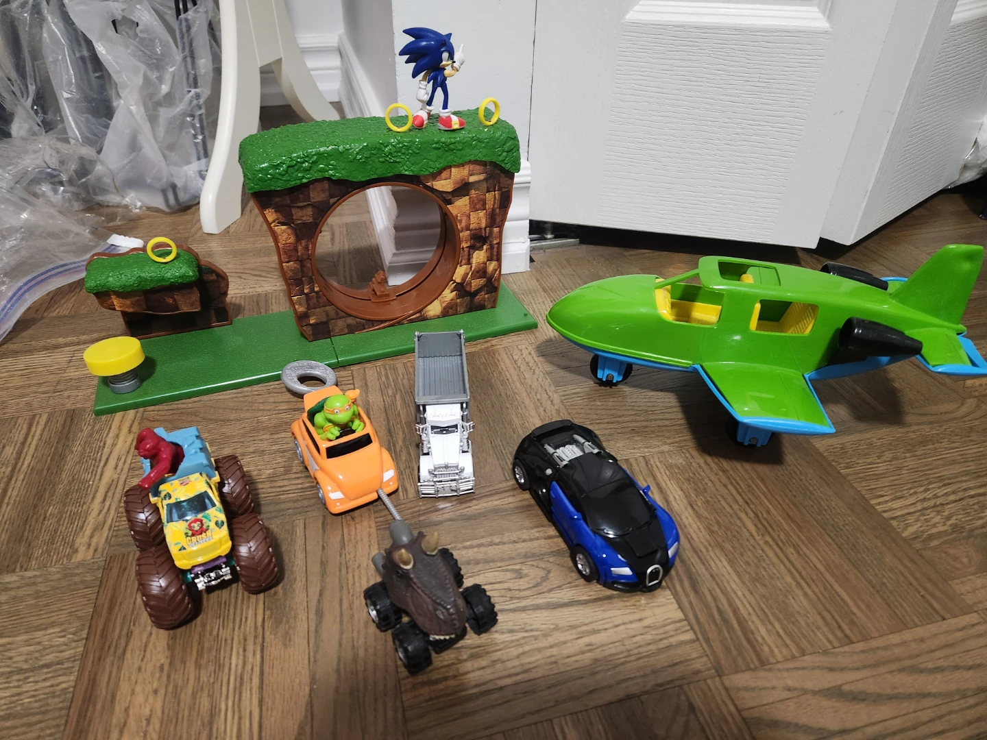 lot of toy cars and a Sonic the Hedgehog playset. Includes a monster truck, race car, airplane, and other vehicles. The Sonic playset has a loop and a figure of Sonic.