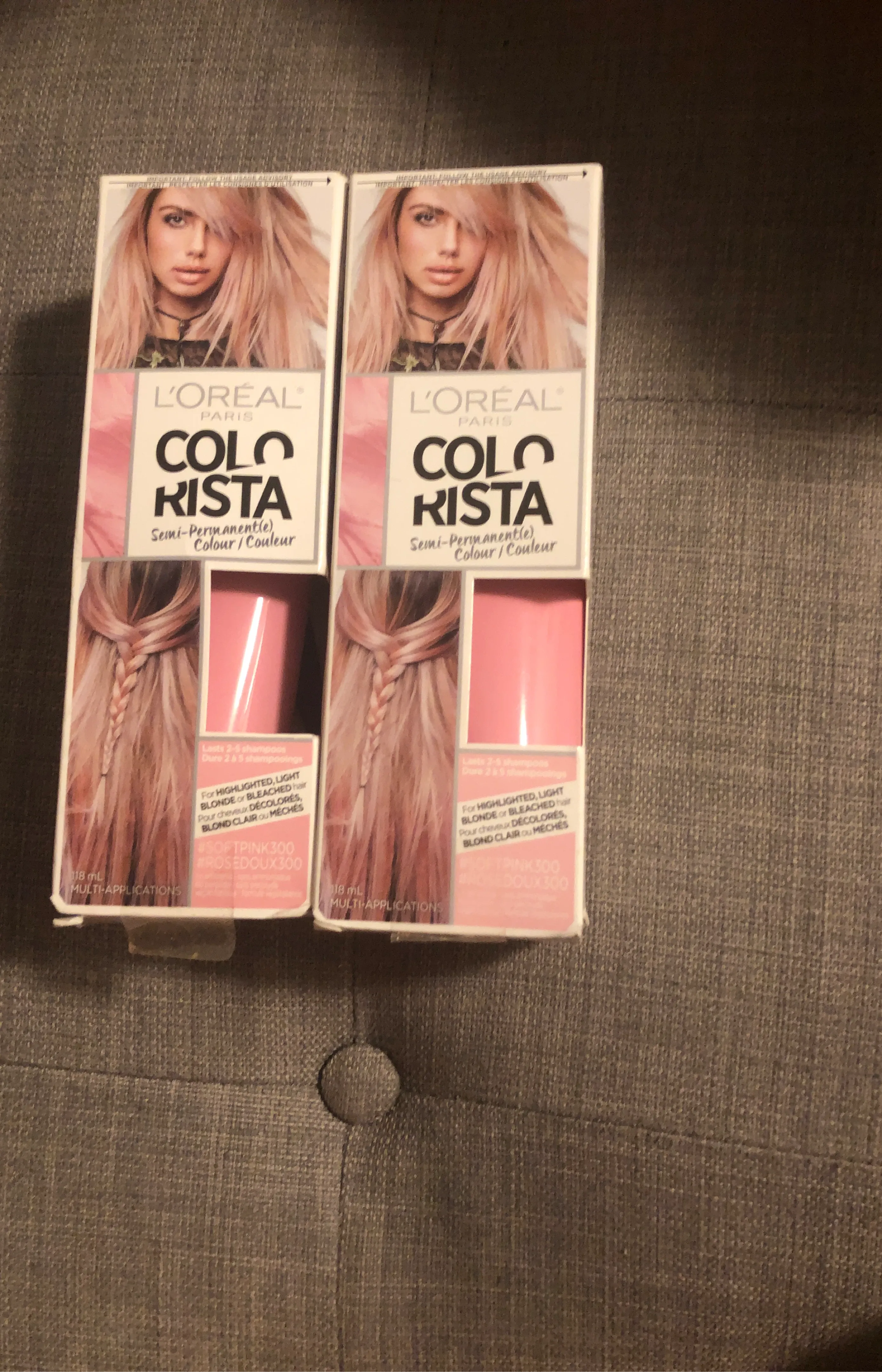Selling two boxes of L'Oreal Colorista Semi-Permanent hair dye in Soft Pink 300. It's designed for highlighted, light blonde, or bleached hair. Each box contains 18 mL for multi-applications and lasts 2-6 shampoos.