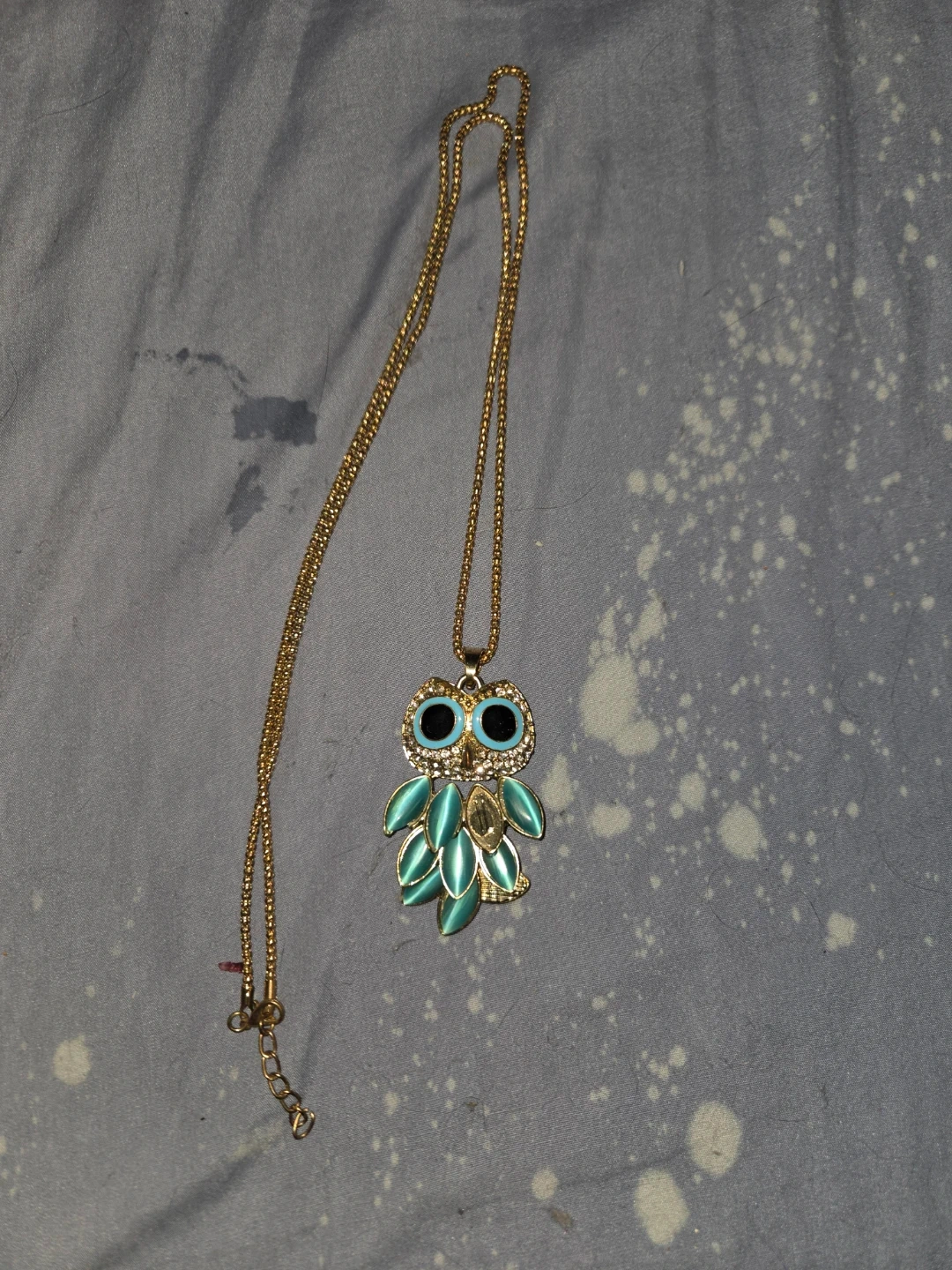 Cute owl pendant necklace with a gold-tone chain and turquoise accents! It's in good condition and ready to add a bit of whimsy to your outfit