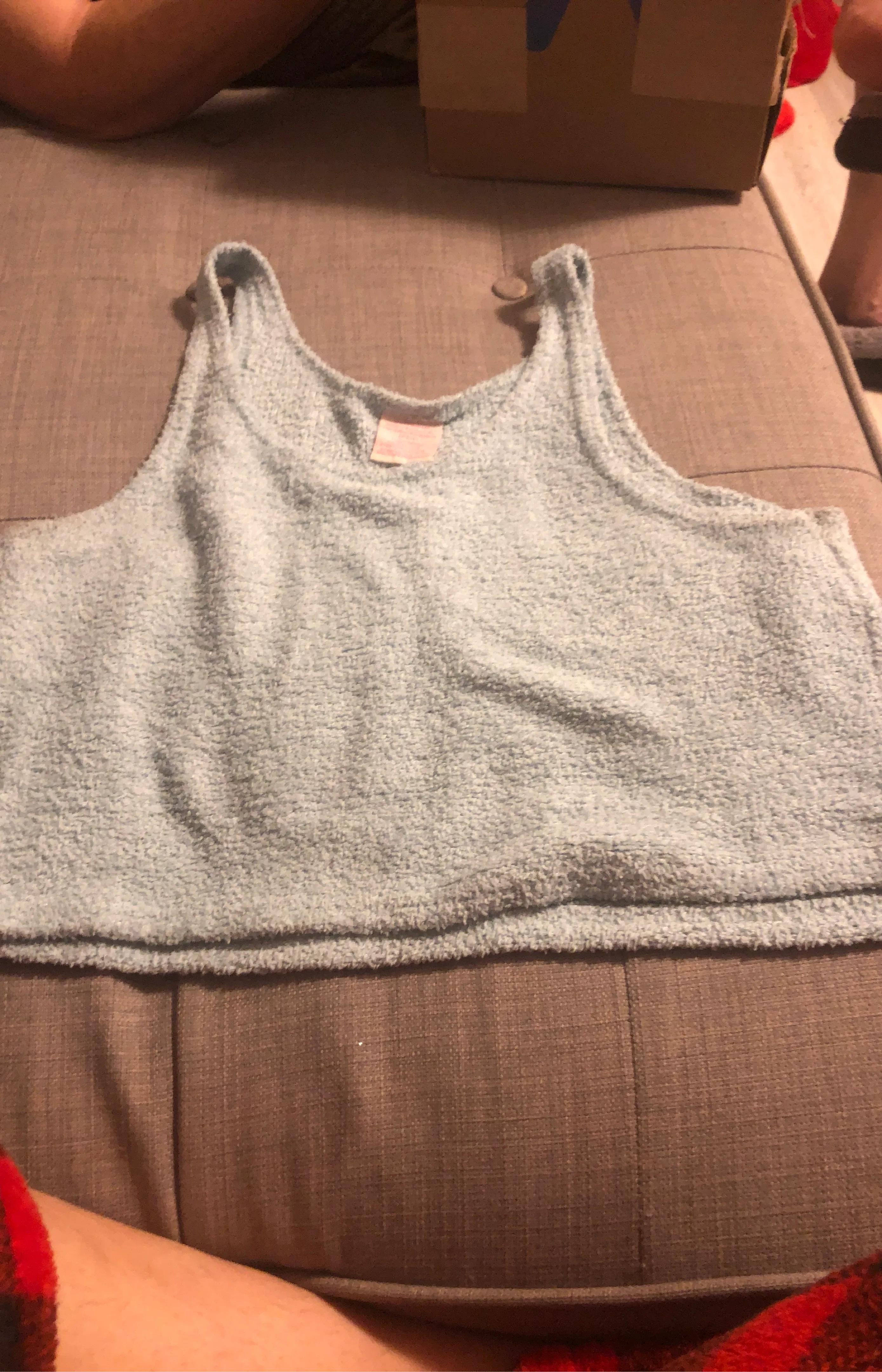 Here's a light blue tank top that's in good condition! It's a soft, fuzzy material, perfect for lounging around the house or layering under other clothes. It's a great addition to any wardrobe!