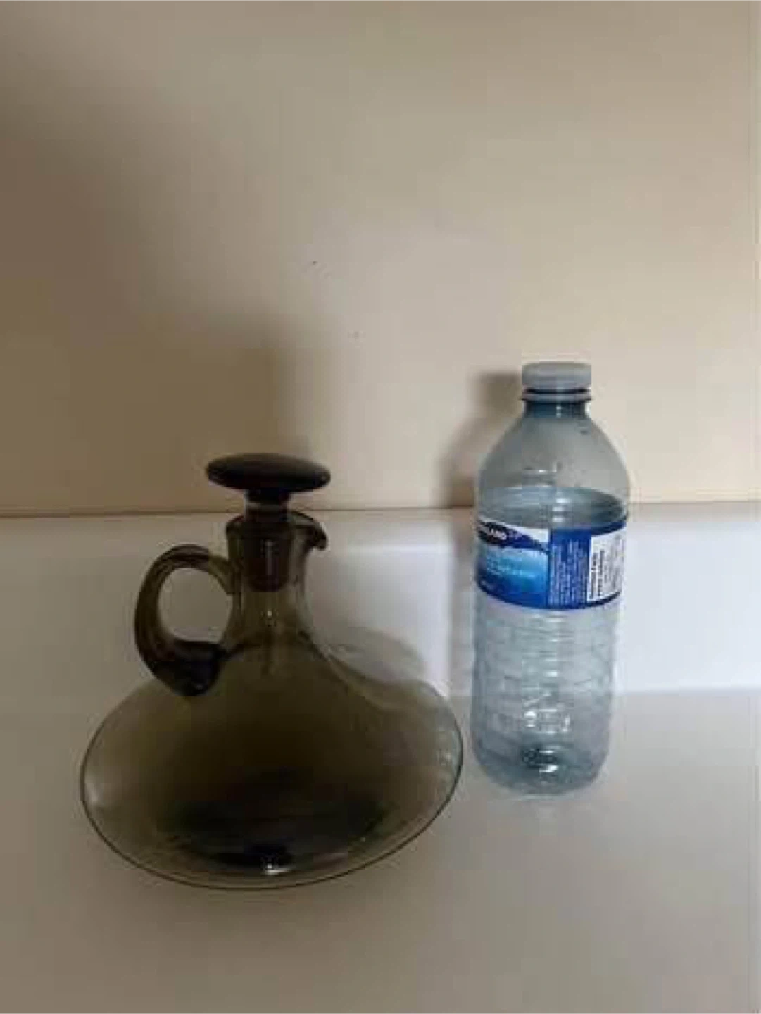 Here's a lovely glass olive oil dispenser, perfect for adding a touch of elegance to your kitchen or dining table. It's in great condition and ready to use!