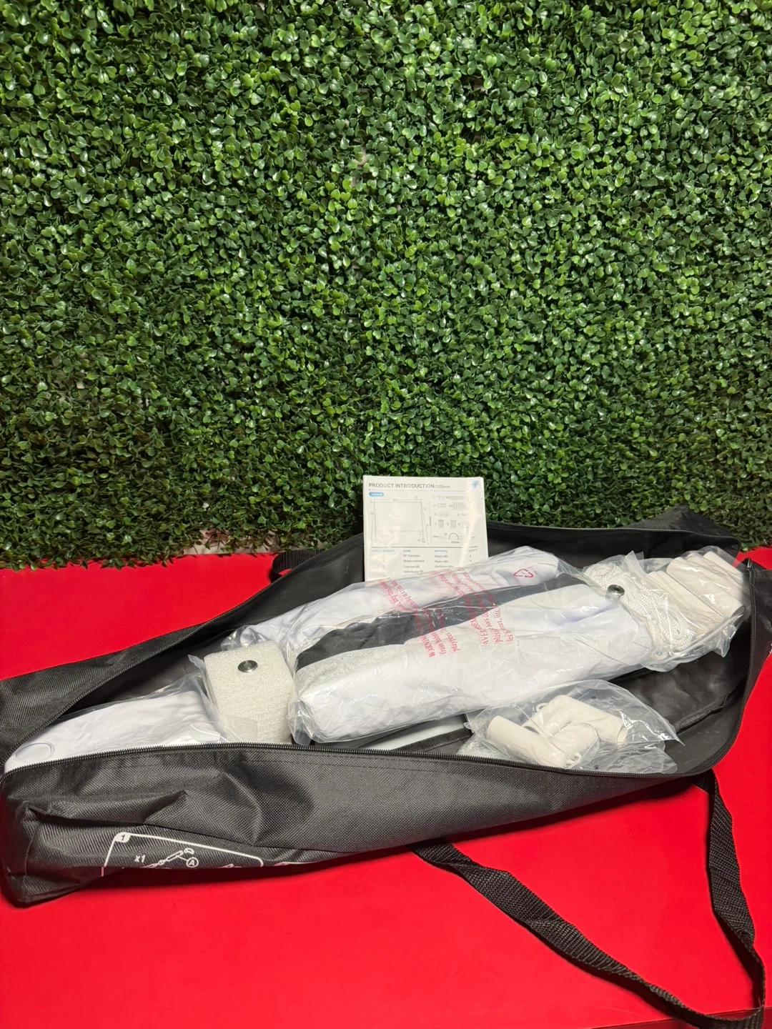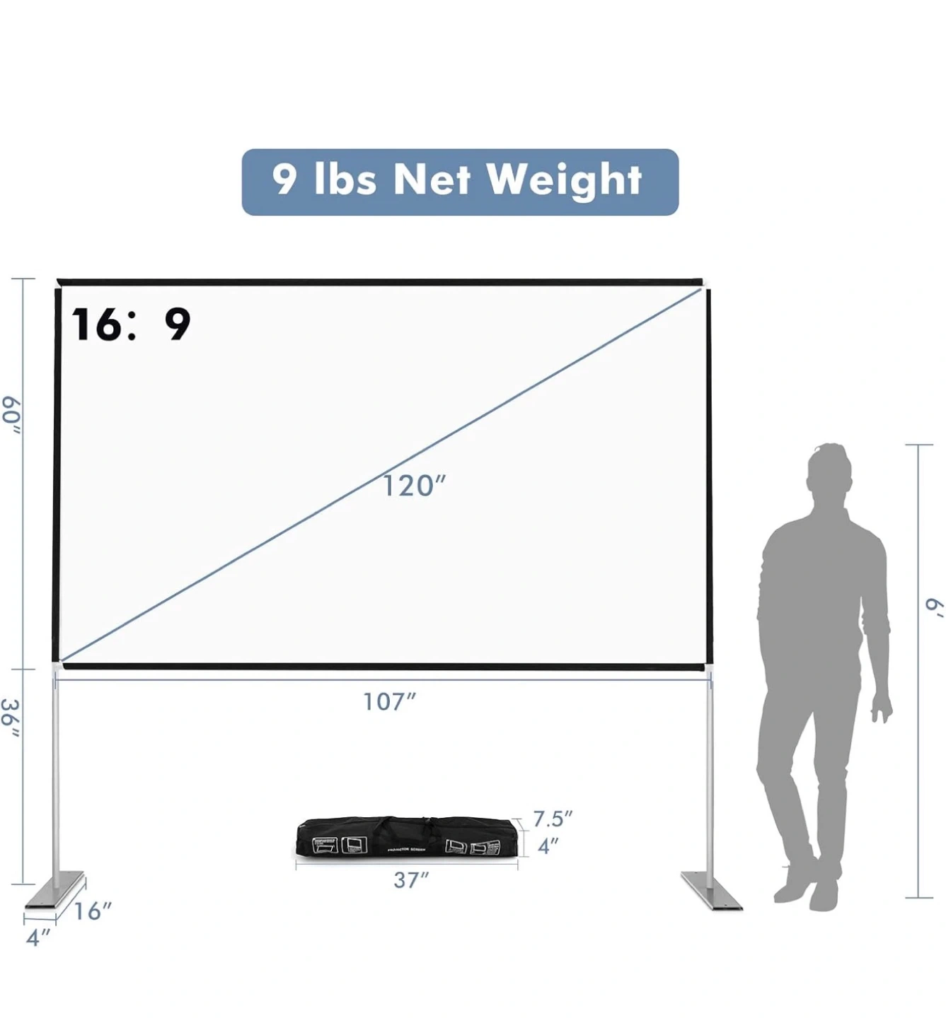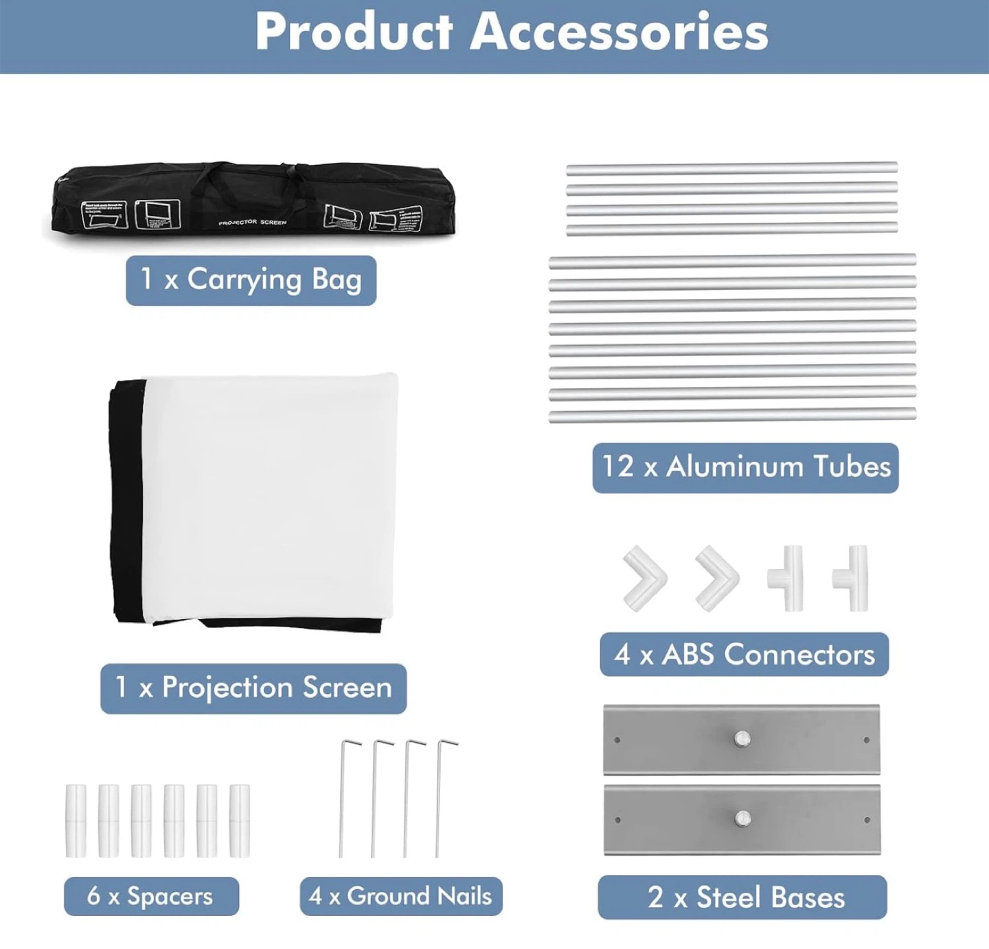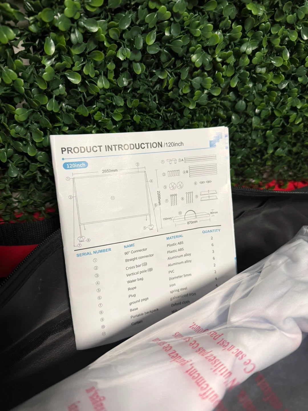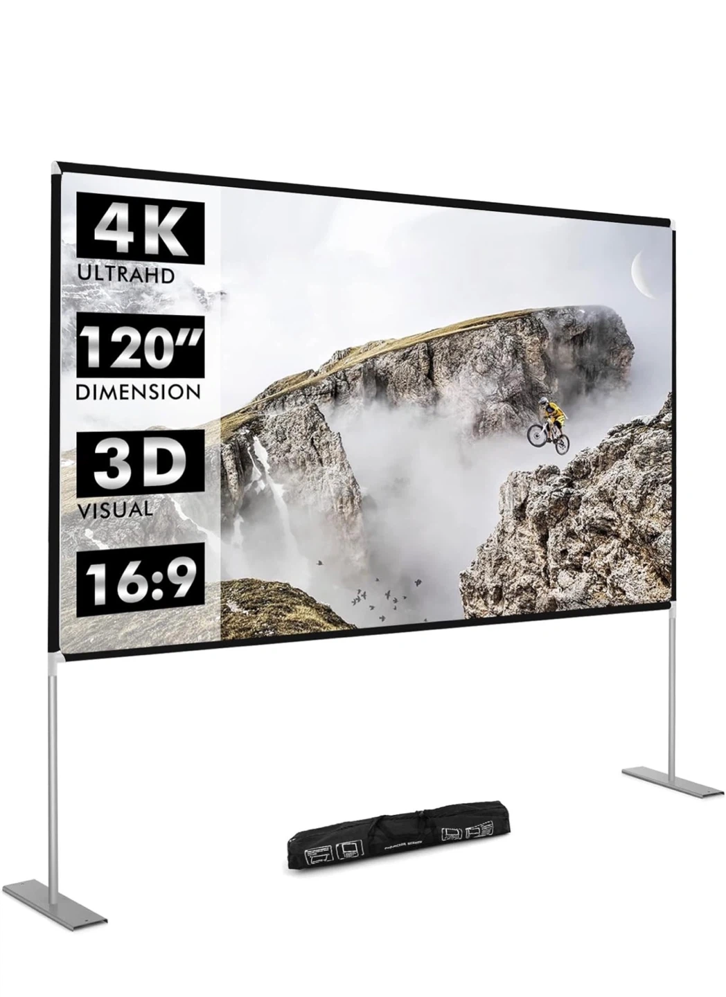 It comes with all the components in the original bag, including the frame, screen, ropes, and pegs. It's super easy to set up for movie nights or presentations. The screen is 120 inches with a 16:9 aspect ratio, perfect for 4K Ultra HD and 3D visuals