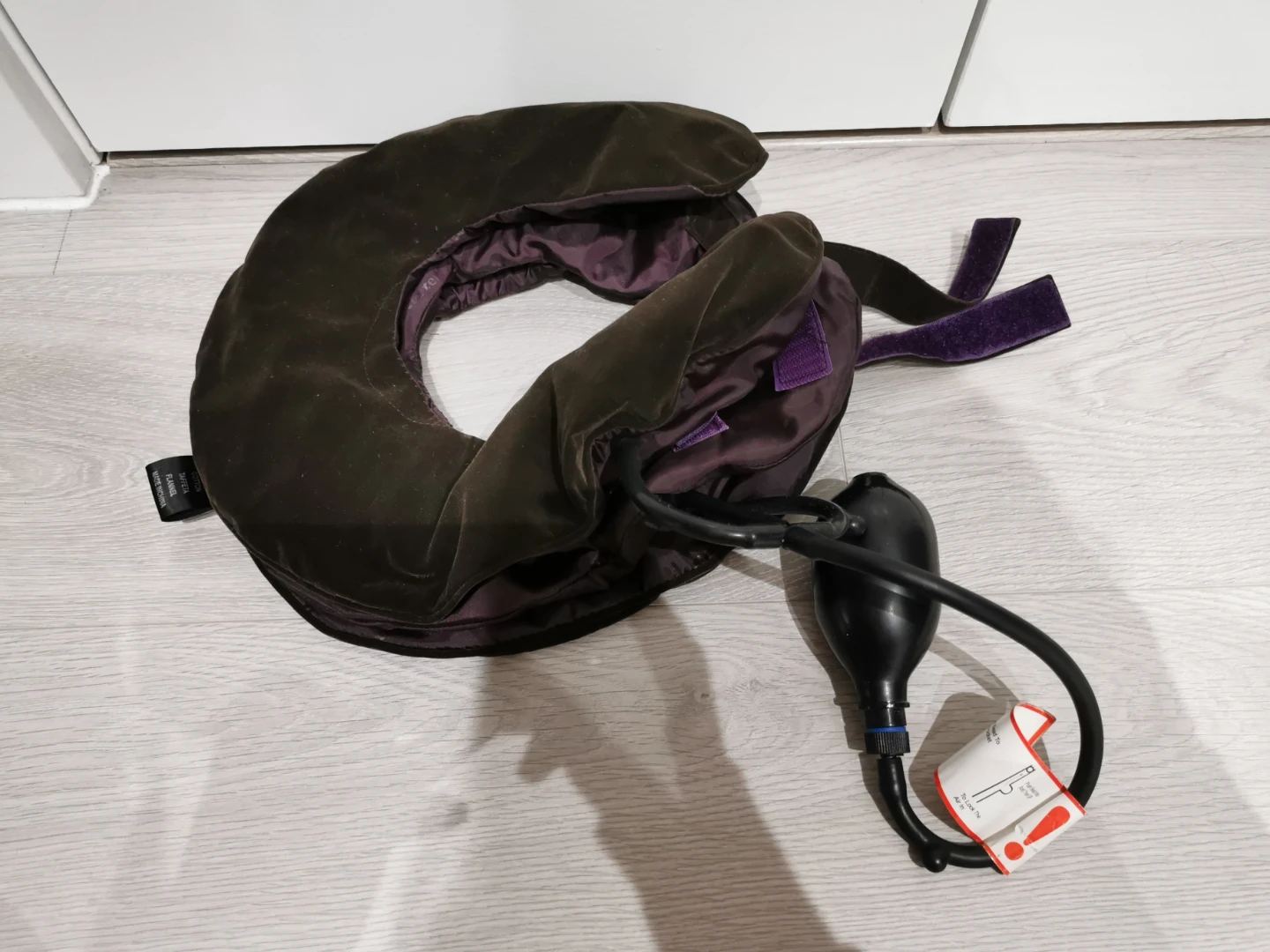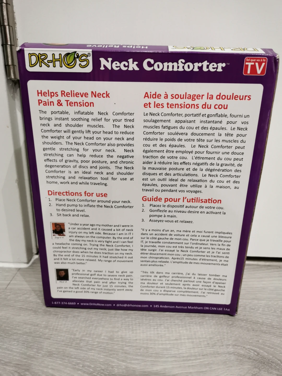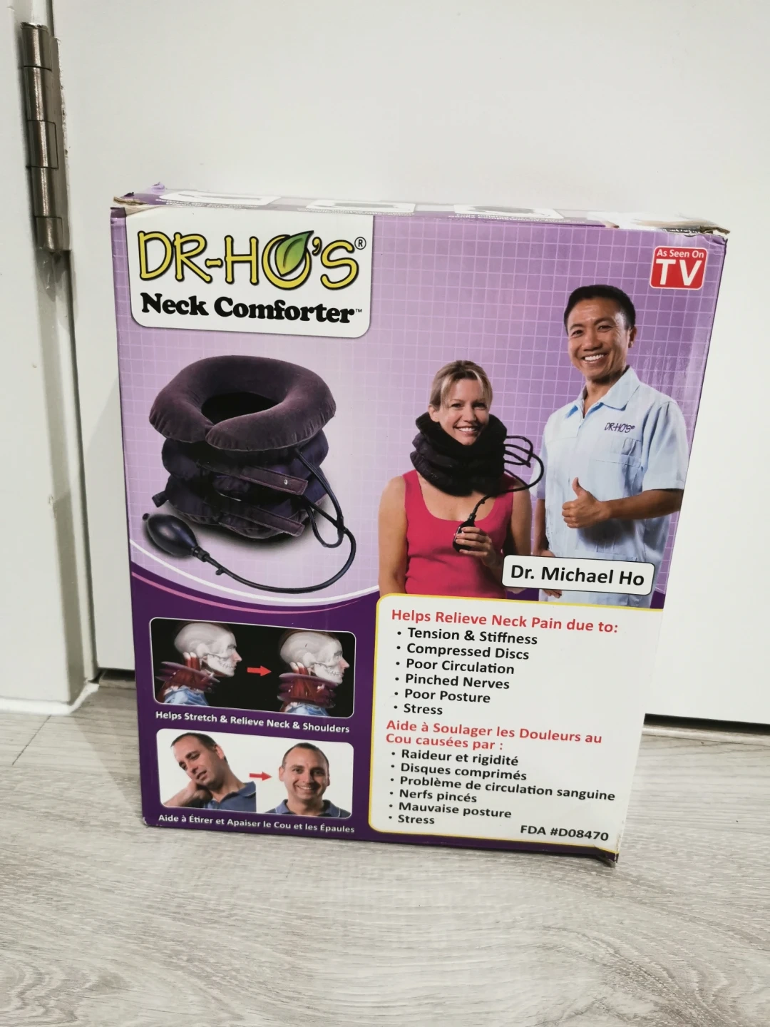 I'm selling a Dr-Ho's Neck Comforter. It helps relieve neck pain and tension. It's portable and inflatable, providing instant soothing relief for tired neck and shoulder muscles. It also helps reduce the negative effects of gravity, poor posture, and chronic degeneration of discs and joints. It's an ideal neck and shoulder stretching and relaxation tool for use at home, work, and while travelling
