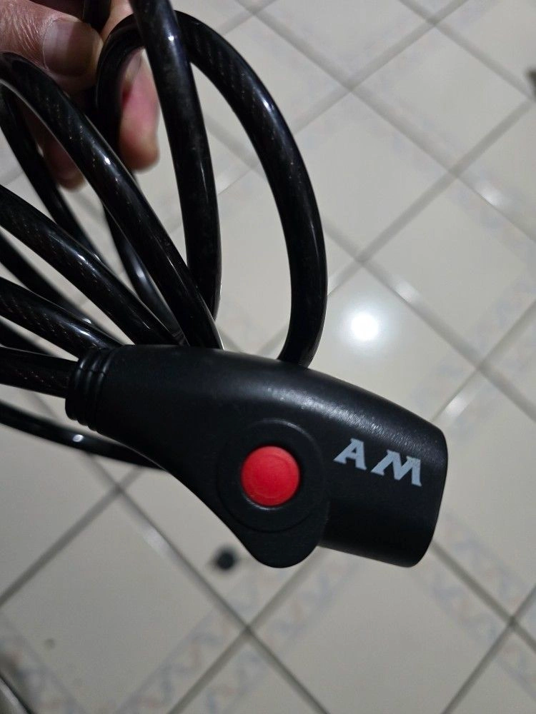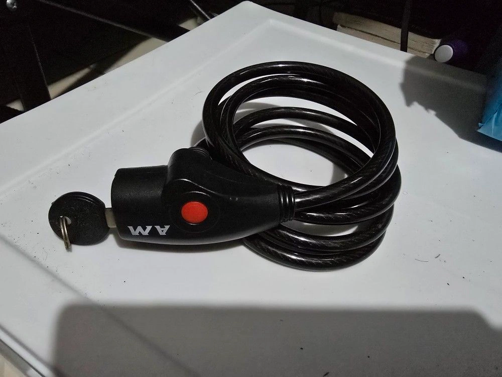 The AM Bike Lock Cable is a medium-sized, black steel cable lock designed for bicycles. It's 6ft long and weighs 9 oz. It features a key mechanism, rust-free, weatherproof, and durable construction, making it ideal for outdoor use. It's also portable and convenient to carry while cycling. Comes with 1 Key.