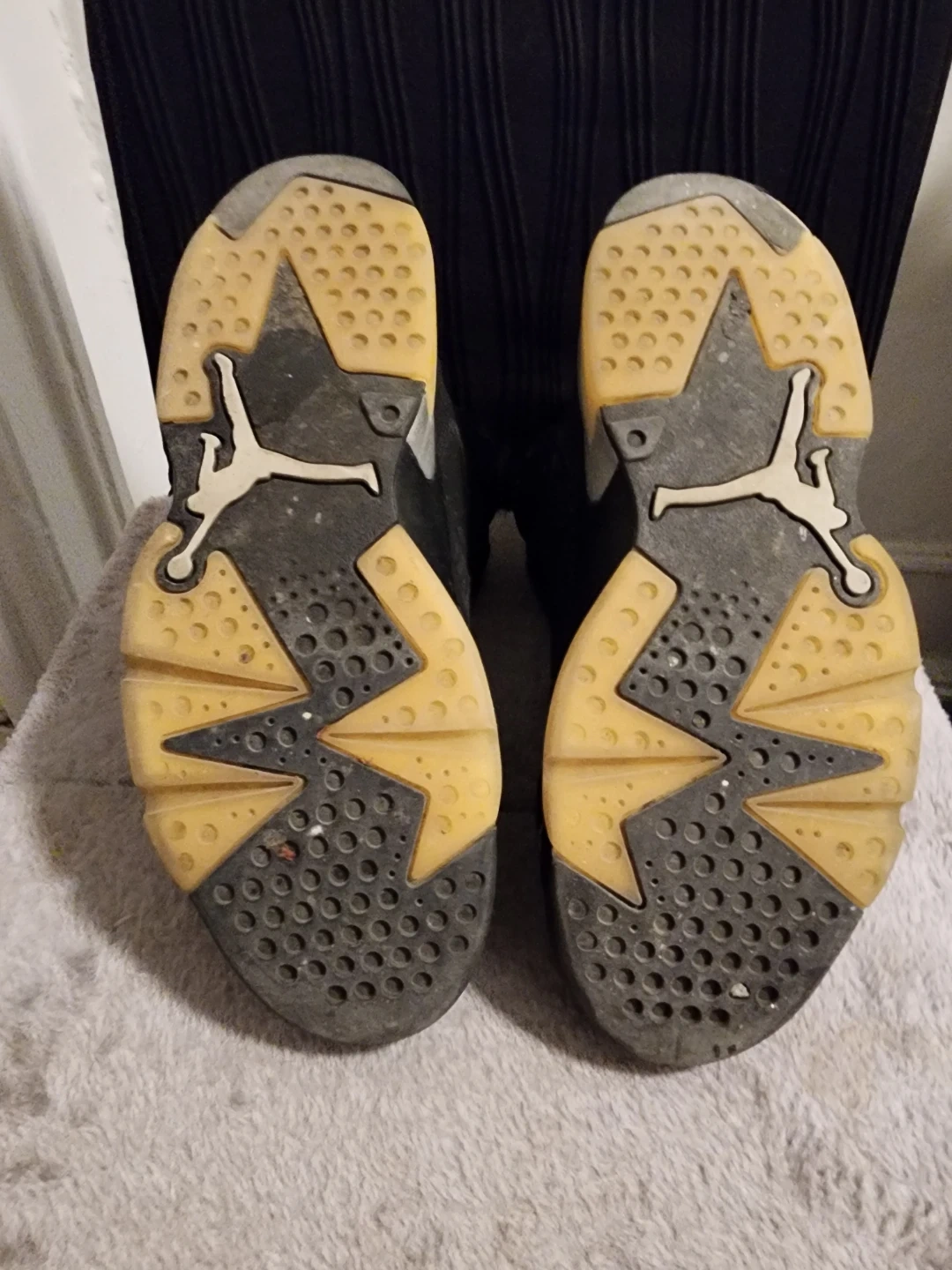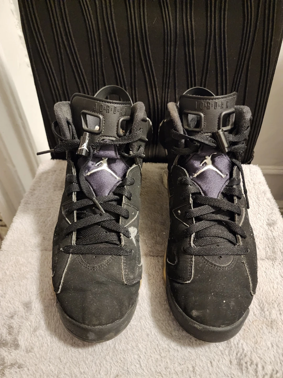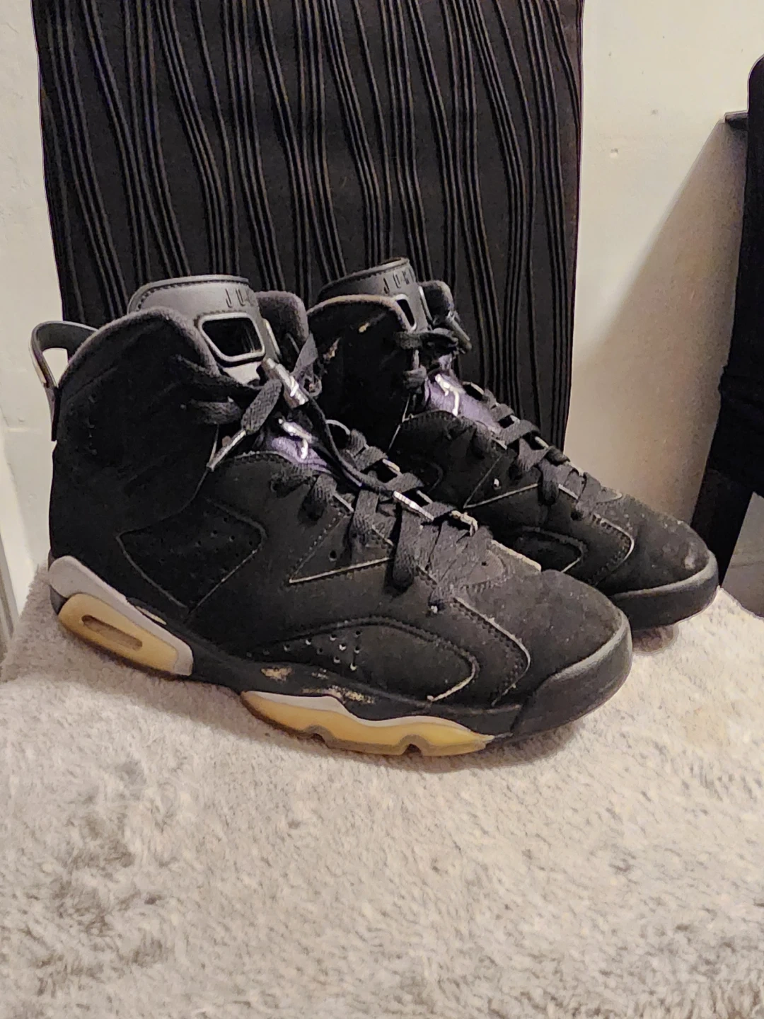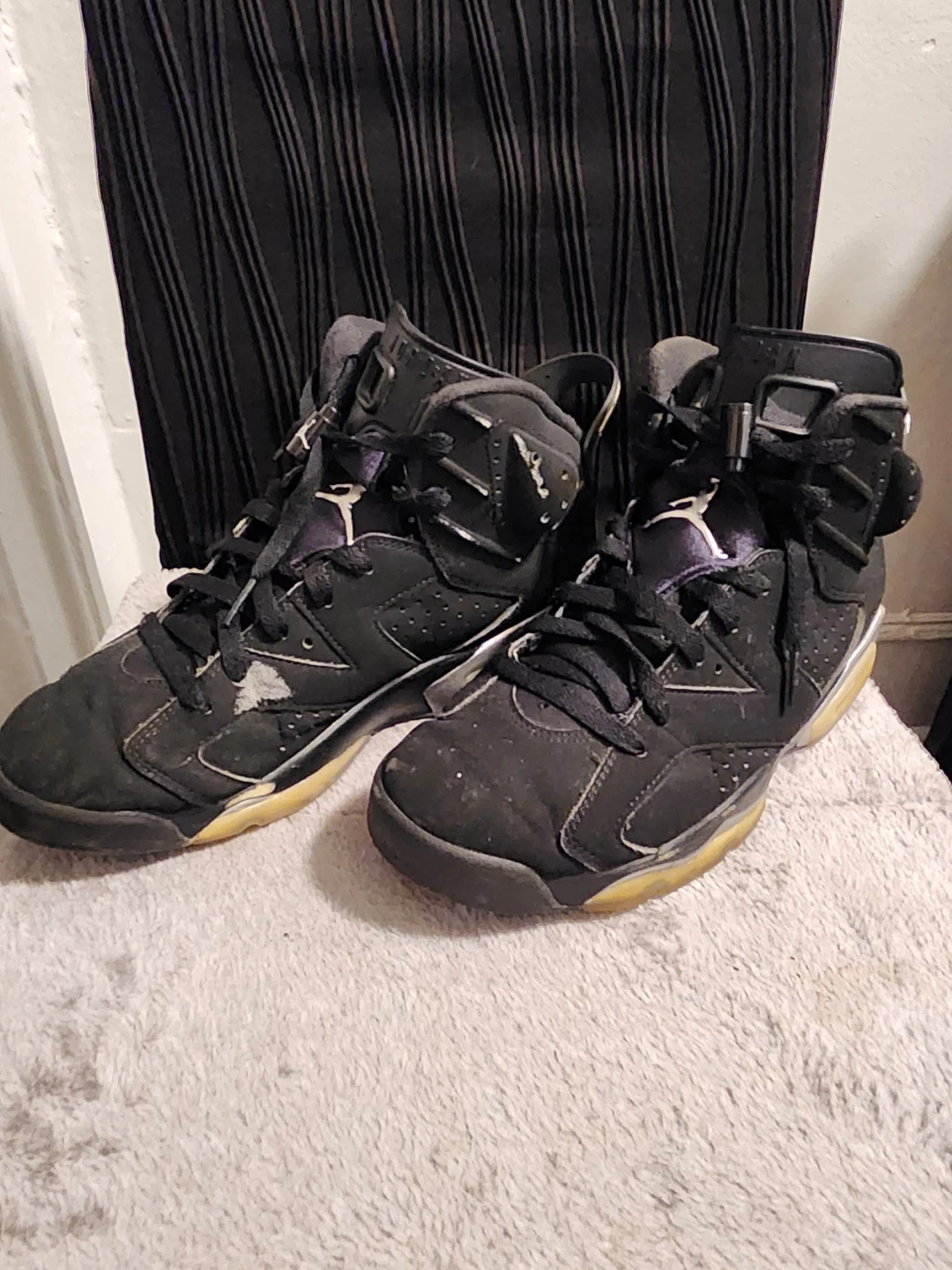 Selling a pair of Jordan 6 Retro sneakers in black. They show some signs of wear, as you can see in the photos, but still have plenty of life left. Great for casual wear or hitting the court!