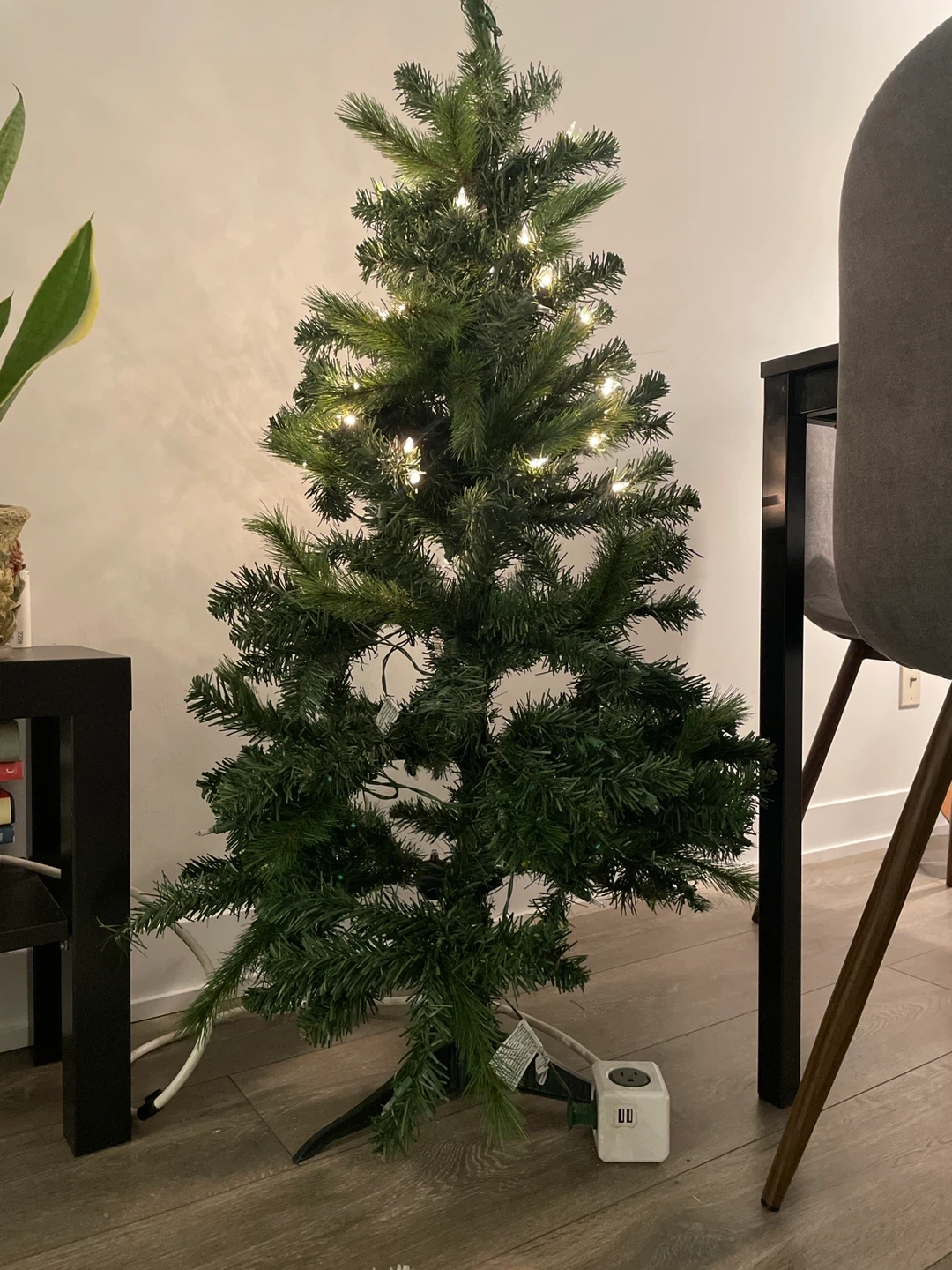 Pre-lit Ashland 4 ft Christmas tree. The lights on the bottom half are not working, but the tree itself is in great shape. Comes with the original box.