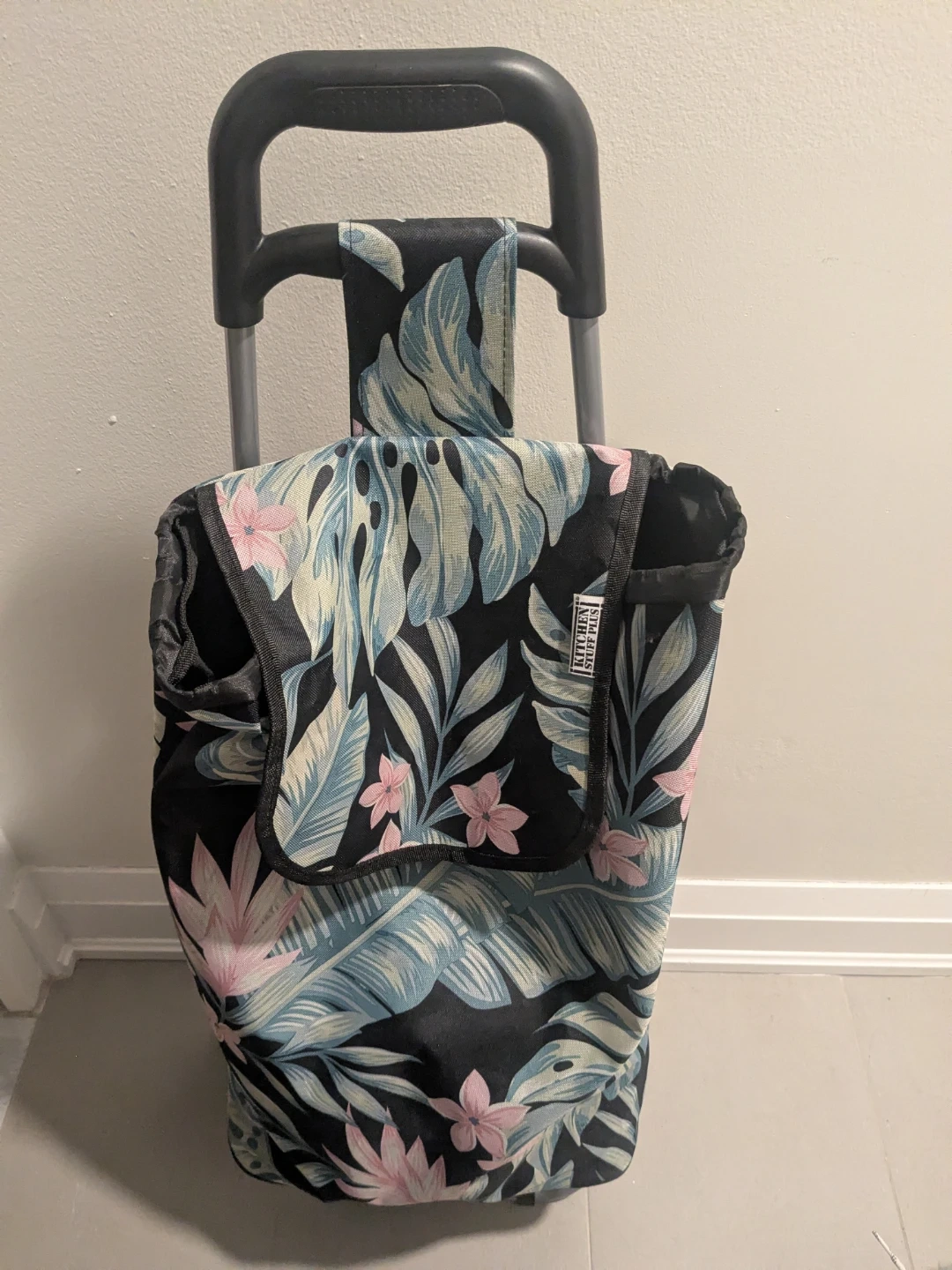This Kitchen Stuff Plus shopping cart features a lovely floral pattern. It's perfect for carrying groceries or other items with ease. The cart is in great condition and ready to go!