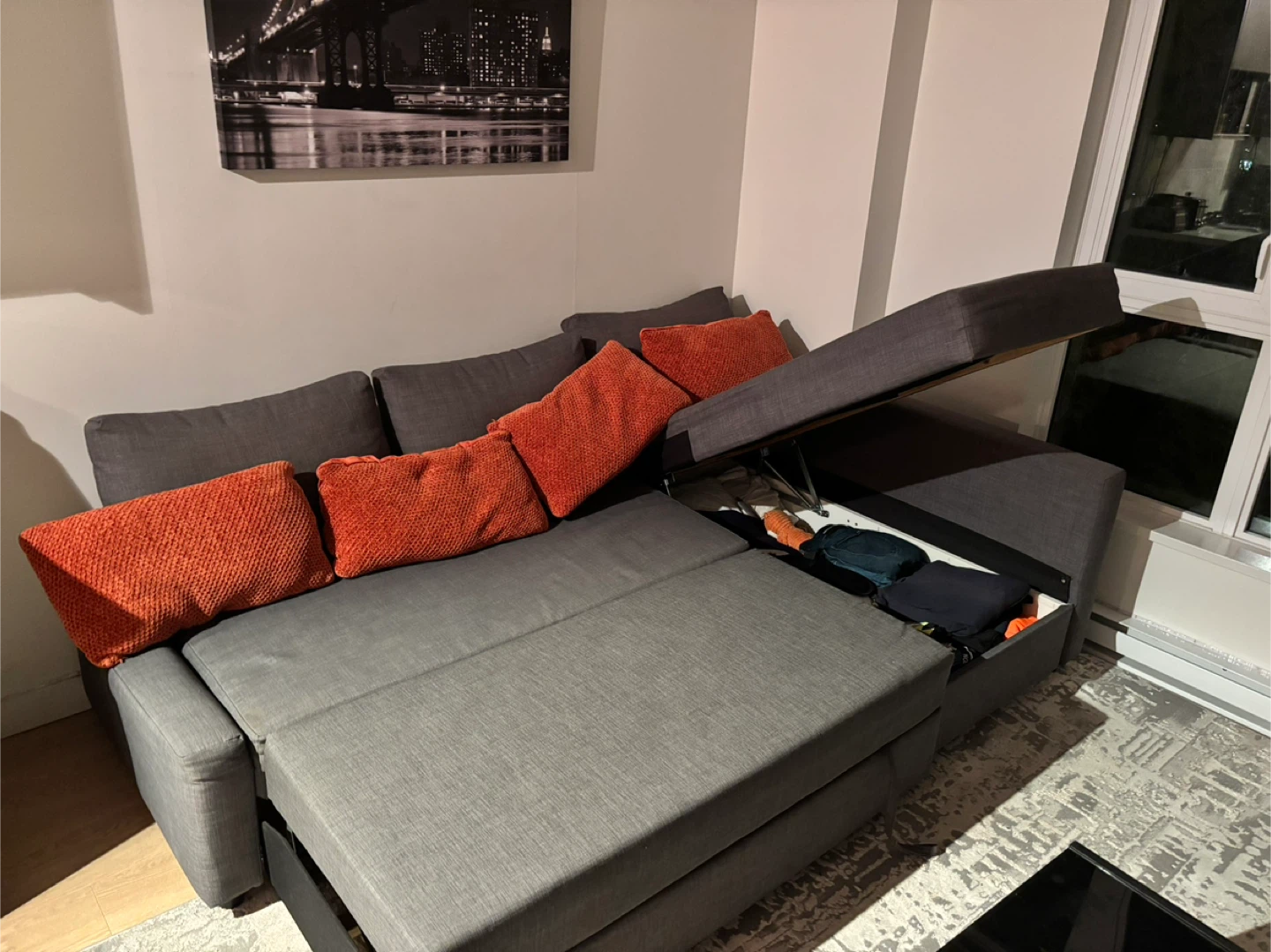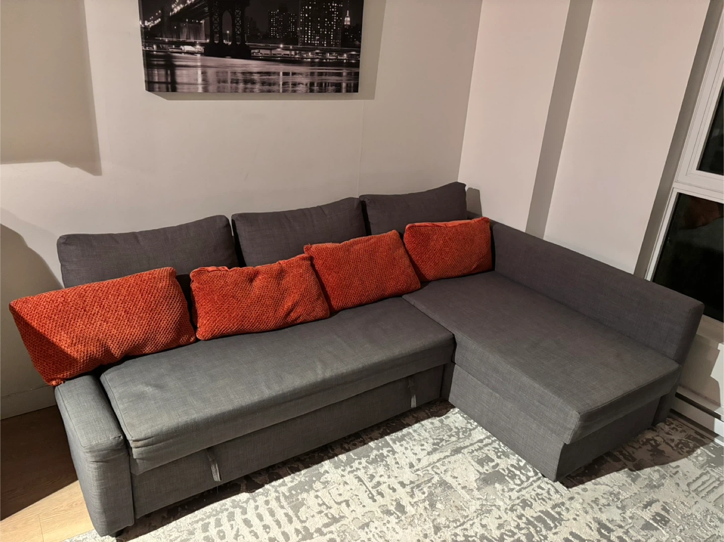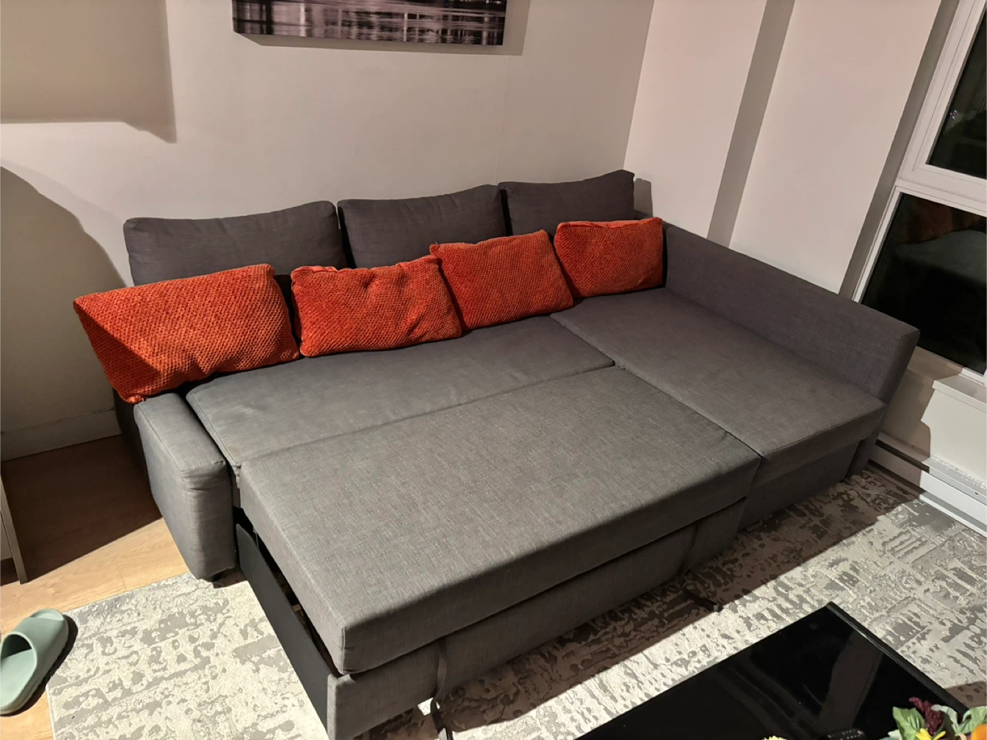 Selling a comfy grey sectional sofa! It features a convenient pull-out bed, perfect for guests or cozy movie nights. There's also storage space under the pull-out section for blankets or other items. It's in great condition and ready for a new home!