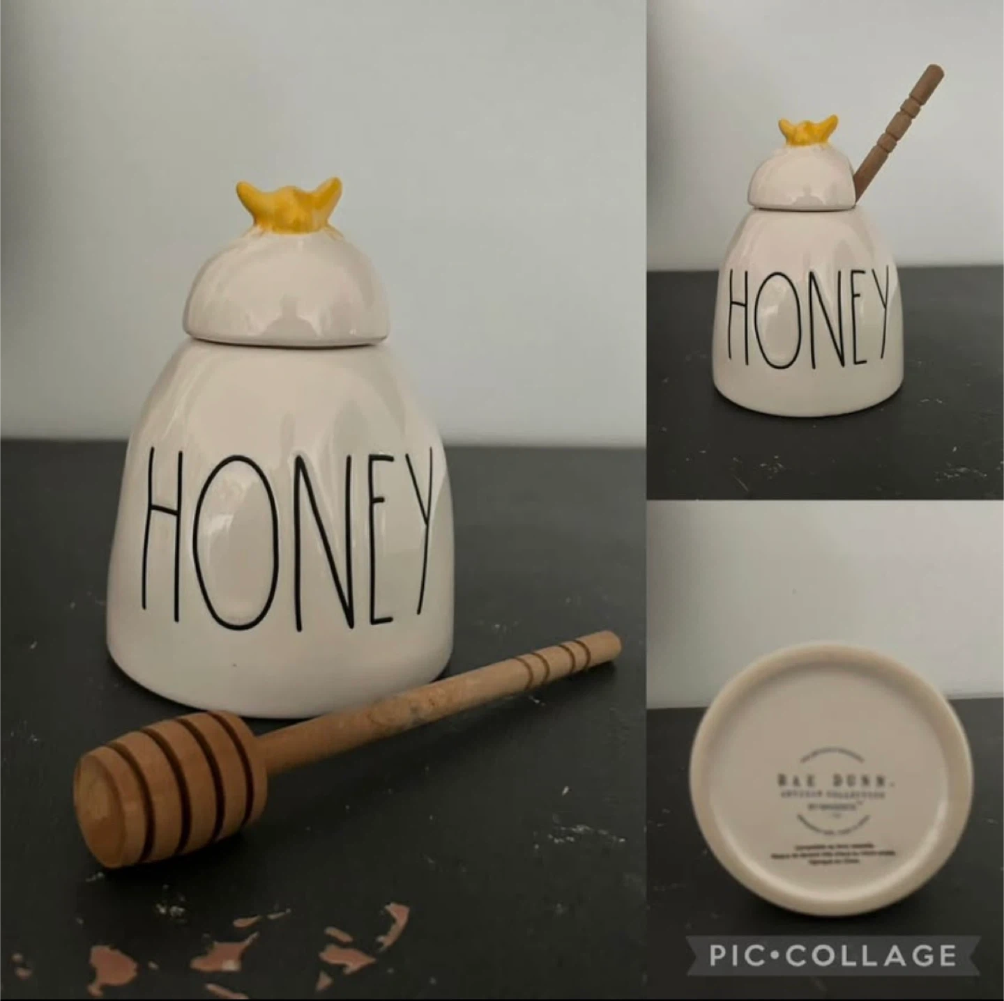 Selling a cute Rae Dunn honey pot with a dipper. It's in great condition and ready to add a touch of sweetness to your kitchen!