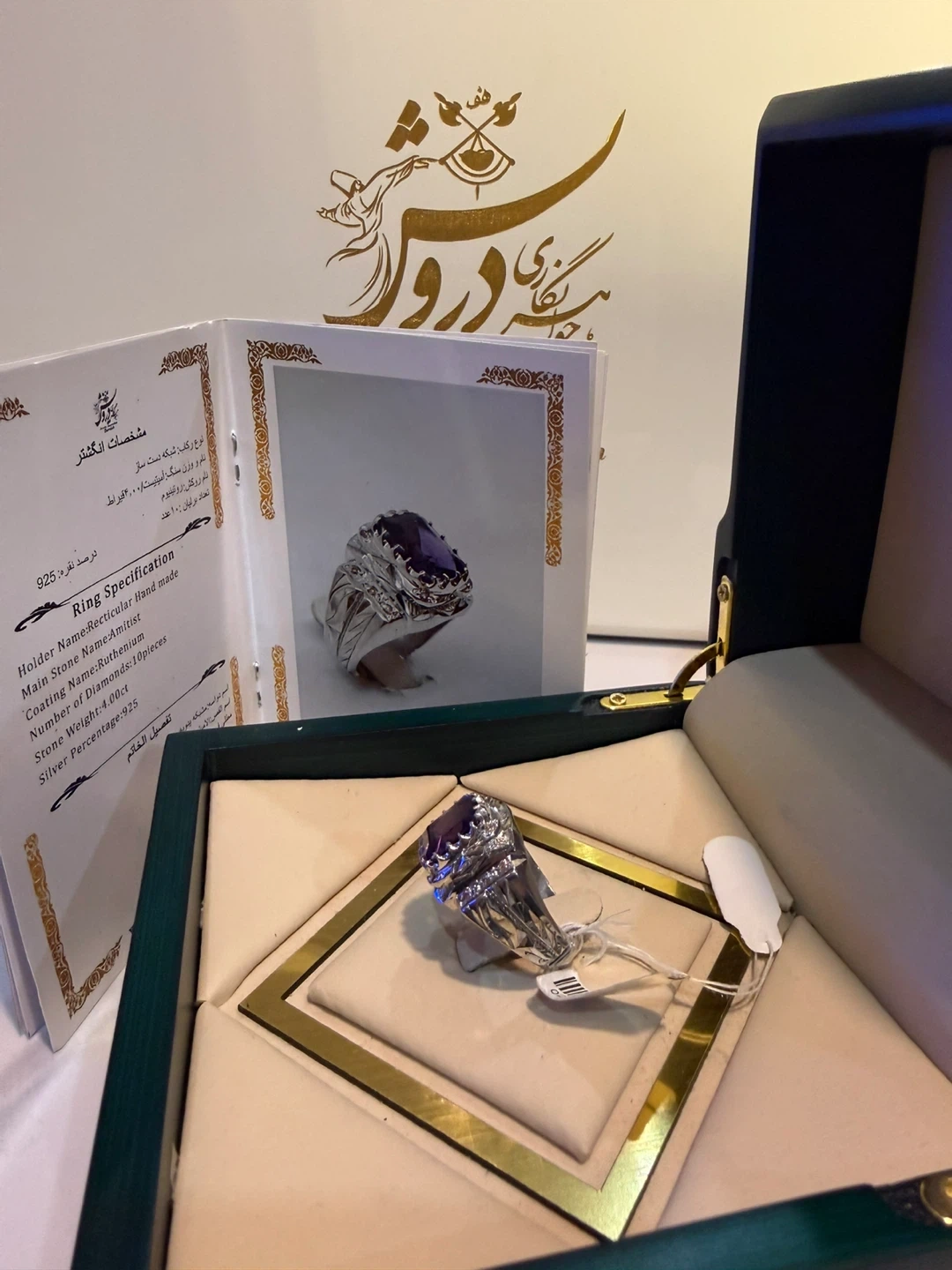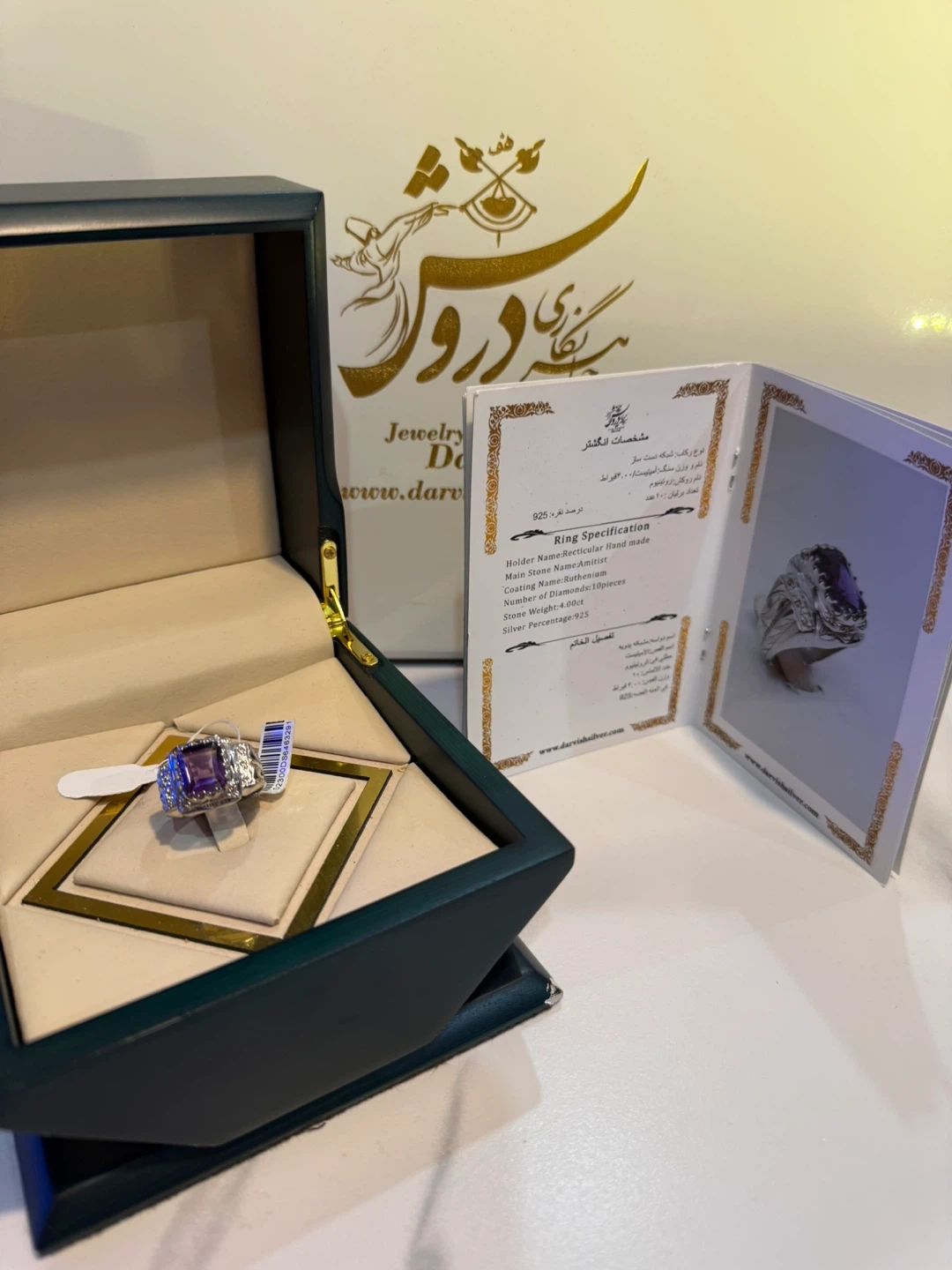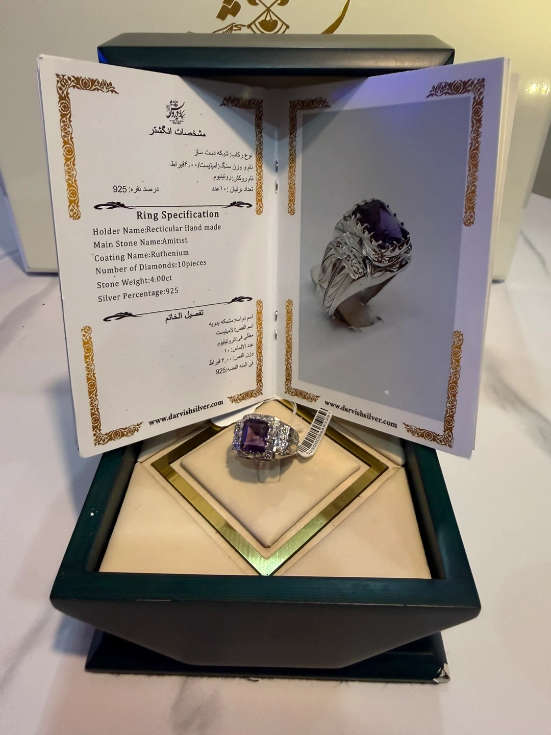 Selling a beautiful, handmade ring featuring an amethyst stone. The ring is set in 925 silver and has a coating of Ruthenium. It also has 10 diamonds!