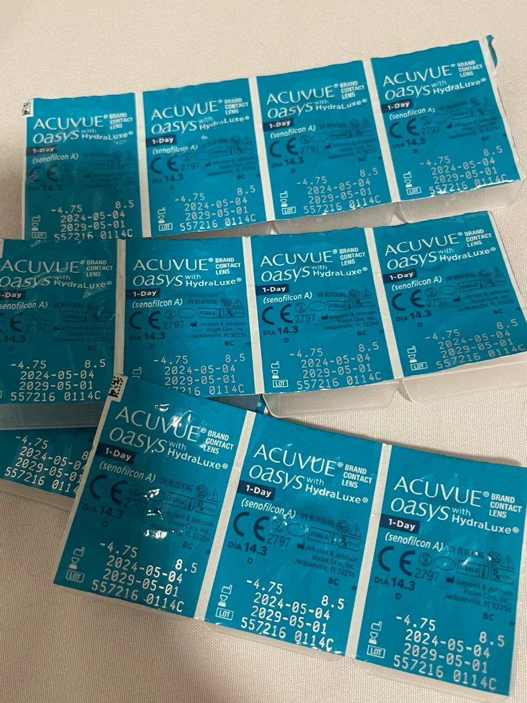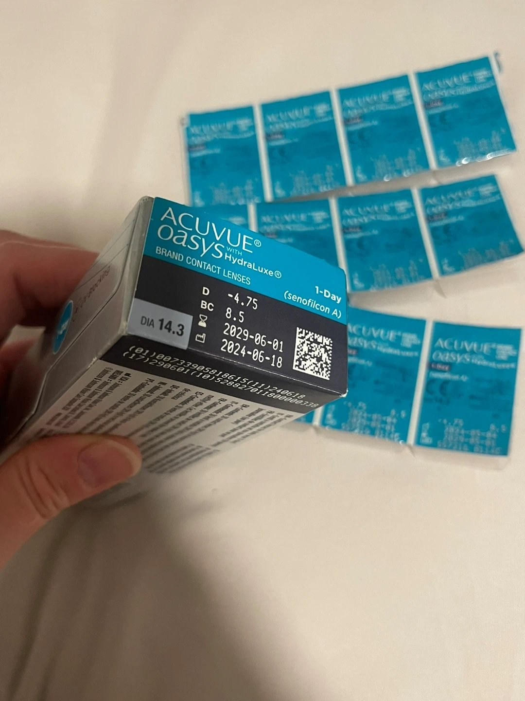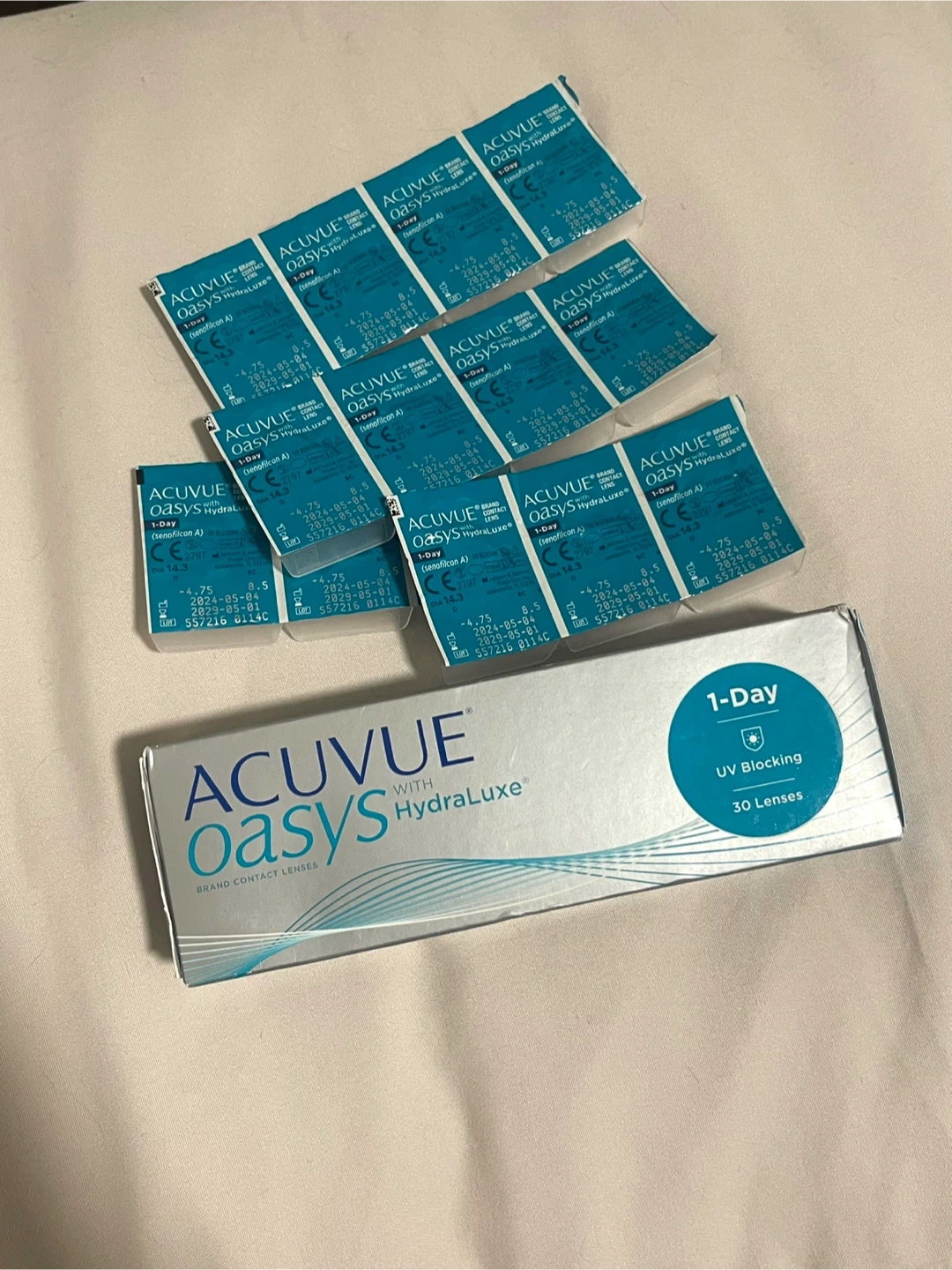Selling 43 Acuvue Oasys HydraLuxe 1-Day contact lenses. 1 unopened box containing 30 lenses + 13 single packs. My prescription changed so I’m selling these. All lenses expire year 2029.