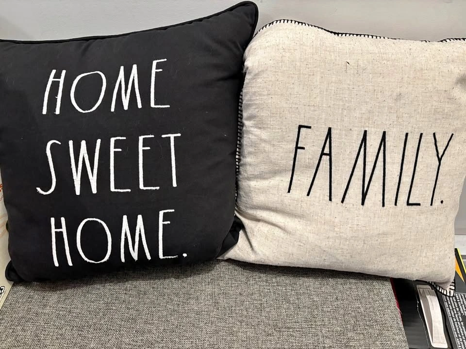 Gently used throw cushions with 'HOME SWEET HOME' and 'FAMILY' printed on them. From a smoke-free home. Available for pickup in Foxtrap CBS.