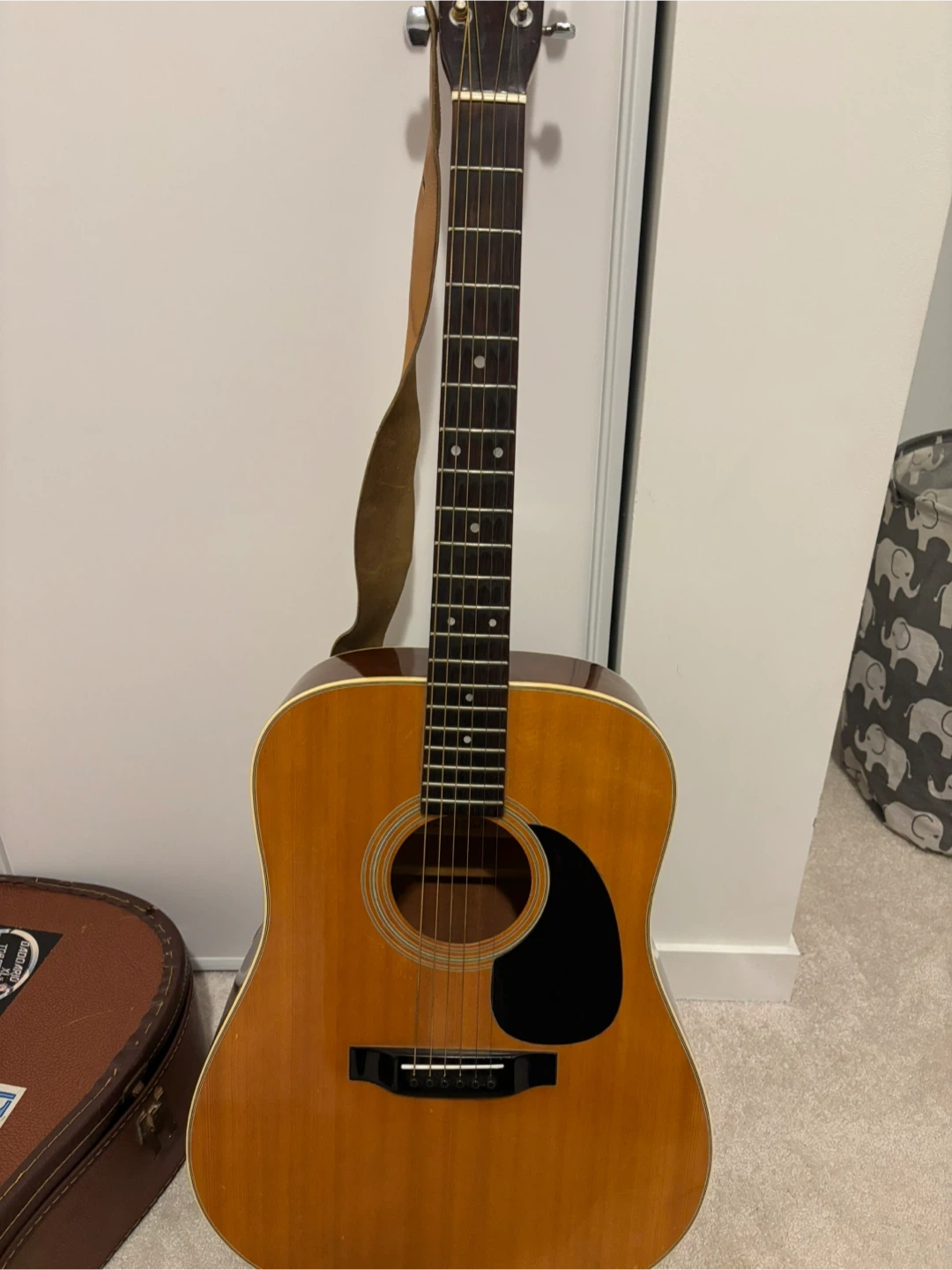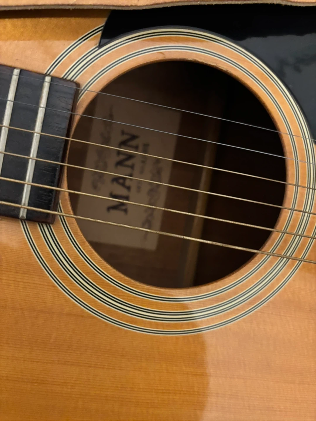 Selling a used Mann acoustic guitar. It's in good condition and ready for a new owner to enjoy making music! One string missing and may need replacement