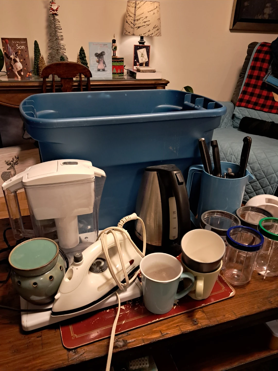 Selling a variety of household items! There's a Brita water filter pitcher, an iron, an electric kettle, some mugs, knives and cutlery...bodyweight scale ...scentsy aroma wax melt...all combined Rubbermaid container.....will walk it right to your vehicle