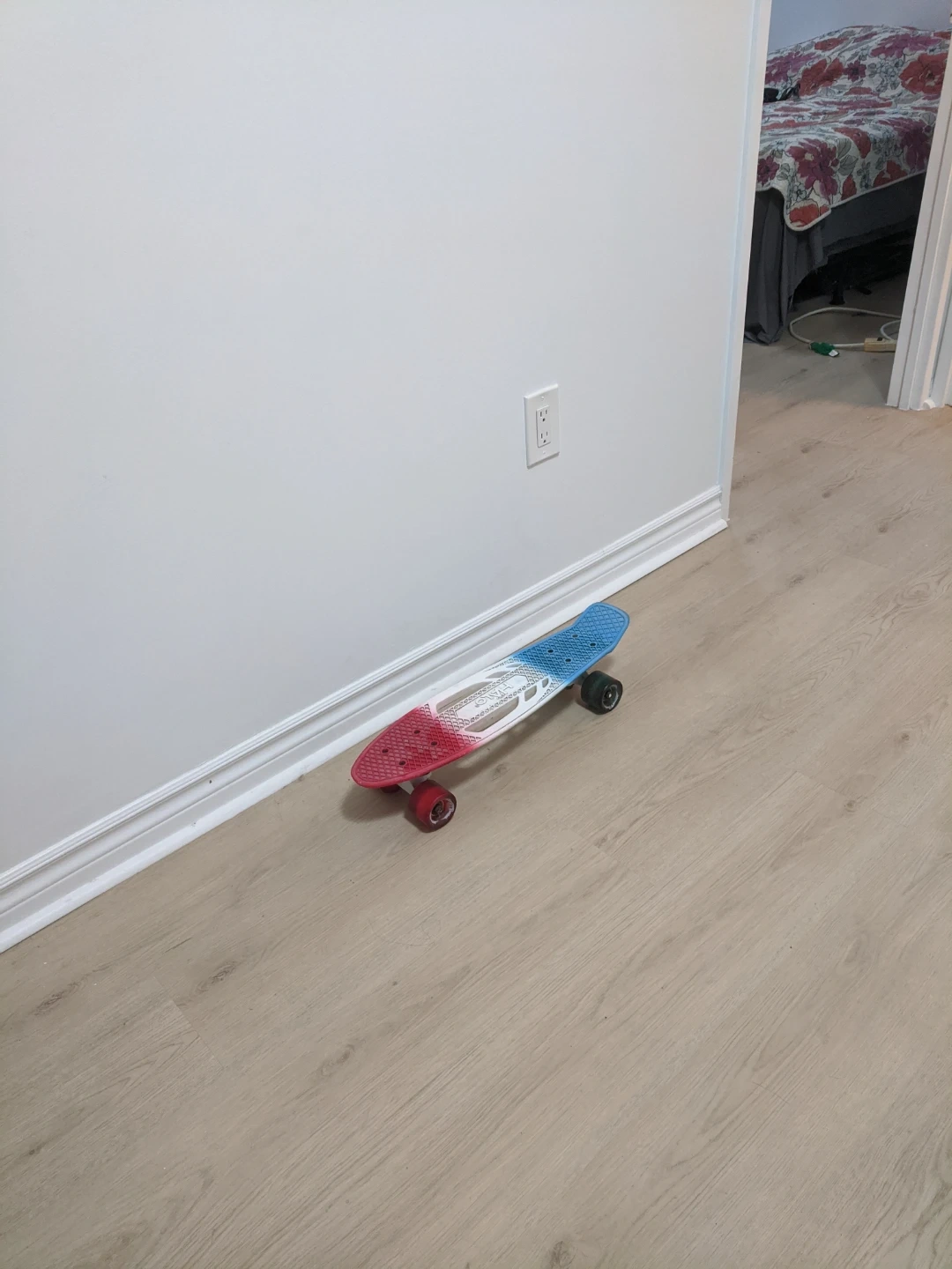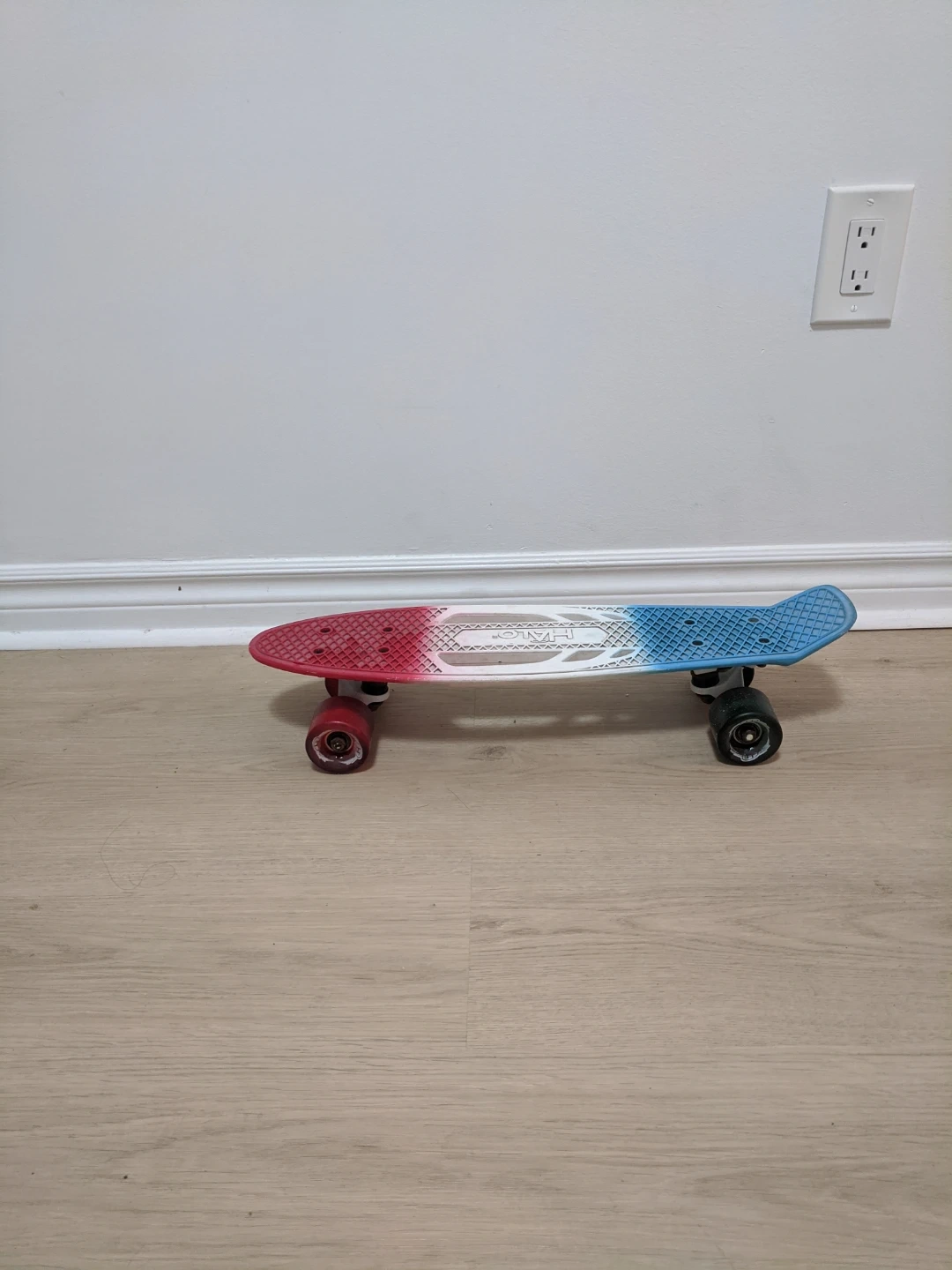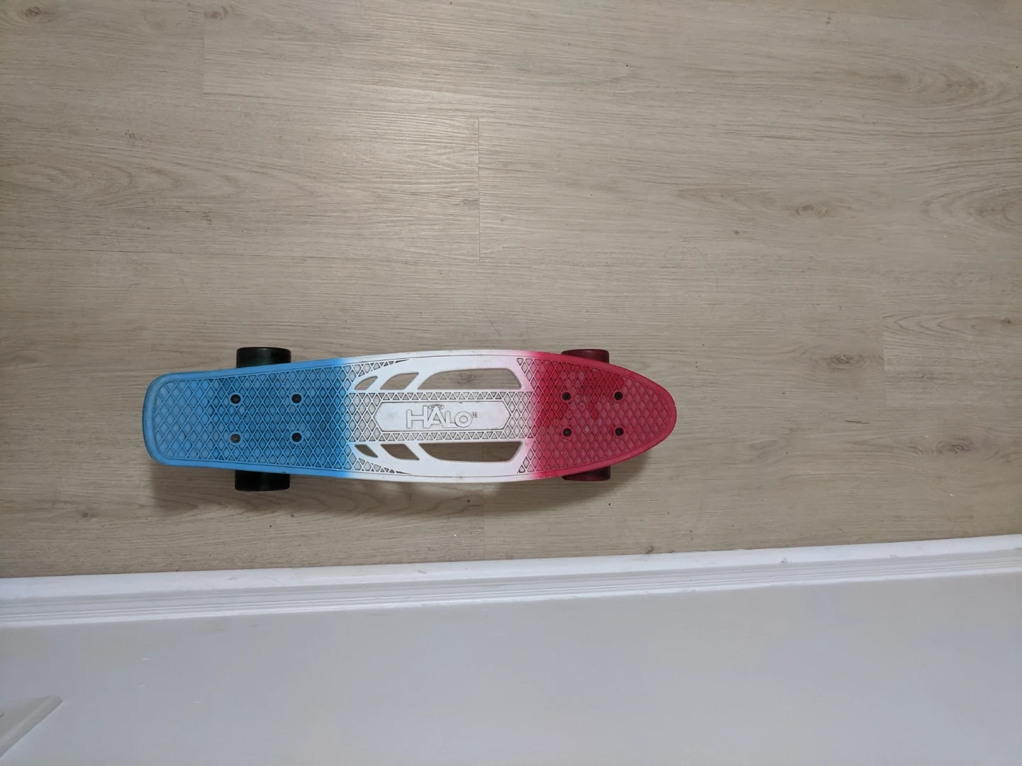Selling a Halo skateboard in red, white, and blue. It's in great shape and ready for some fun! Used but in good condition. The length is 22.5".