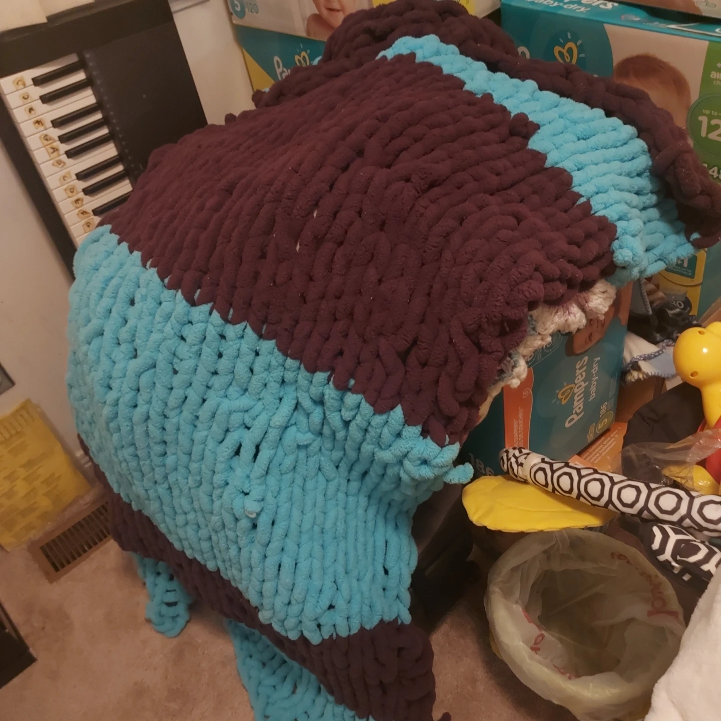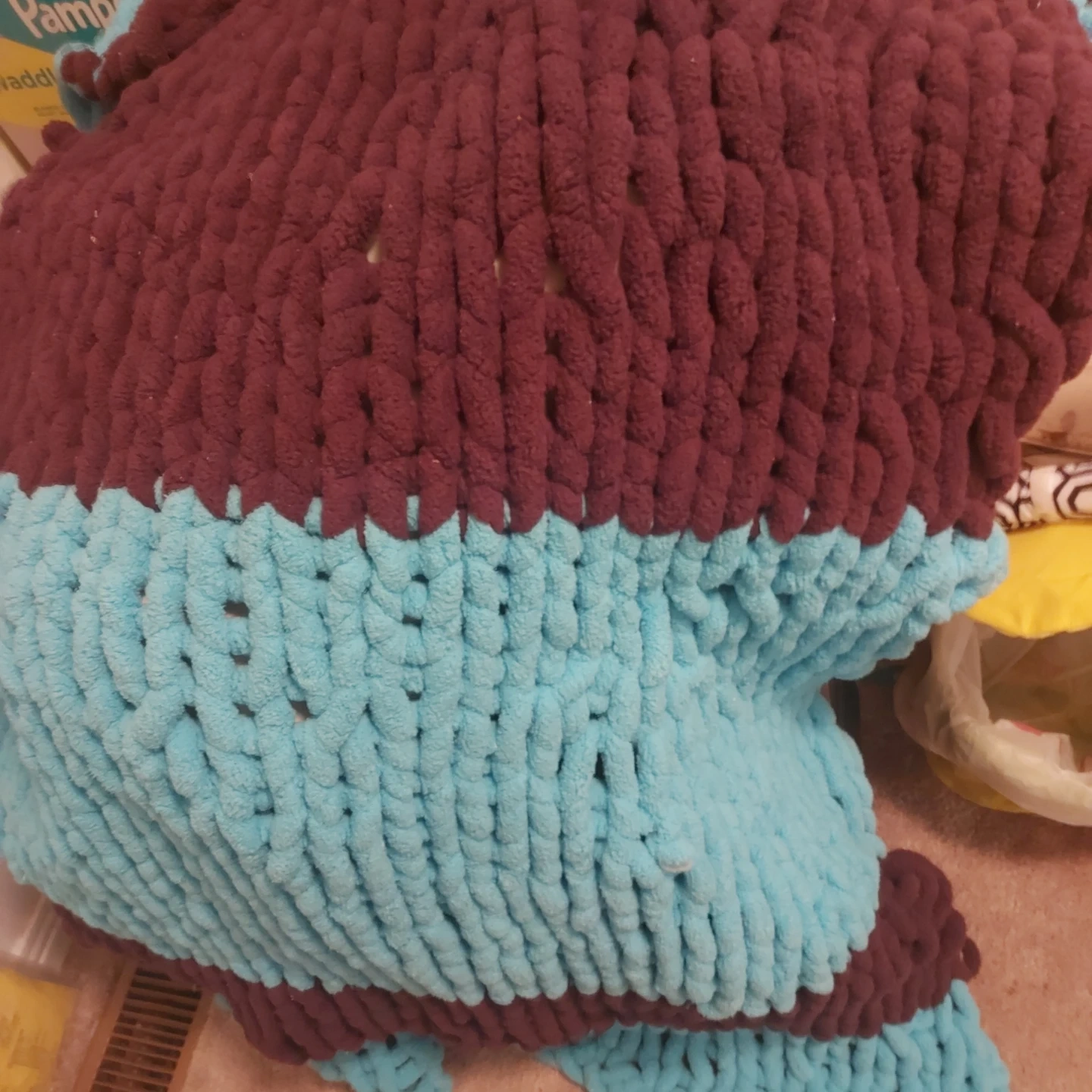 Cozy up with this chunky knit blanket! It features a unique two-tone design with a mix of brown and turquoise. Perfect for adding a touch of warmth and style to any room
