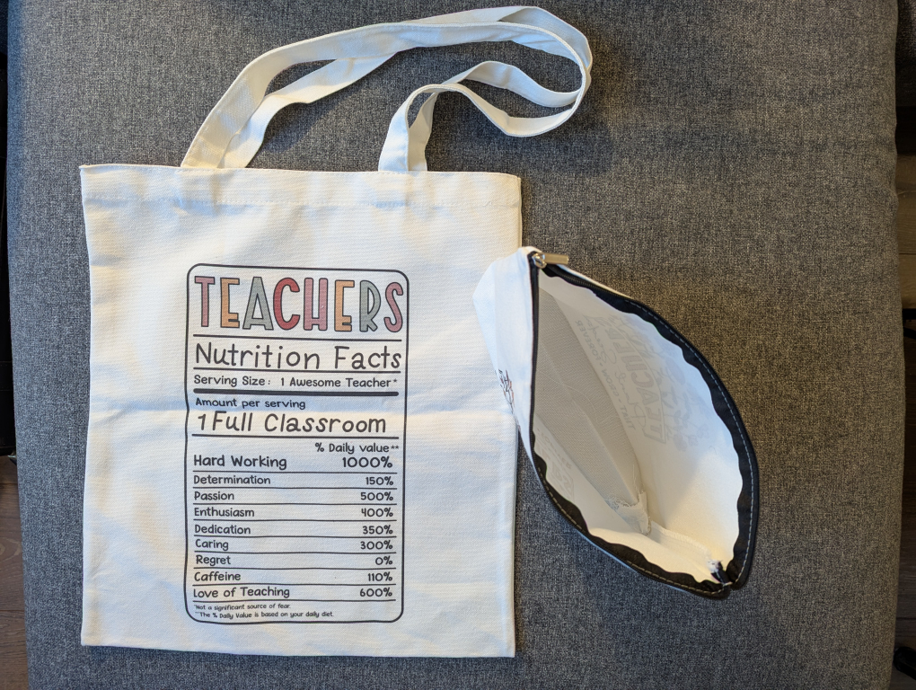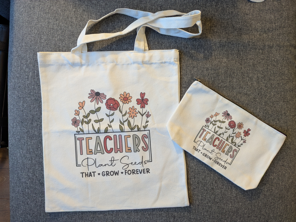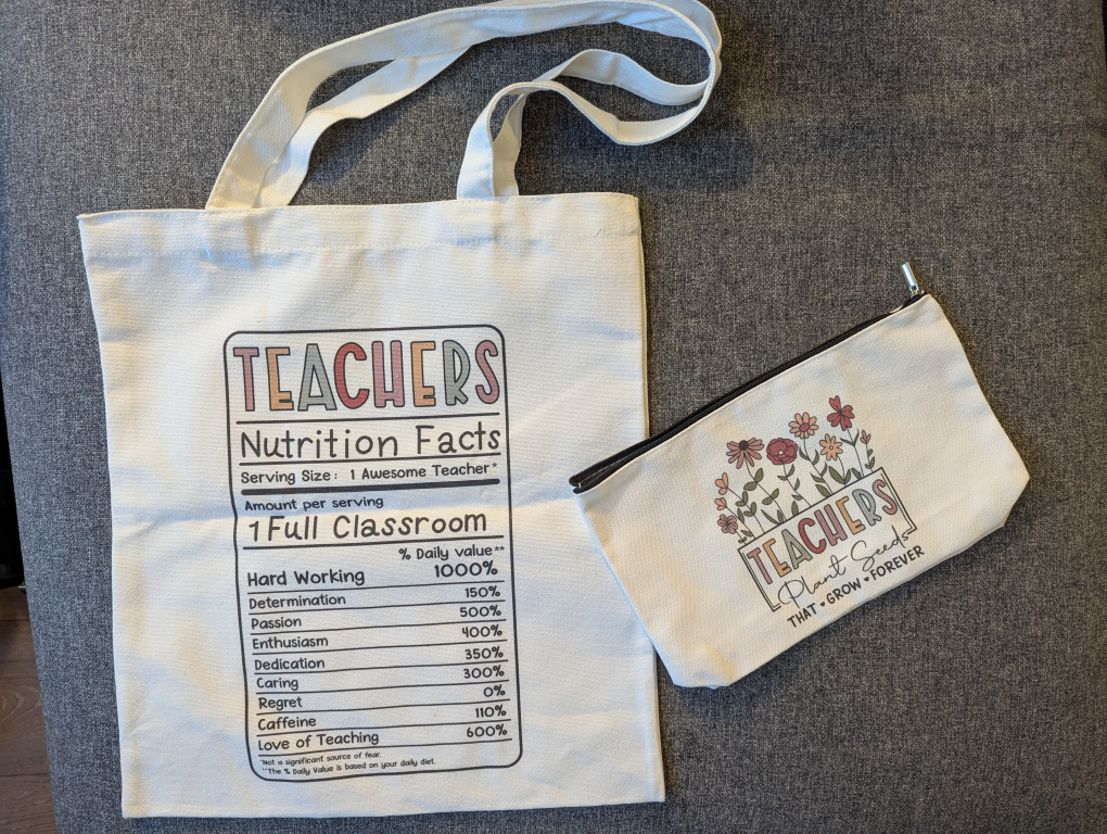 Here's a cute tote bag and pouch set for teachers! The tote bag has a fun 'Nutrition Facts' design, and the pouch has a 'Teachers Plant Seeds' design. Perfect gift for a teacher!