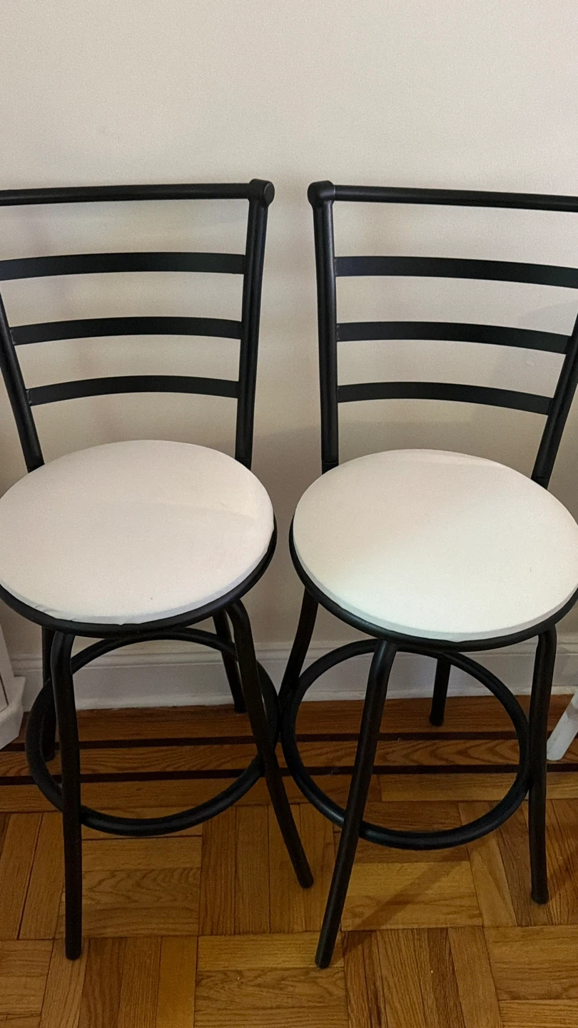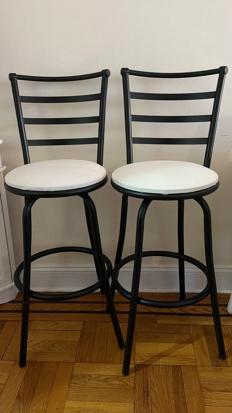 Selling a set of two bar stools! They feature a black metal frame with a white seat. These stools would be perfect for a kitchen island or bar area