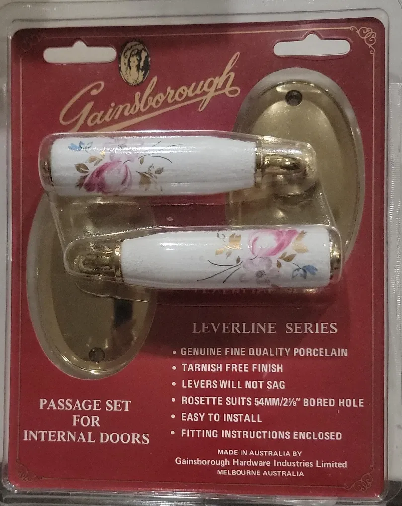 Selling a Gainsborough Leverline Series passage set for internal doors! It features genuine fine quality porcelain and a tarnish-free finish. The levers won't sag, and the rosette suits a 54mm/2 1/8" bored hole. Easy to install with fitting instructions enclosed. Made in Australia by Gainsborough Hardware Industries Limited