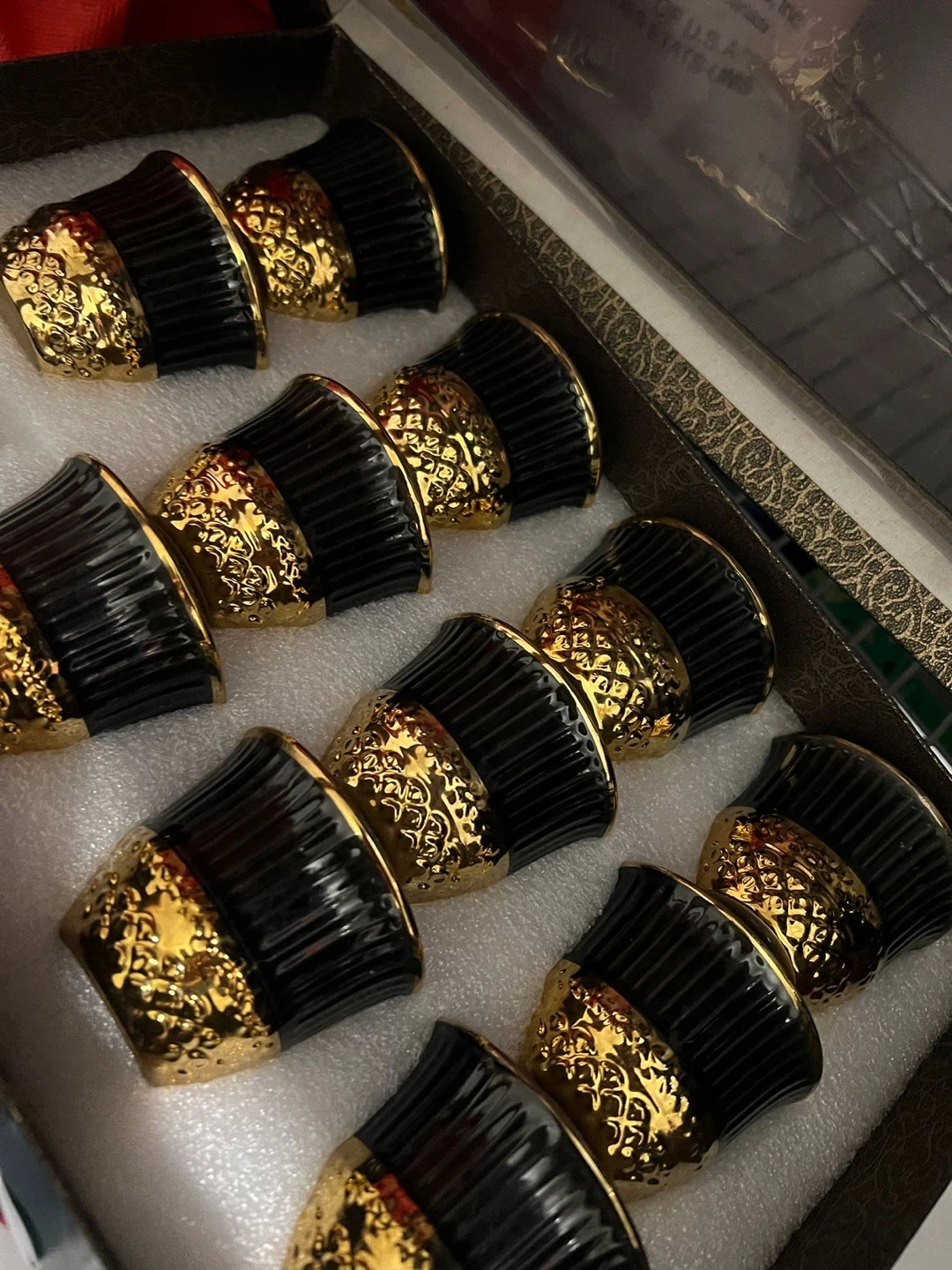 Selling a beautiful set of 12 Turkish coffee cups! They're black with gold detailing and come in their original box. Perfect for adding a touch of elegance to your coffee routine or for entertaining guests