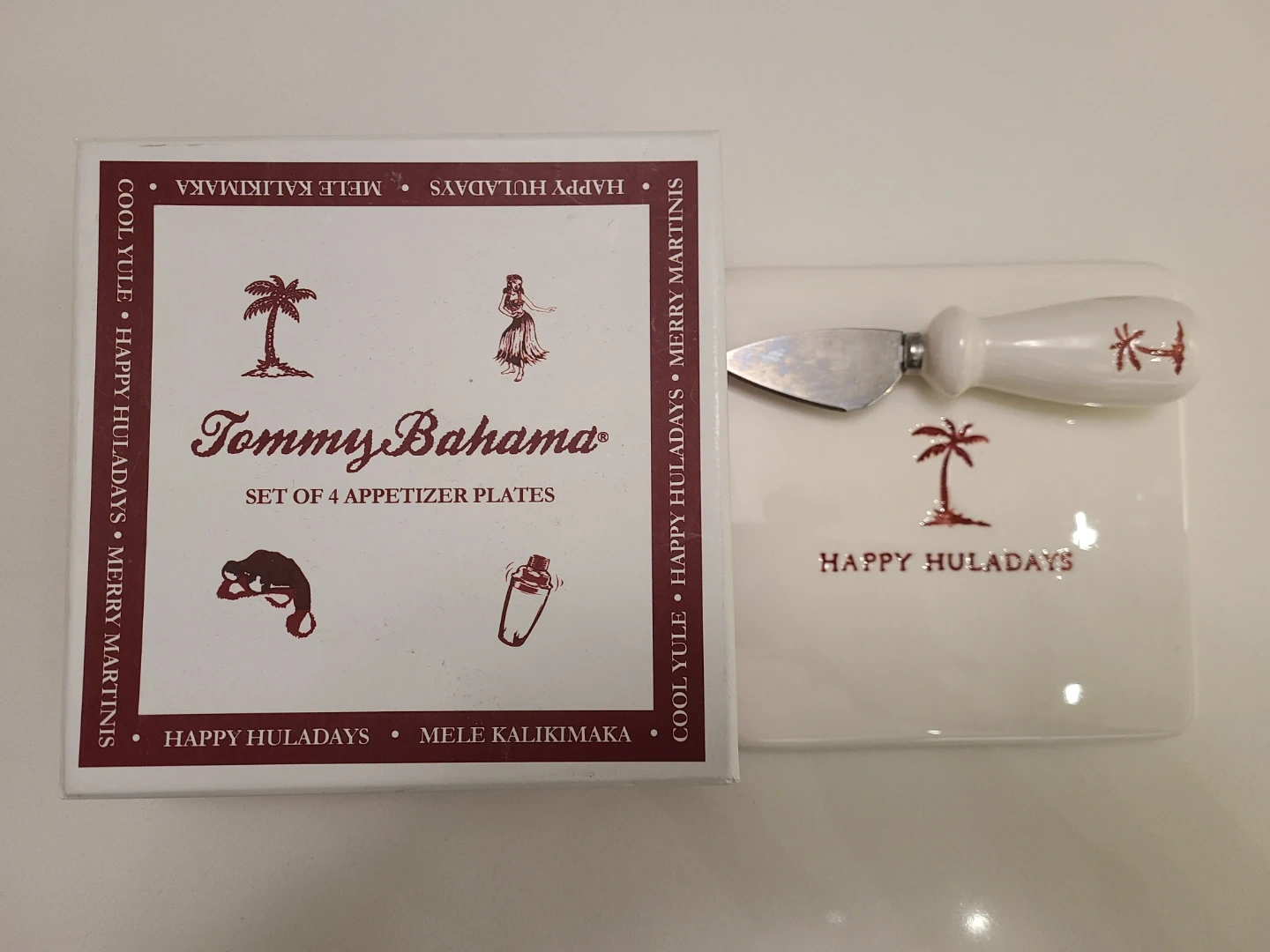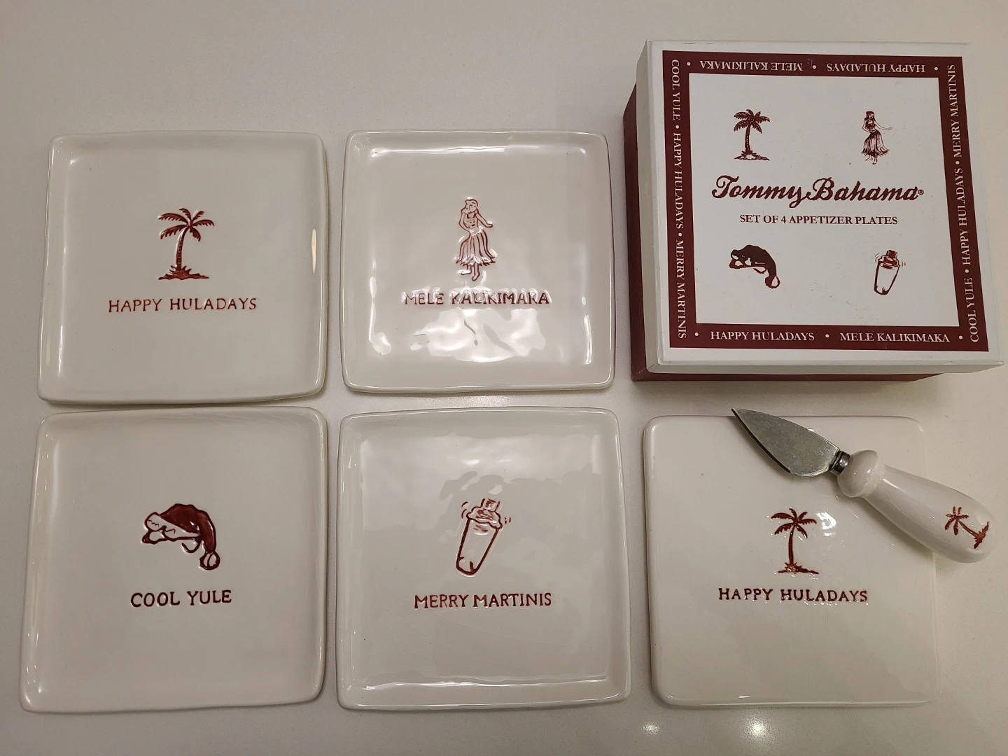 Add a touch of island charm to your gatherings with this set of Tommy Bahama appetizer plates and cheese tray with knife. This set includes four unique designs with festive themes like "Happy Huladays," "Mele Kalikimaka," "Cool Yule," and"Merry Martinis". Perfect for adding a splash of fun to any occasion.