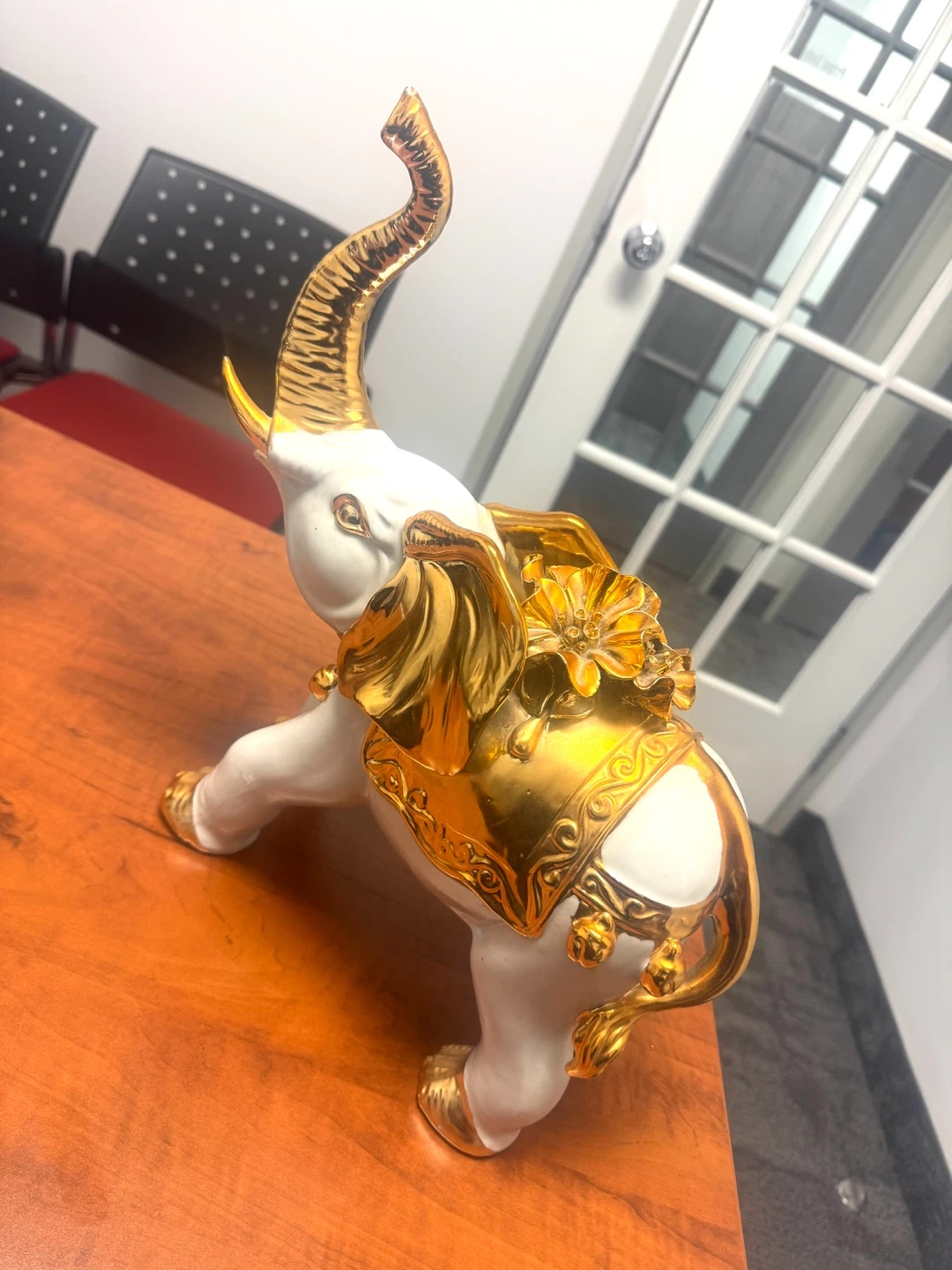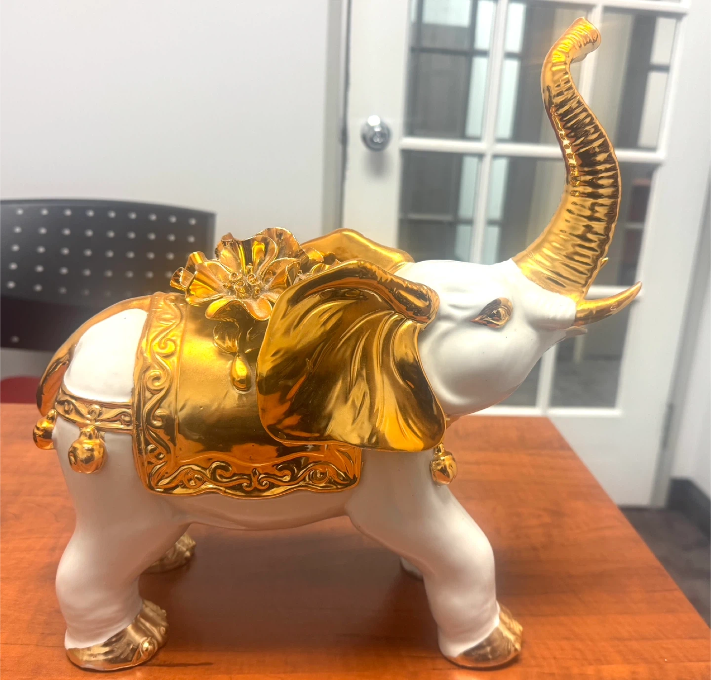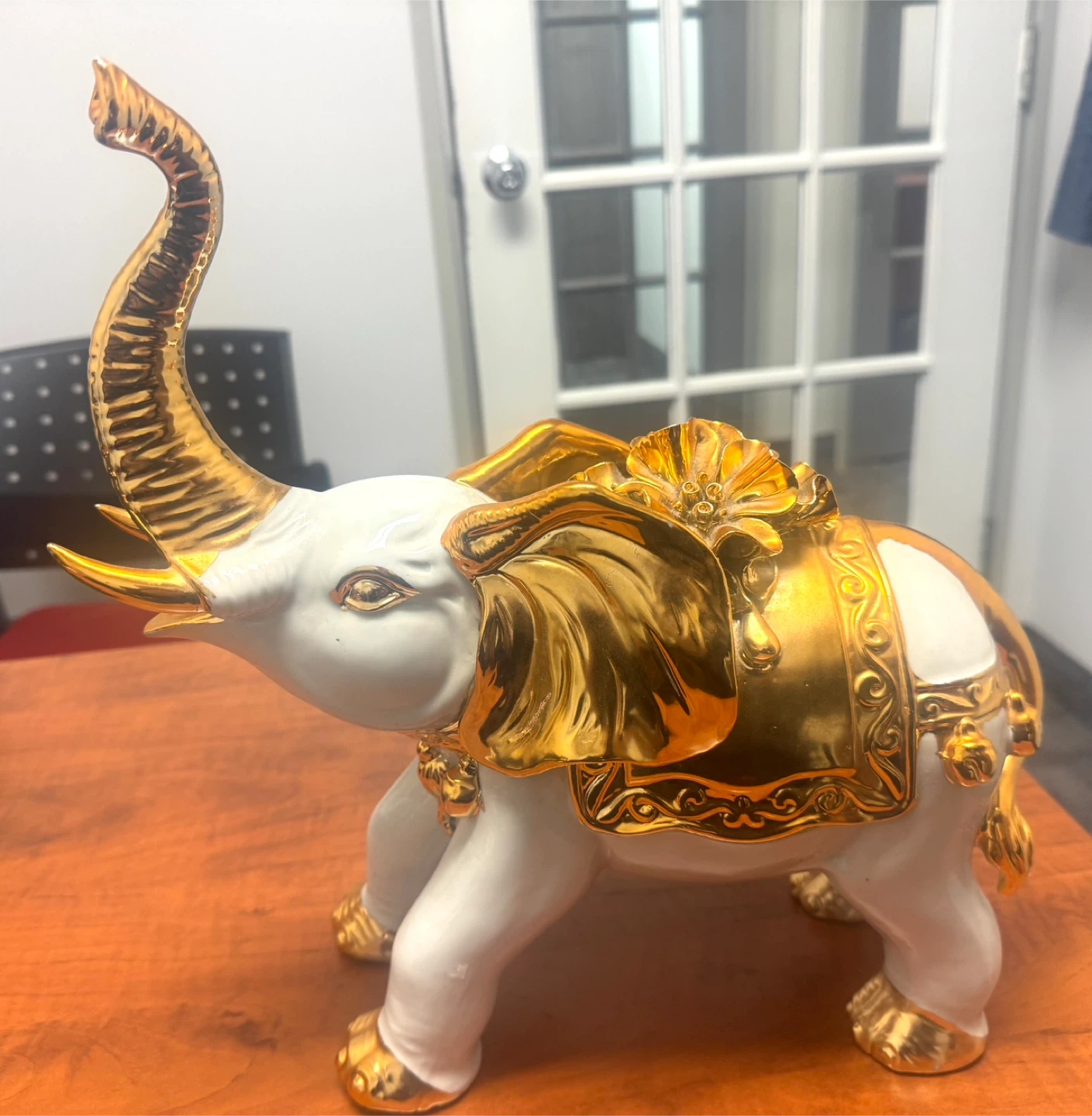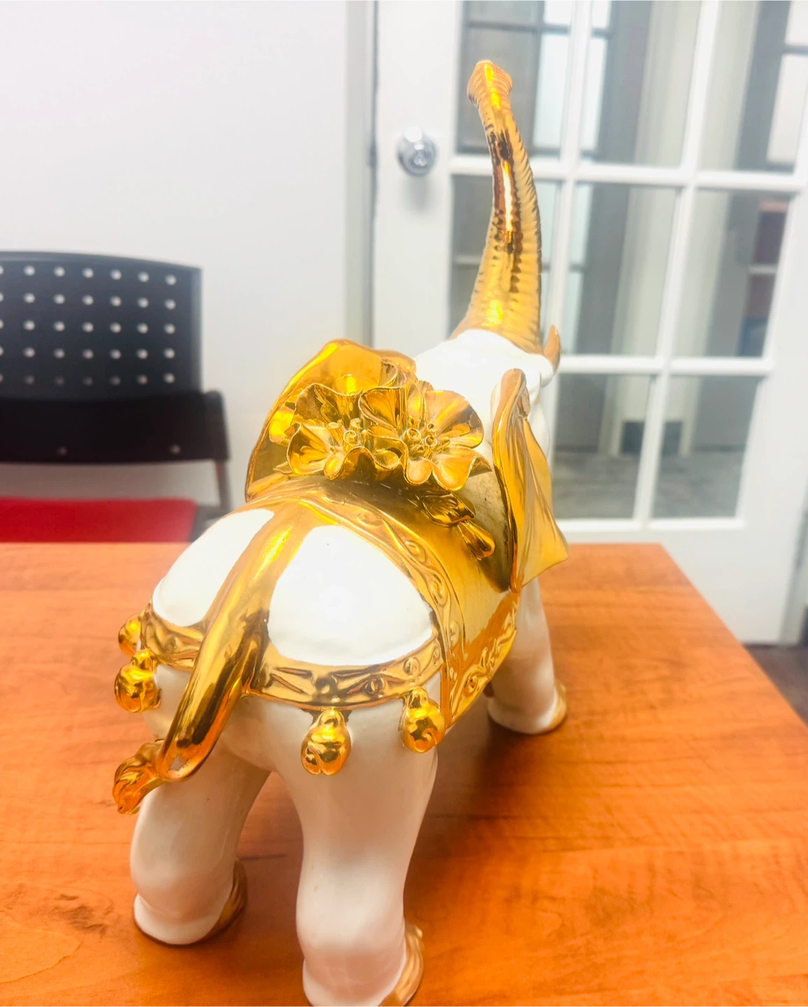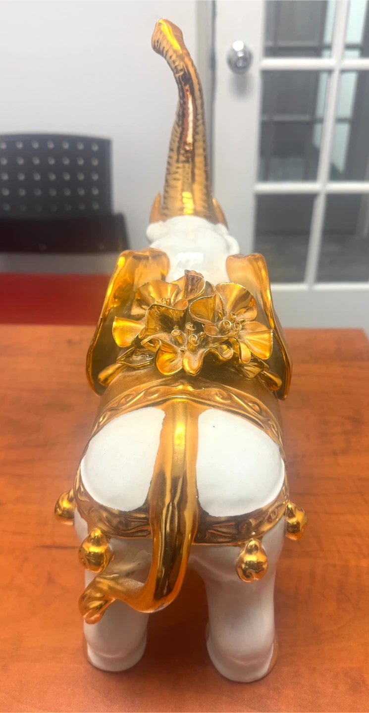 Here's a lovely decorative elephant figurine! It's white with gold accents and would look great on a shelf or table.