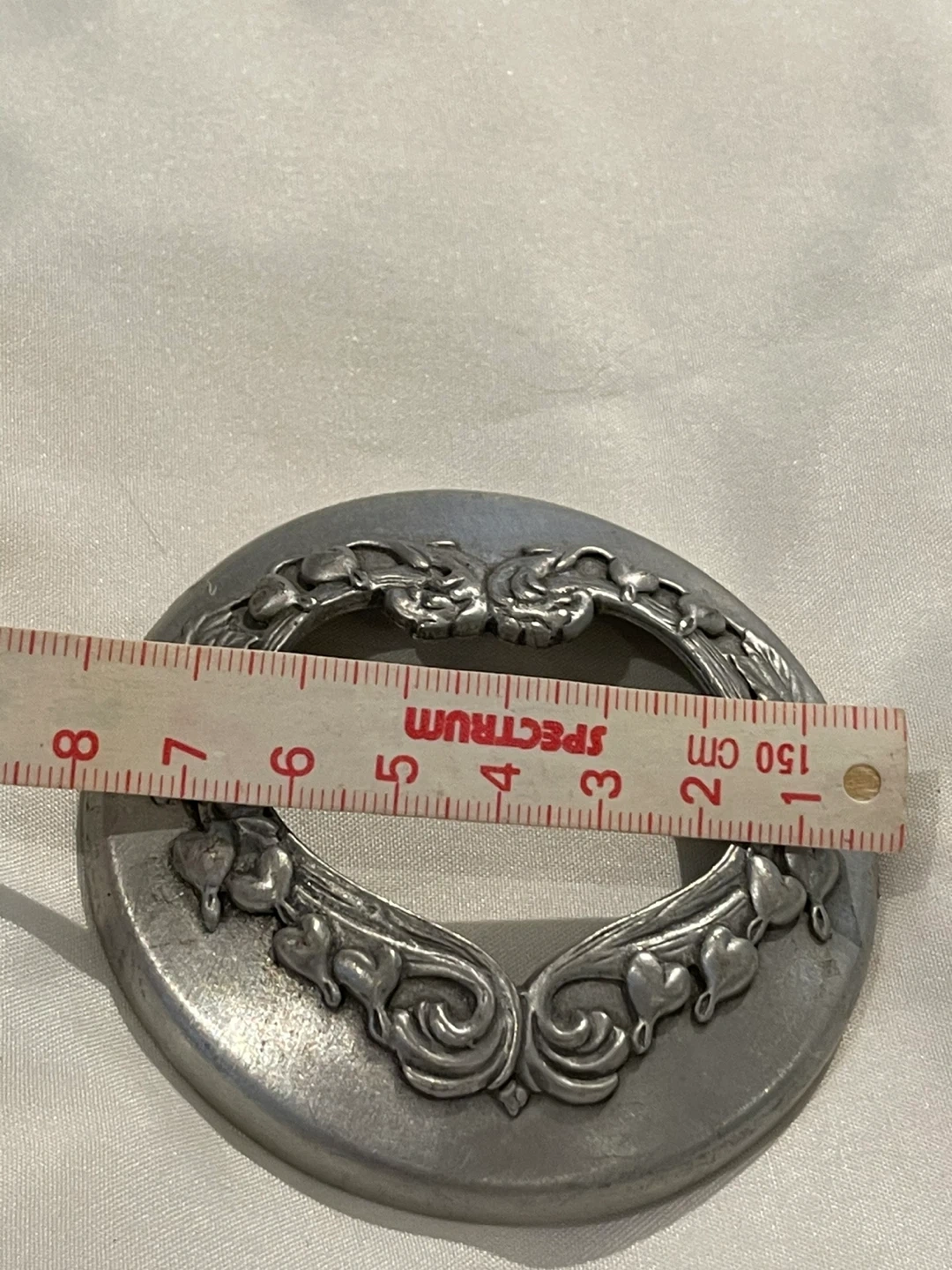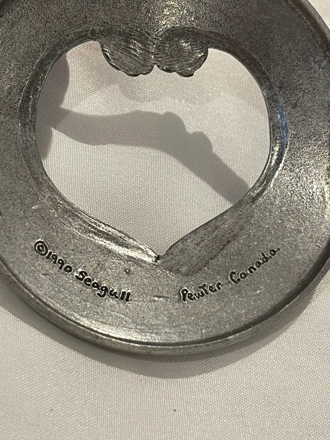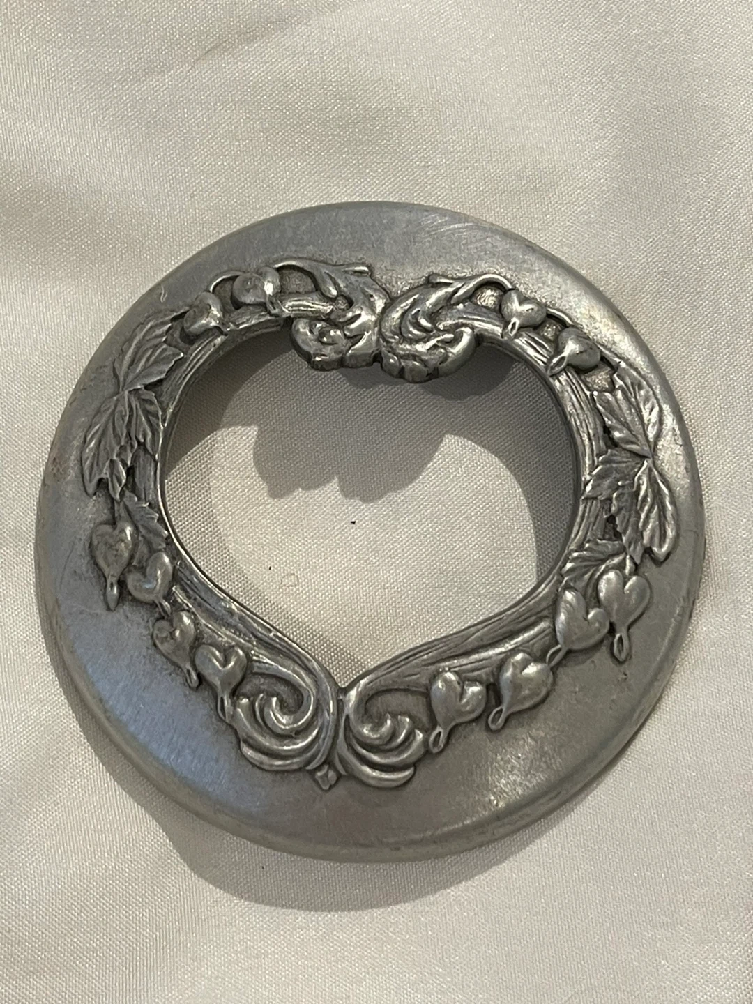 Selling a Seagull Pewter ornament, used for a jar top , made in Canada! It's a heart-shaped design with floral details. The ornament measures approximately 6 cm in diameter.