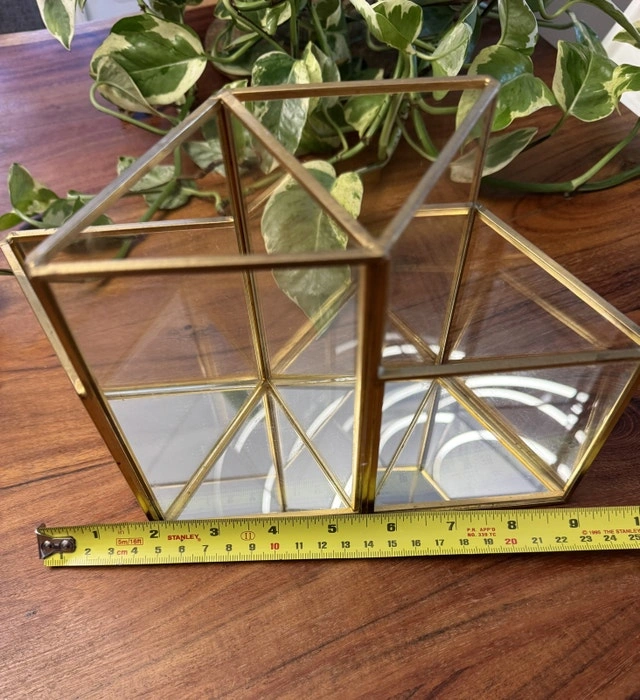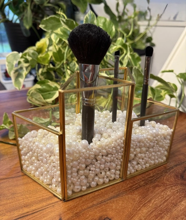 BRUSHES NOT INCLUDED. Includes gold organizer and beads. Can be used for make up / brushes, pens, etc. Different sized beads help hold upright items in place. Glass / bronze / mirrored desk organizer. approx 9” wide x 6” tall. Includes 3 x assorted size plastic beads from Michael’s (white and pearl). Price is firm. Pick up in St vital near Avalon and River.