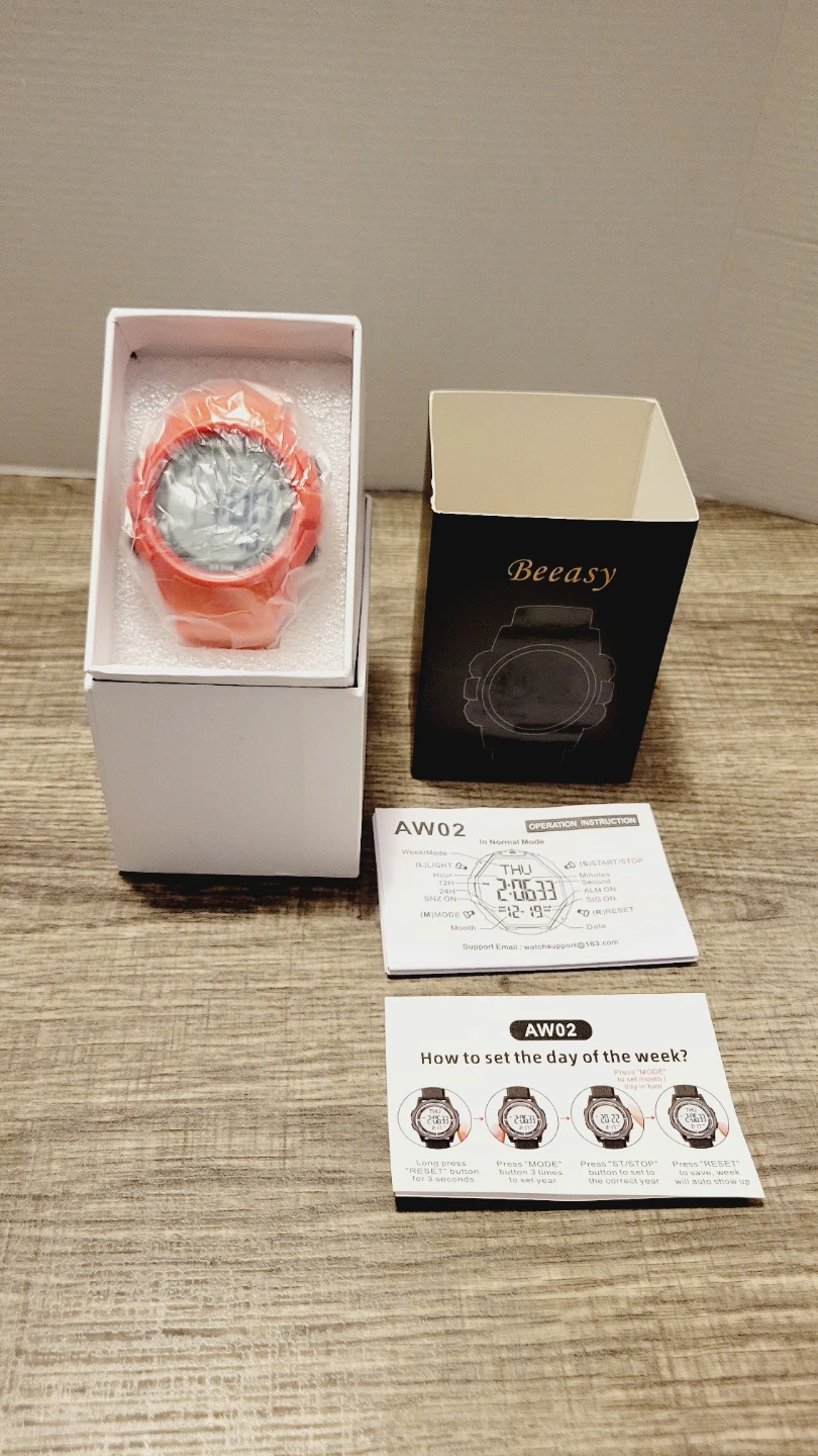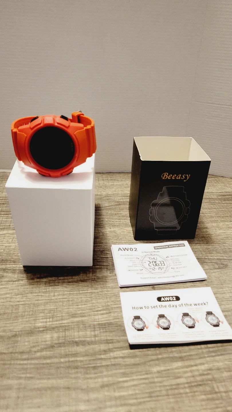 Selling a brand new Beeasy AW02 digital watch in orange! It comes with its original box and instructions. This watch is perfect for everyday wear and has a sporty look. Get it now!