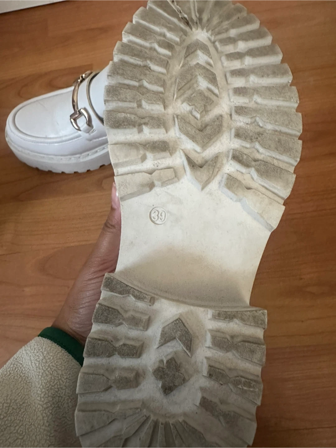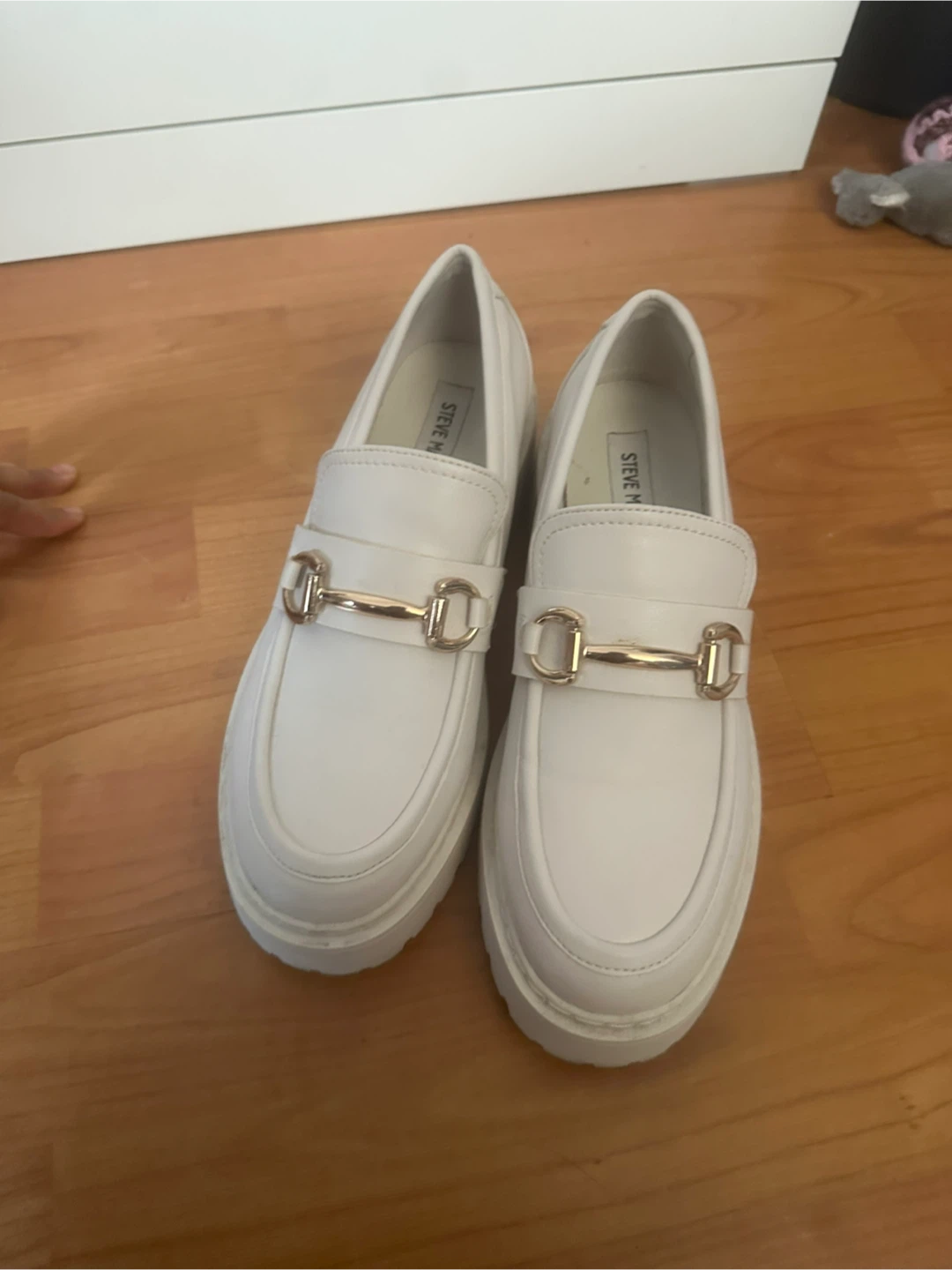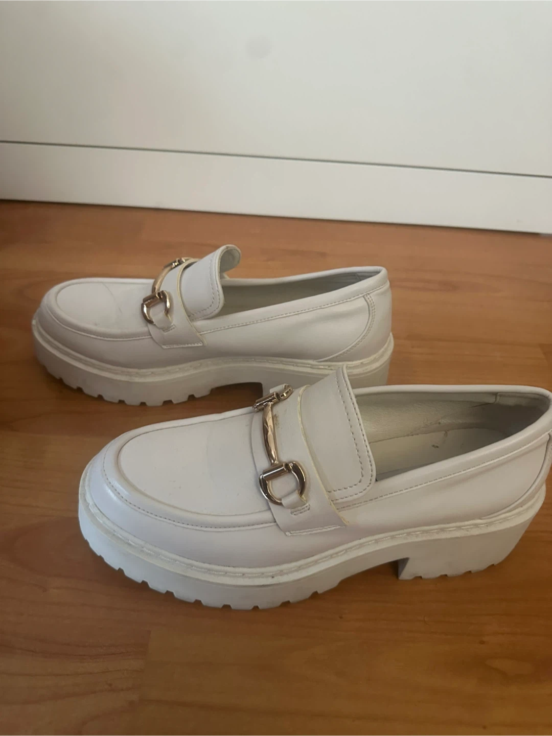 Selling a pair of Steve Madden white leather loafers in size 9 (39 EU). They're in good condition and have a cool, chunky sole. Perfect for adding a bit of edge to any outfit!