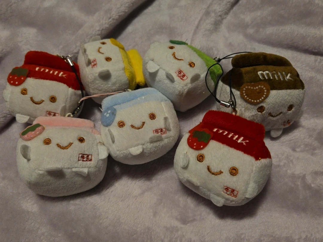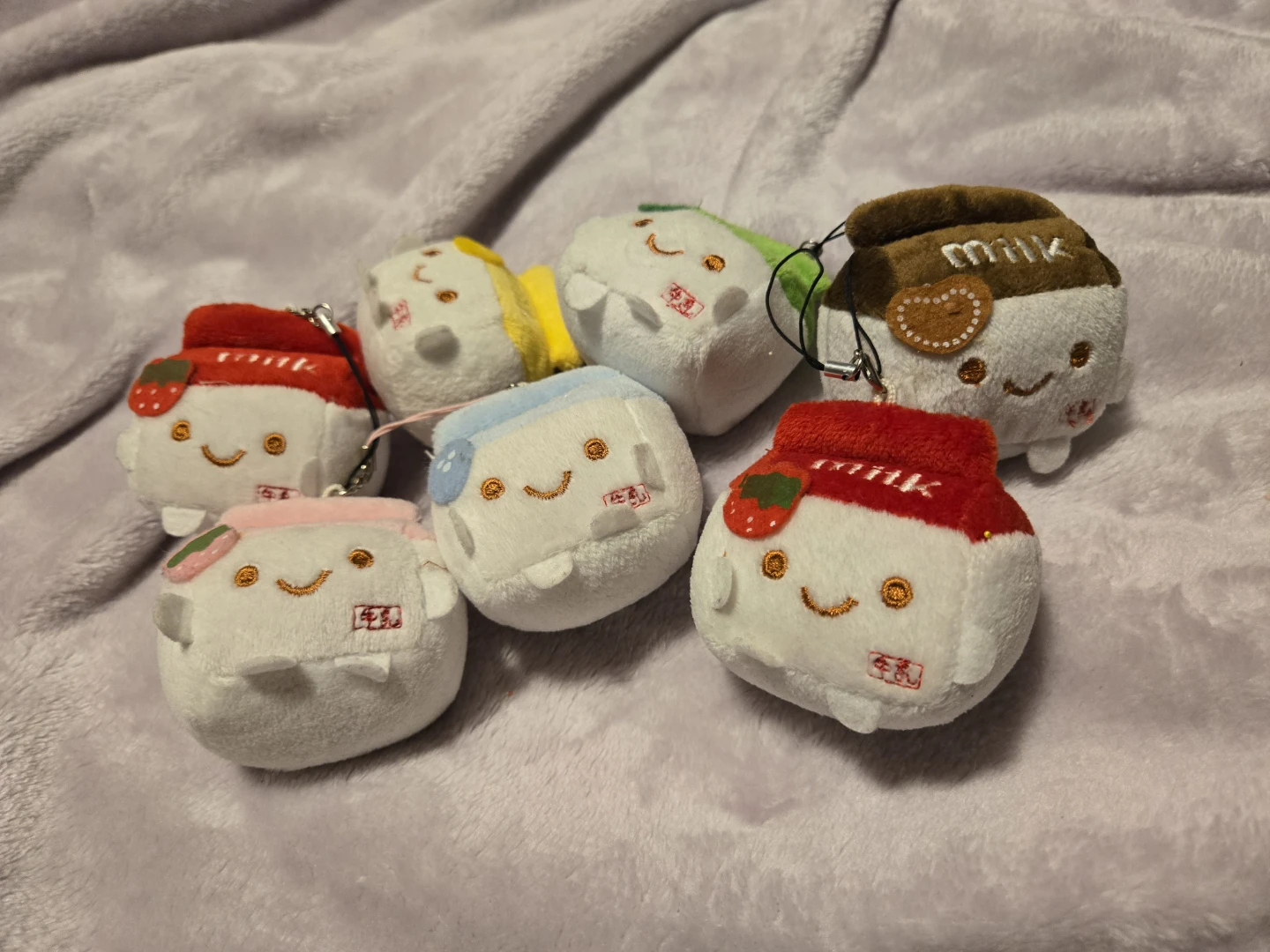 Selling a collection of adorable milk carton plush charms that can hang on your phone! They're all in great condition and ready to brighten up your day. Each one has a unique little design, making them super cute and collectible. Full set is 6 : red, pink, blue, green, yellow & brown +Extra red