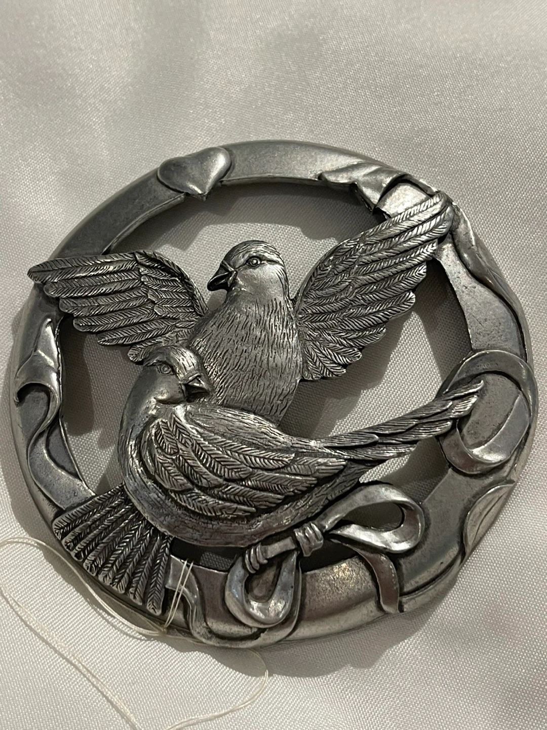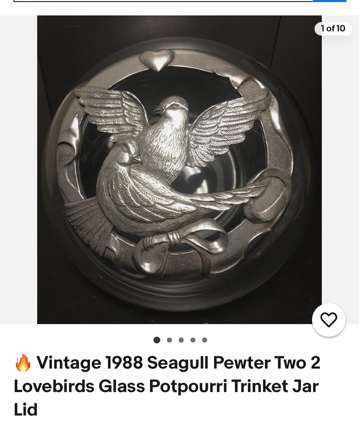 This is a beautiful vintage 1988 Seagull Pewter trinket jar lid featuring two lovebirds. It's in great condition and would make a lovely addition to any home.