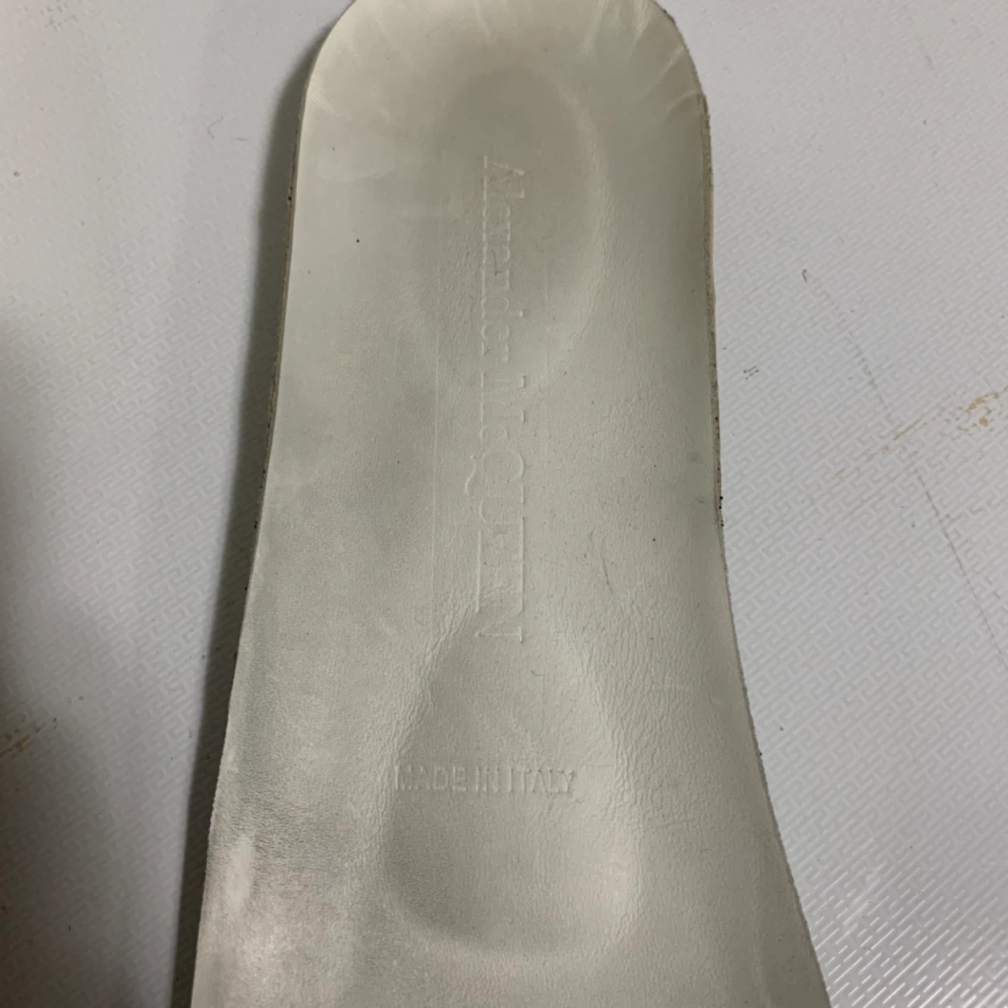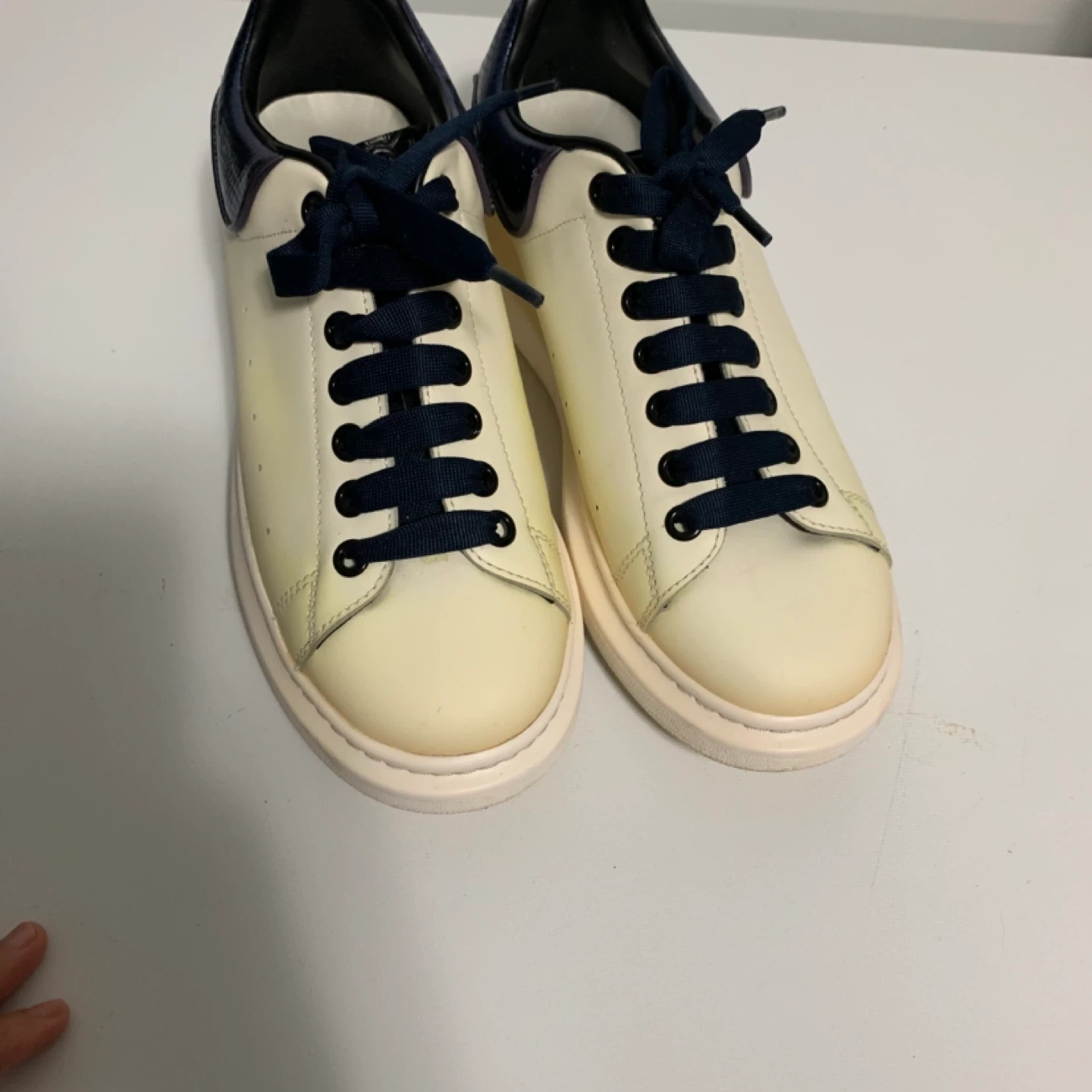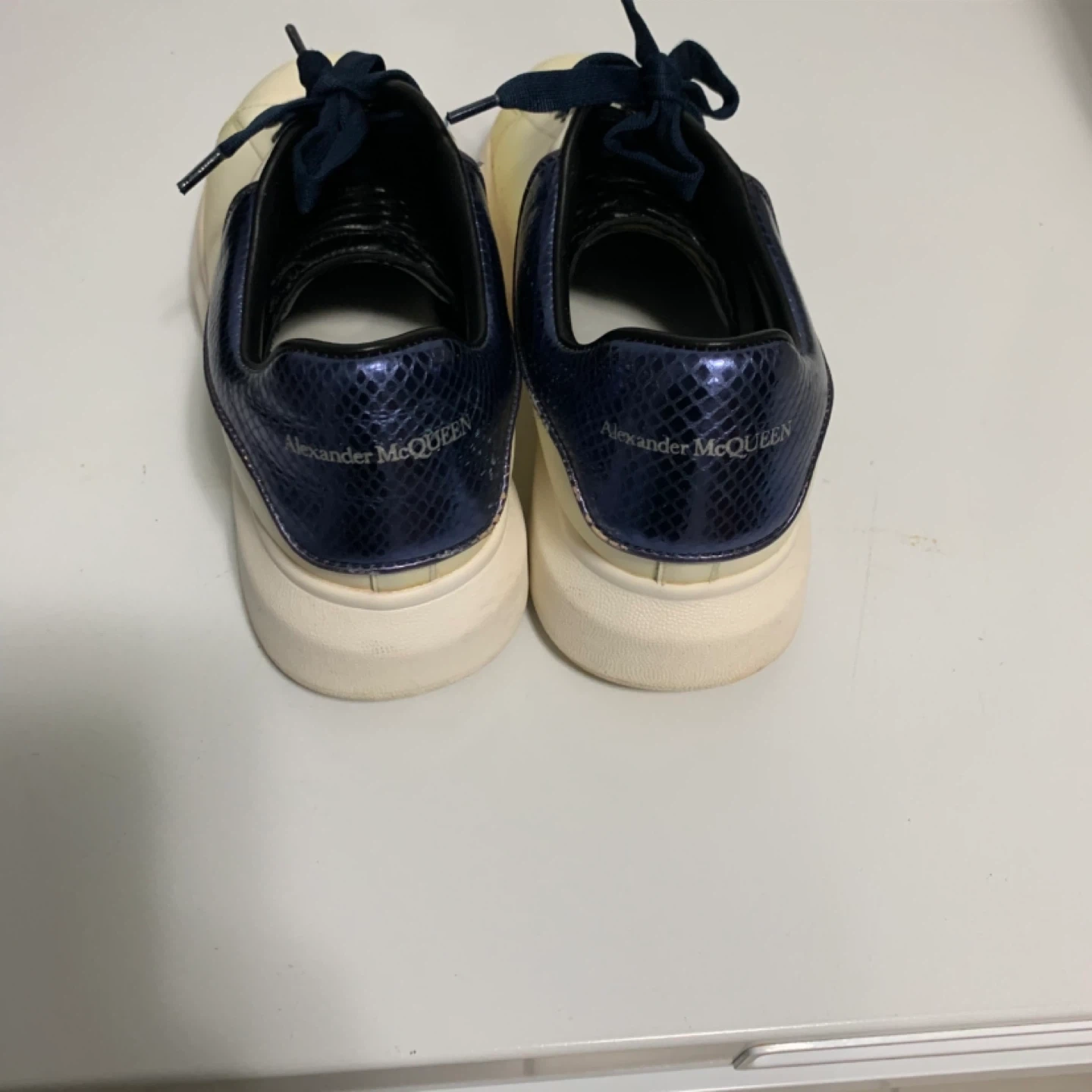 Selling a pair of Alexander McQueen sneakers in size 42. They show some signs of wear, especially on the soles, but still have lots of life left! The sneakers feature a unique blue snakeskin detail on the back. A stylish addition to any wardrobe!