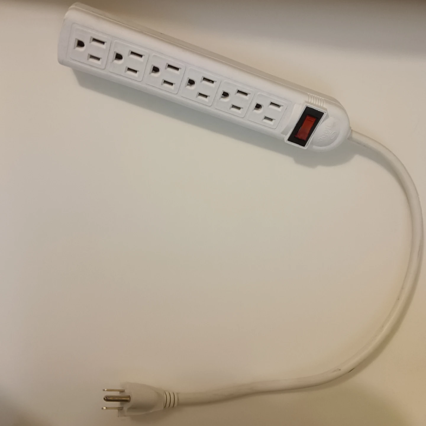 Selling a white power strip with 6 outlets. It has a red on/off switch and is in good condition. Perfect for adding extra outlets where you need them!