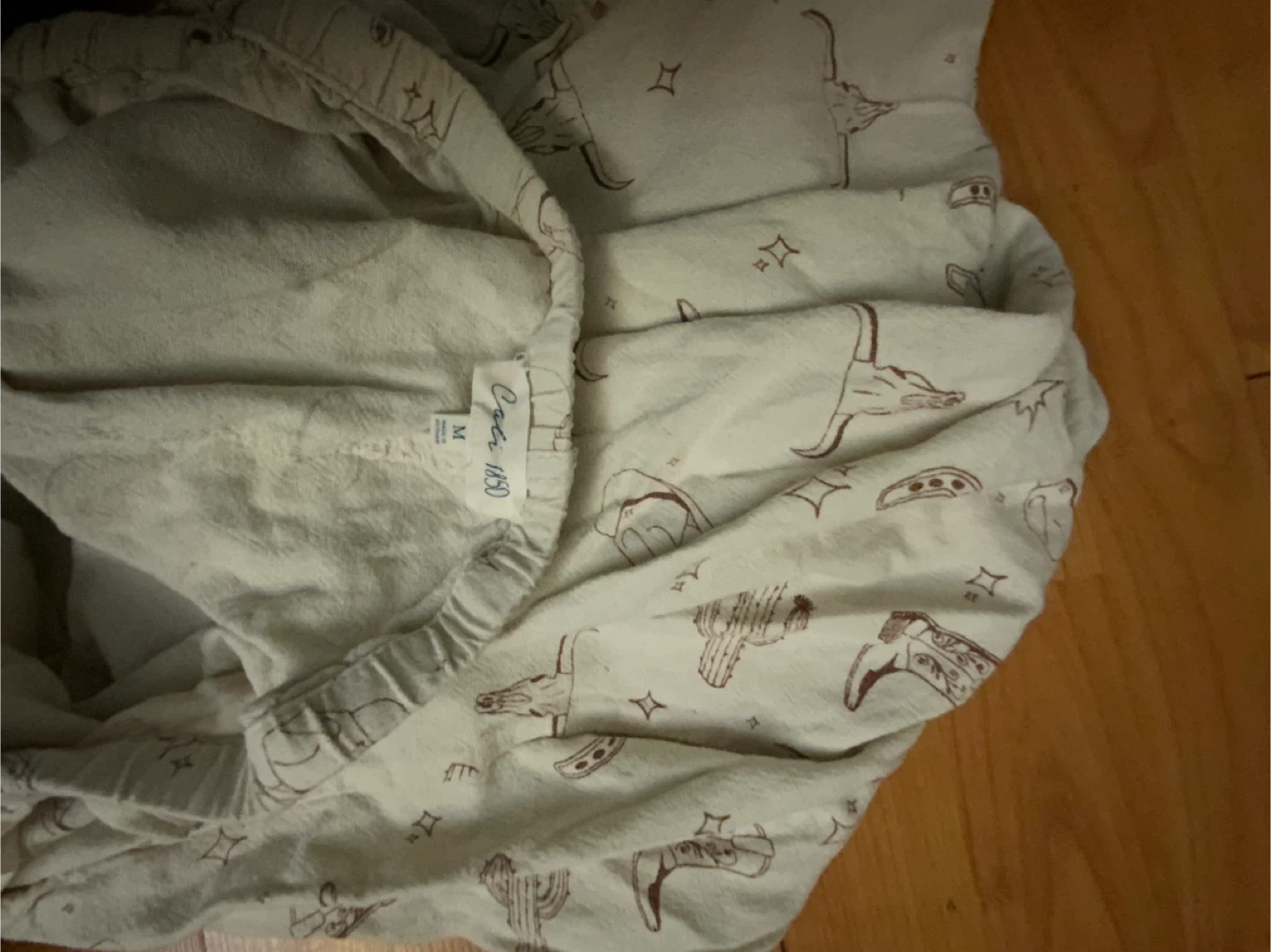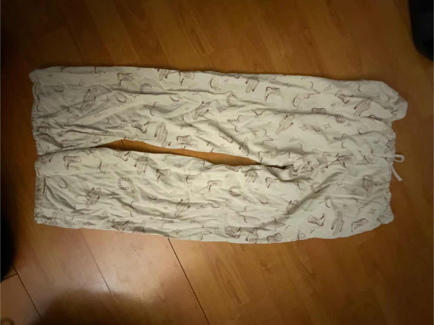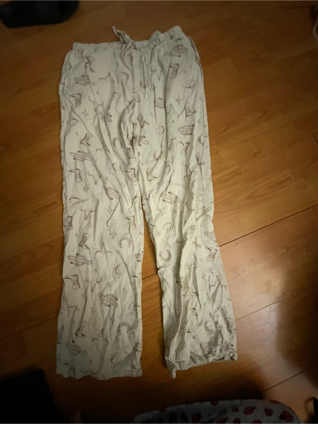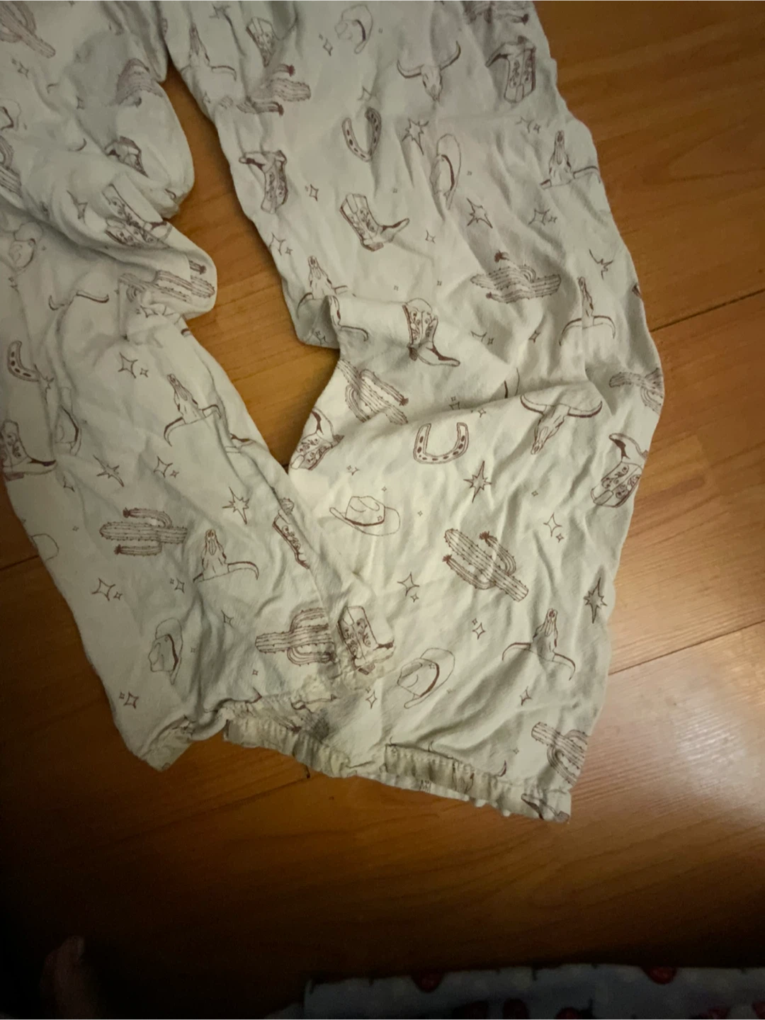 Cozy up with these Caza 1180 pajama pants! They feature a fun cowboy-themed pattern with cacti, cowboy boots, and horseshoes. These are a size medium and perfect for lounging around the house