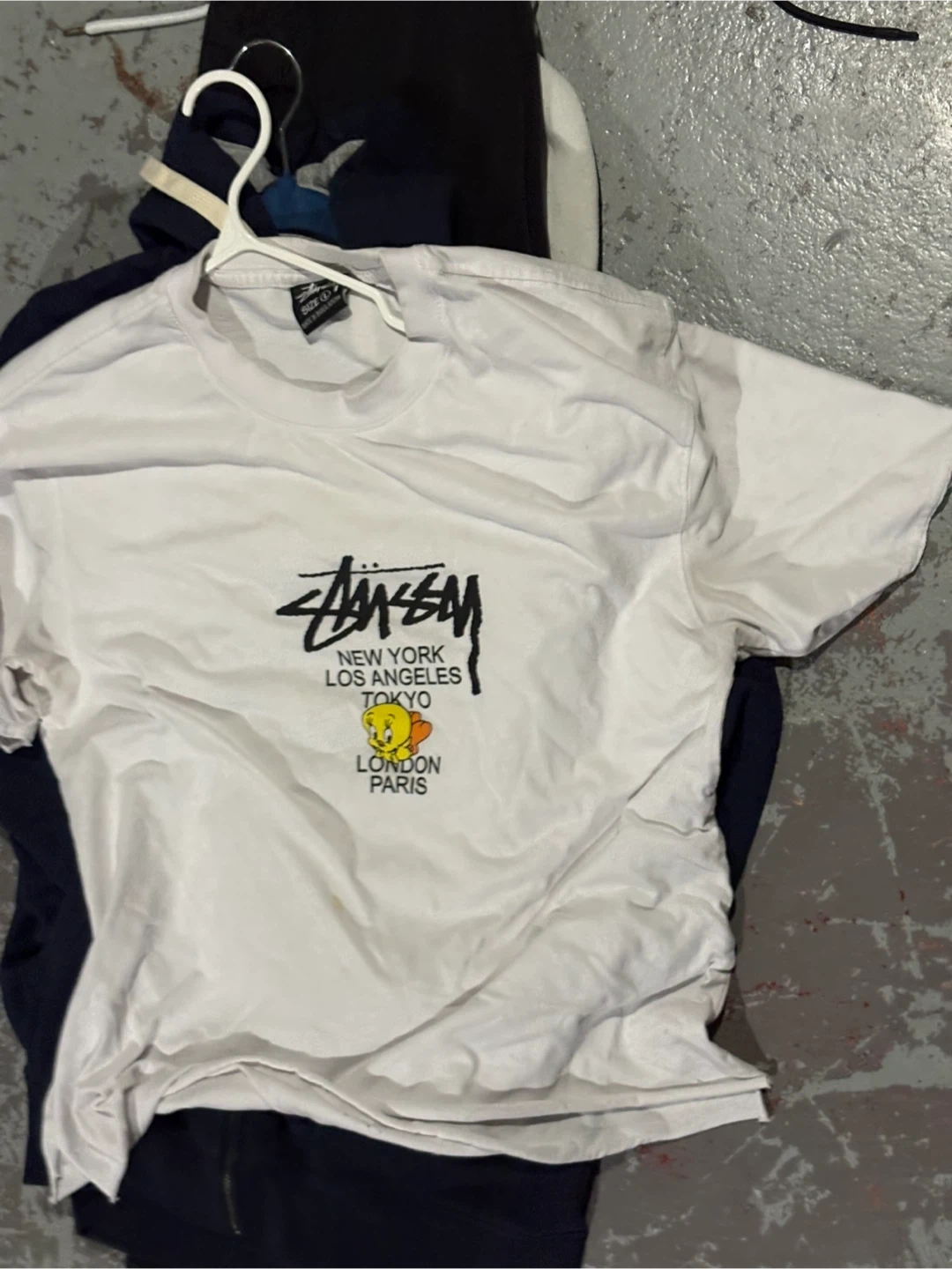 Selling a Stussy x Looney Tunes T-shirt in size large! It's a white tee with a fun graphic print featuring Sylvester and Tweety Bird. Perfect for any fan of the classic cartoon or streetwear!