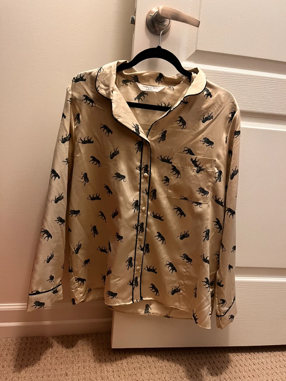 Selling a gently used Indigo Sky pajama top. It features a fun animal print on a beige background with black piping. Perfect for a cozy night in!
