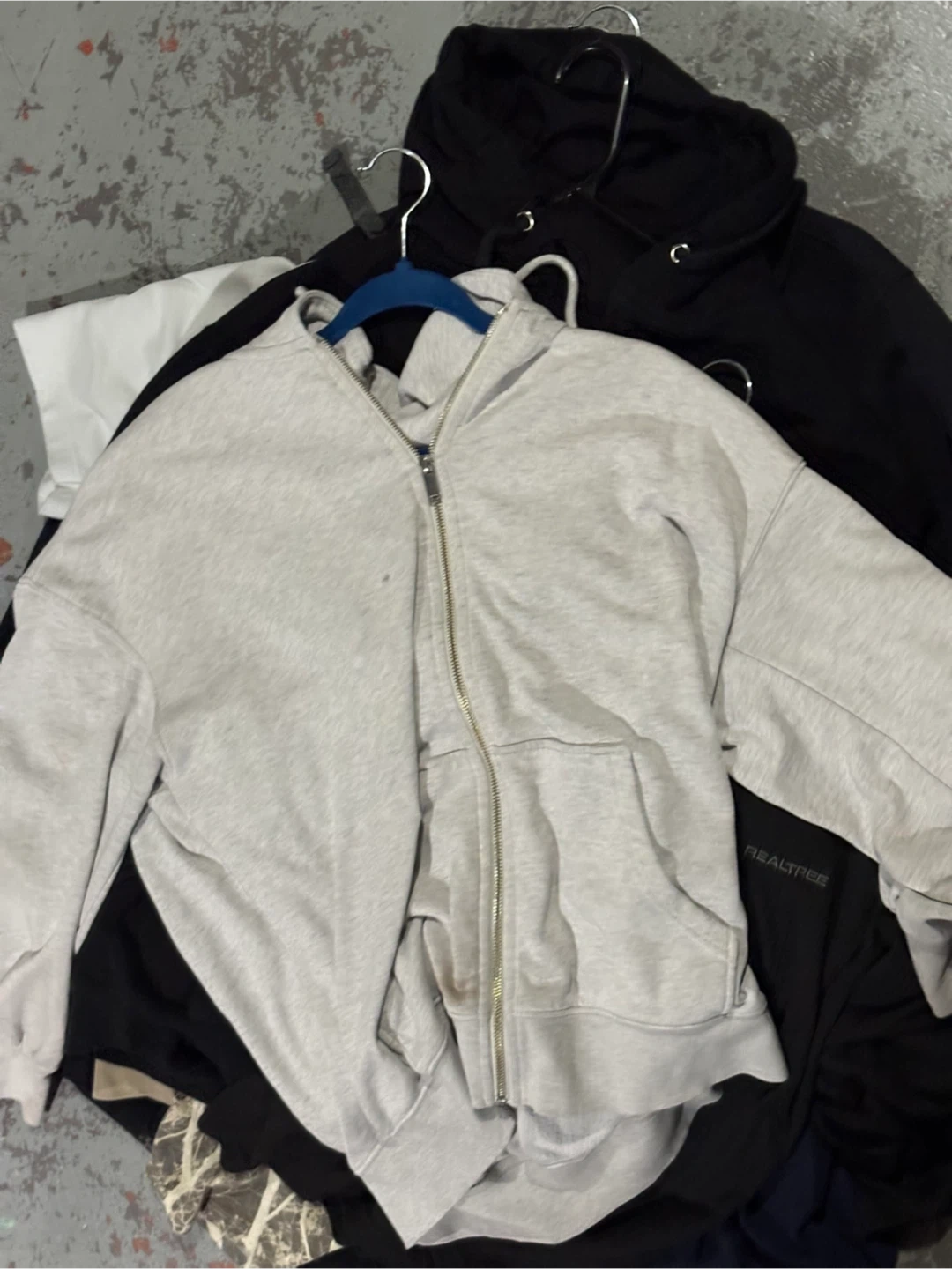Selling a grey zip-up hoodie. It has some staining on the front, as pictured. Perfect for layering or just lounging around the house!